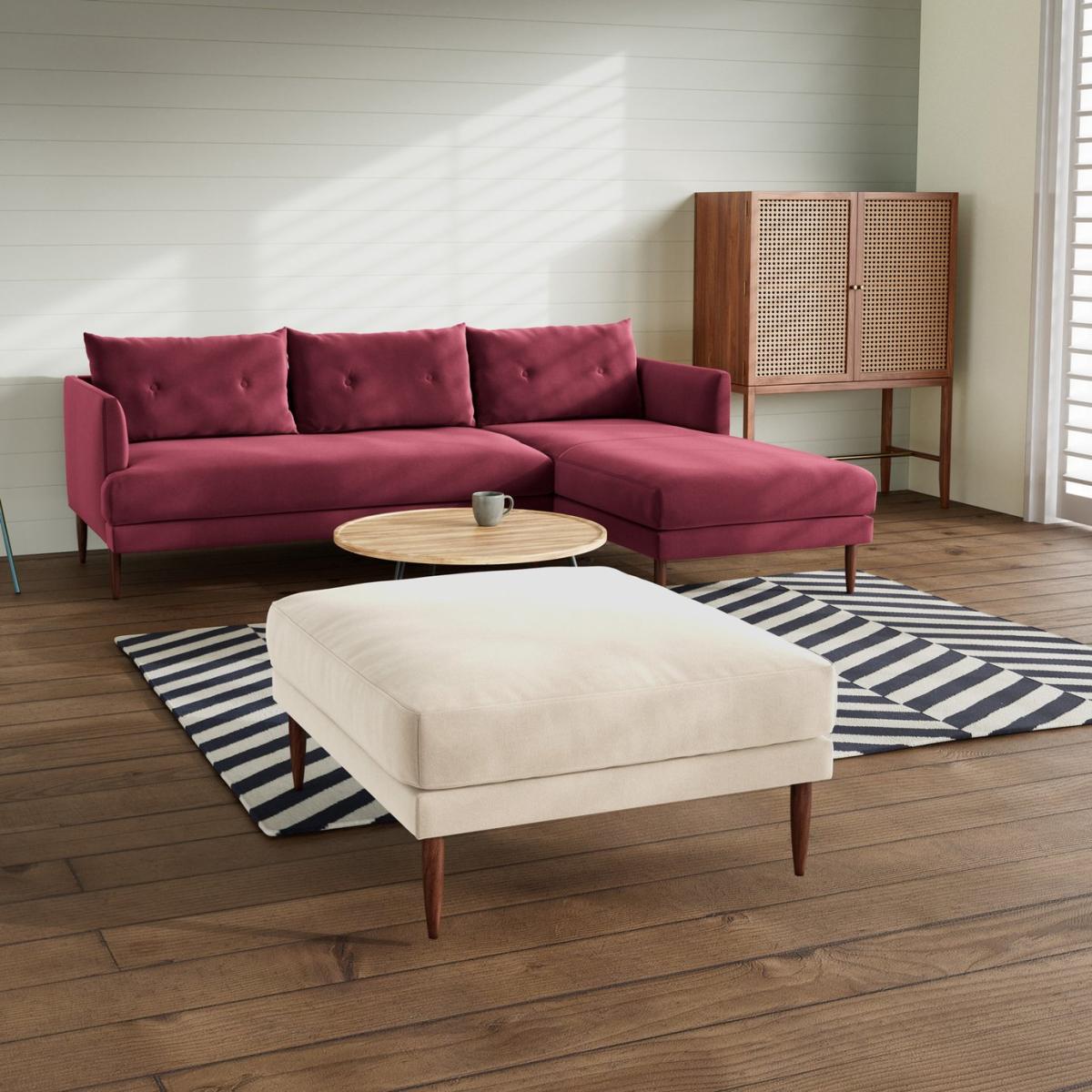 This ottoman's elegant Scandi shape is enjoying all the attention right now. A simple, comfortable partner to our Kalmar armchair and sofas - we're totally bowled over by them all. Prepare to relax. Want more? Have a look at designs from Swoon's Kalmar Scandi sofa range. See the collection of ottomans, armchairs, 2 and 3-seater couches and chaise corner sofas. Don't forget to order a free fabric swatch. Part of the Kalmar collection. Material: Made from 100% polyester. Wooden feet. Fixed cushion(s) with foam and fibre filling. Dimensions: Size H38, W82, D74cm. Weight: 14kg. General information: Professional clean only. Minimal assembly. Maximum individual user weight: 90kg. Manufacturer's 10 year frame guarantee. Packaged dimensions: Package size H43, W92, D92cm.