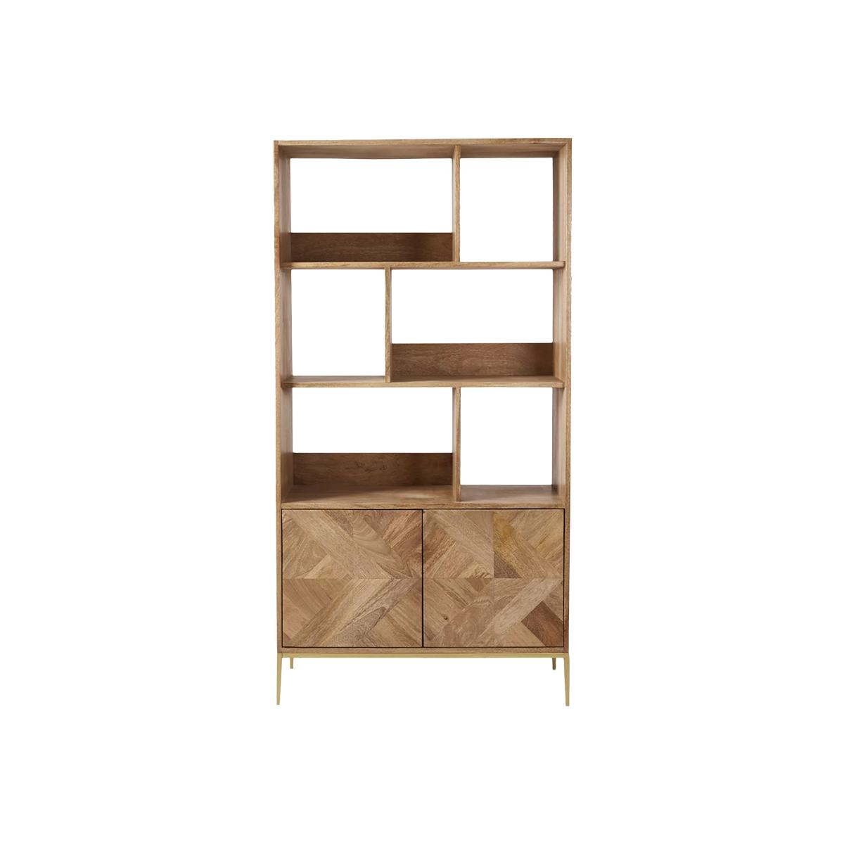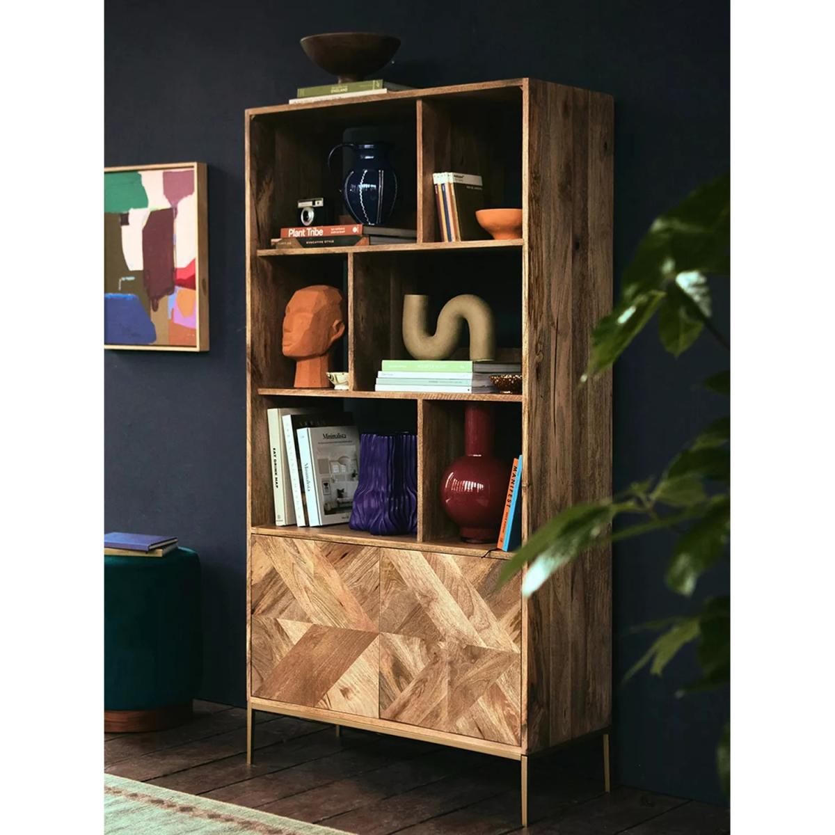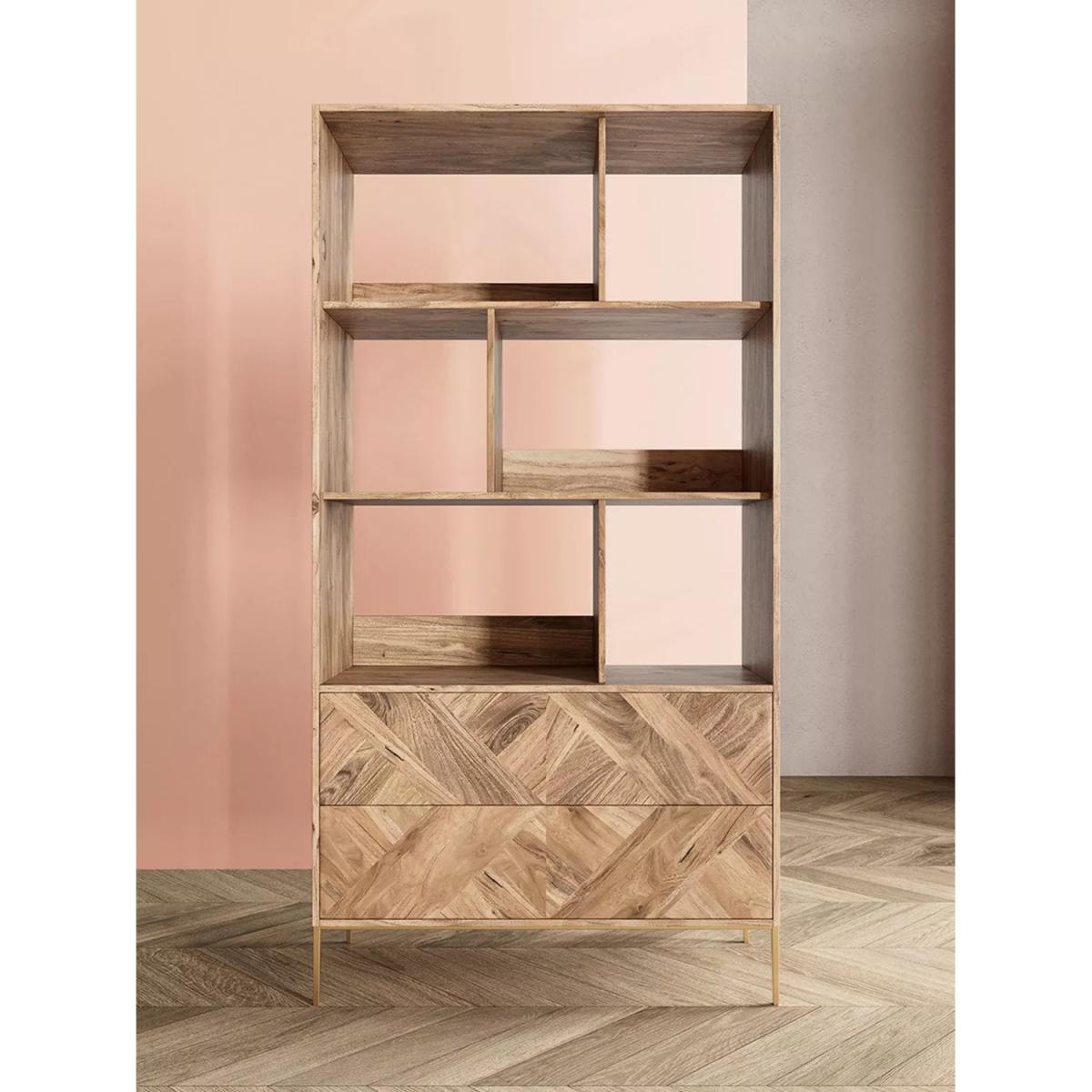 The natural oak-stained mango wood grain on this contemporary Norrebro bookshelf falls head first, into Swoon's "must-have materials" list for the mesmerising graphic patterning on its facade. Created with oscillating tiles of timber, the intriguing parquet zigzag is reflected by a subtle chamfer on its outer frame. Designs are made with natural materials and are handcrafted one at a time. There may be natural variations in colour and texture that are not product flaws, they make your design truly one-of-a-kind. Want to see it first? You may want to see and get a feel for the furniture in one of our shops before ordering. We'll be able to tell you where the range you'd like to view is on display.