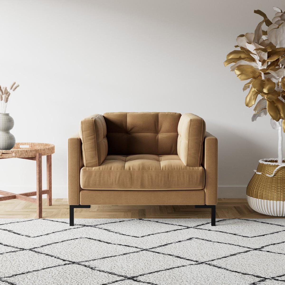 The Landau love seat is your partner in design, every fibre-topped cushion on its beautiful body stitched by hand over a period of days. A simple, low-slung frame paves way for such mid-century detailing to really shine, while a solo seat cushion means no more lost phones and a fewer crevices for runaway crumbs to escape into. Want more? Have a look at designs from Swoon's Landau Mid Century sofa range. See the collection of ottomans, armchairs, love seats, 2, 3 and 4-seater couches, chaise and corner sofas. Don't forget to order a free fabric swatch. Part of the Landau collection. Material: Made from 100% polyester. Metal feet. Fixed seat with foam and fibre filling. Fixed cushion(s) with foam and fibre filling. Dimensions: Size H79, W108, D92cm. Floor to seat height: 42cm. Depth of seat: 63cm. Height of seat back: 37cm. Width of seating area between arms: 48cm. Height of arm rest: 63cm. Weight: 35kg. Packaged dimensions: Package size H49, W110, D98cm. General information: Professional clean only. Plump cushions regularly to maintain shape. Self-assembly. Maximum individual user weight 90kg. Manufacturer's 10 year frame guarantee.