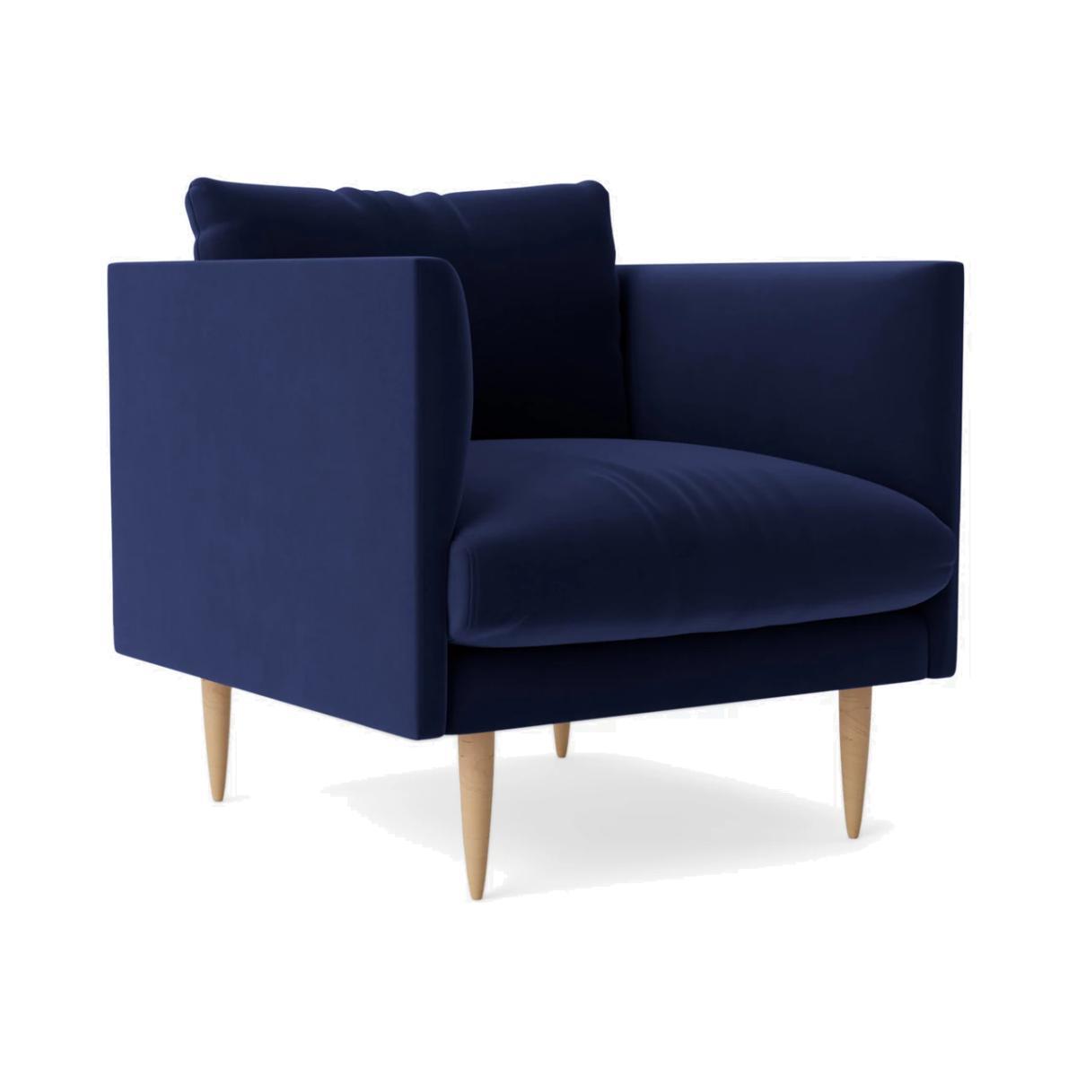This Swoon Luna armchair is a sleek, contemporary piece that works well in both modern and eclectic interiors. I love its clean lines and thoughtful proportions, which make it versatile enough to sit comfortably in living rooms, bedrooms, or cosy reading nooks. The light wooden legs add a natural touch, balancing the richer navy upholstery. For styling, I’d recommend pairing it with textured throws and cushions in contrasting or complementary colours to create a layered look. It’s also quite adaptable, so it can be a statement piece or blend seamlessly into a more neutral palette, making it an easy addition that elevates the space while remaining practical and stylish.