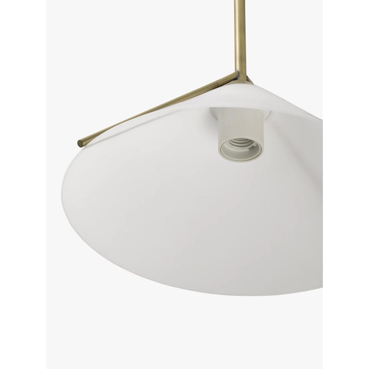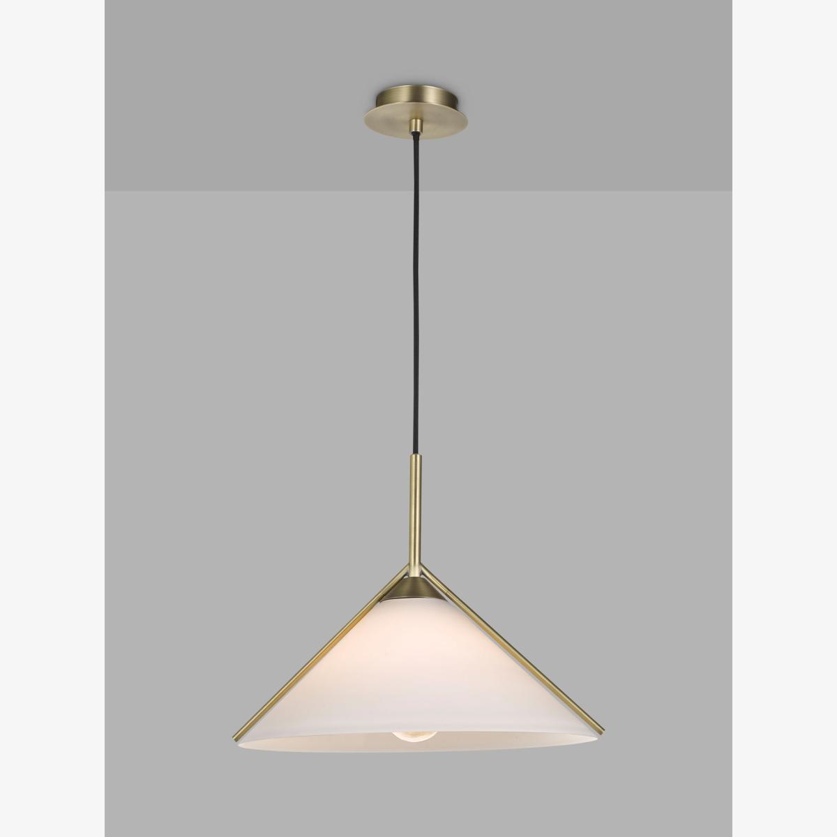 Swoon Mendel has a contemporary shallow cone shape, in beautiful matt opal white glass, with soft, matt gold metal accents and a smart black fabric cable. It would work well over a kitchen bar or dining table. It takes an ES bulb and will create a clean, bright light effect. The cable can be adjusted to your height requirements.