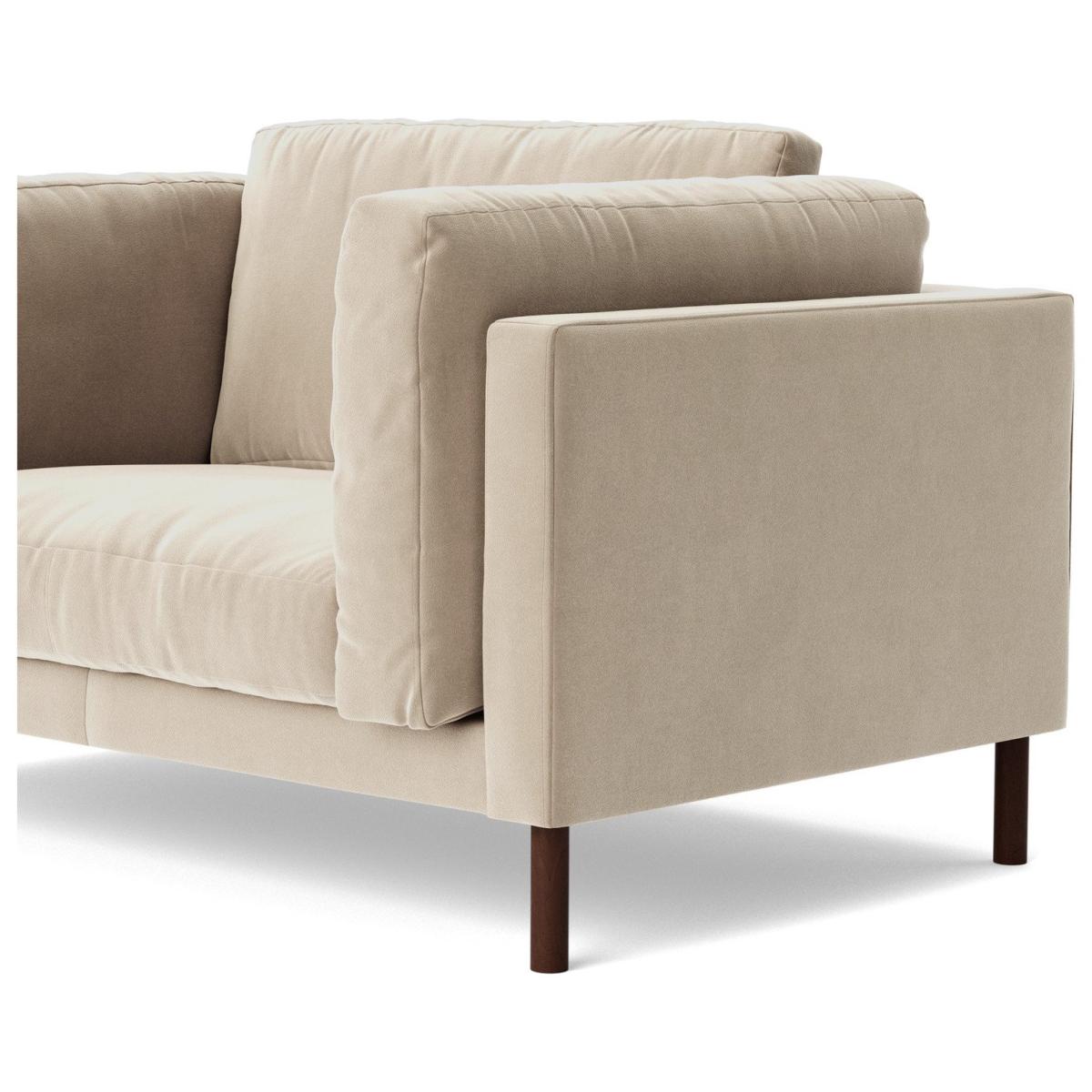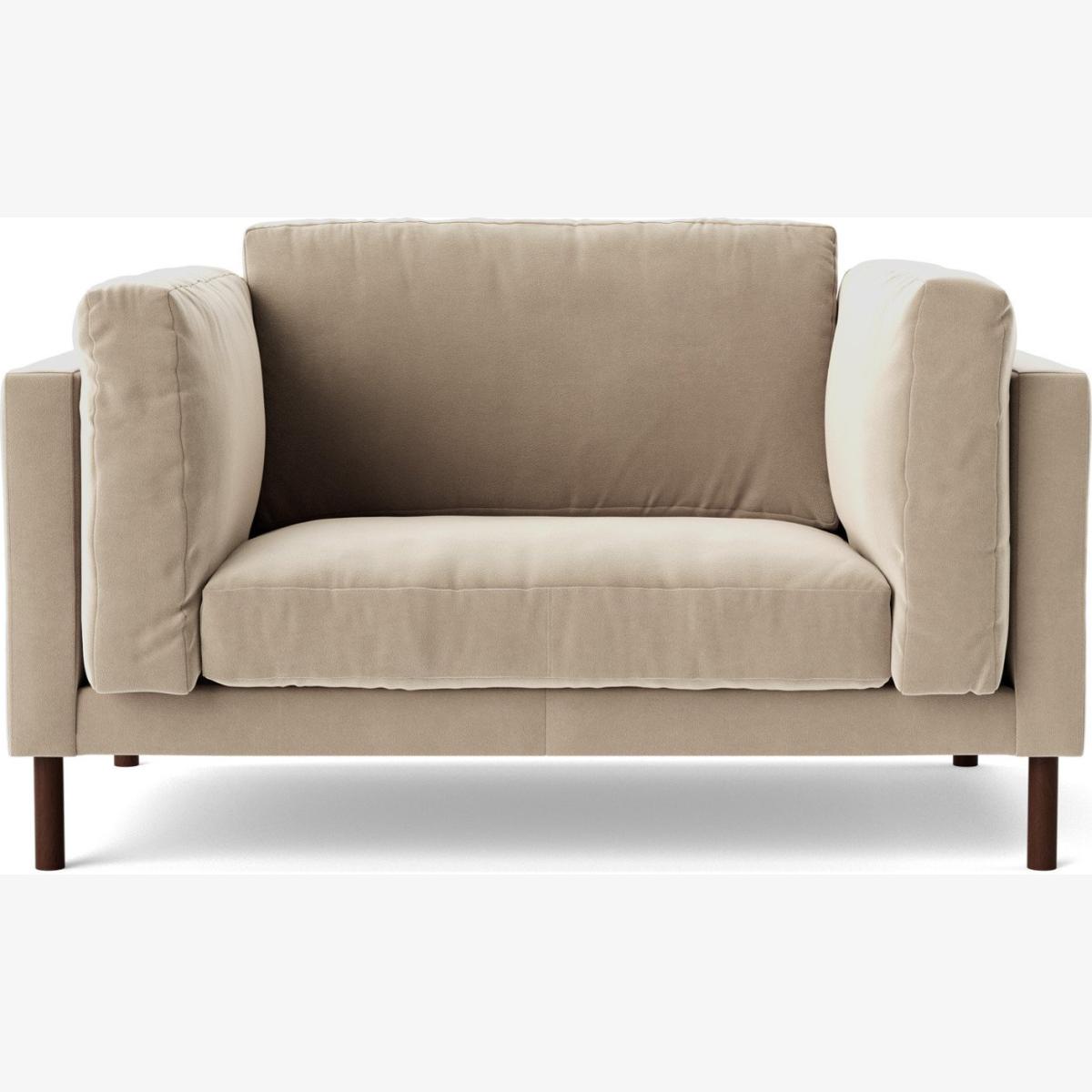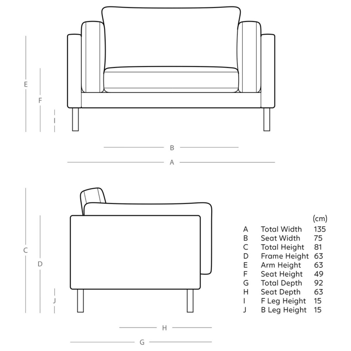 Sink into the Munich - a sleek, contemporary love seat. Effortlessly fusing pared-back style and sink-into comfort, this oversized armchair is perfect for modern design magpies that like to lounge. Seating two in the cosiest way or one with plenty of space to curl up, it's the ultimate lounging chair for the post-work unwind. Want more? Have a look at designs from Swoon's Munich Mid Century sofa range. See the collection of ottomans, armchairs, love seats, 2, 3 and 4-seater couches, chaise and corner sofas. Don't forget to order a free fabric swatch. Part of the Swoon Munich collection. Material: Made from 100% polyester. Wooden feet. Removable seat with foam and fibre filling. Dimensions: Size H81, W135, D92cm. Floor to seat height: 49cm. Depth of seat: 63cm. Height of seat back: 32cm. Width of seating area between arms: 75cm. Height of arm rest: 63cm. Weight: 32kg. Packaged dimensions: Package size H76, W118, D102cm. General information: Professional clean only. Plump cushions regularly to maintain shape. Self-assembly. Maximum individual user weight 180kg. Manufacturer's 10 year frame guarantee.