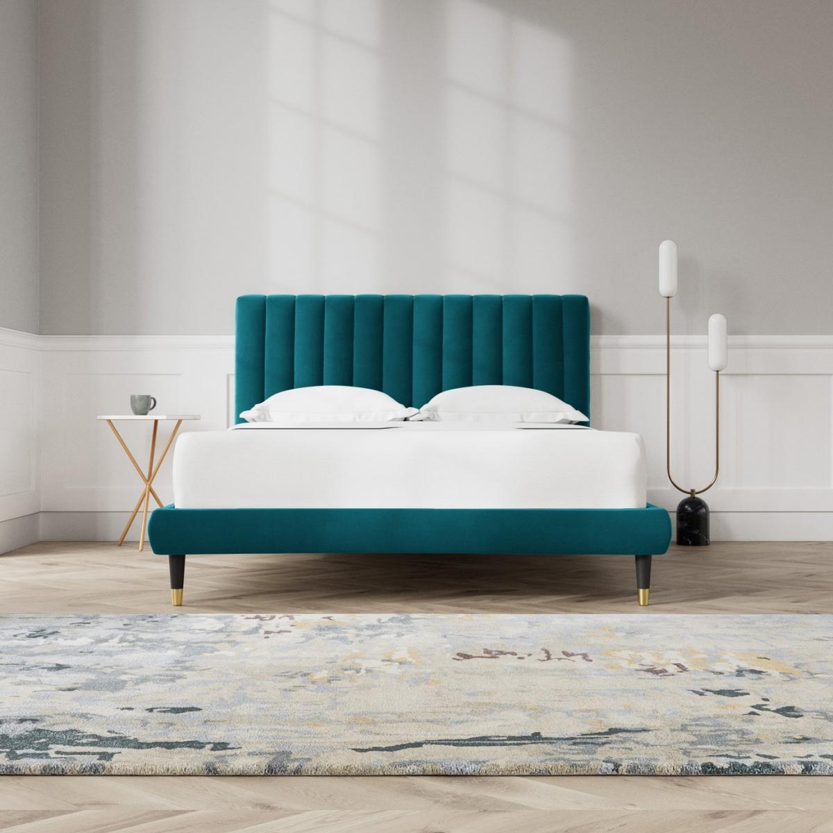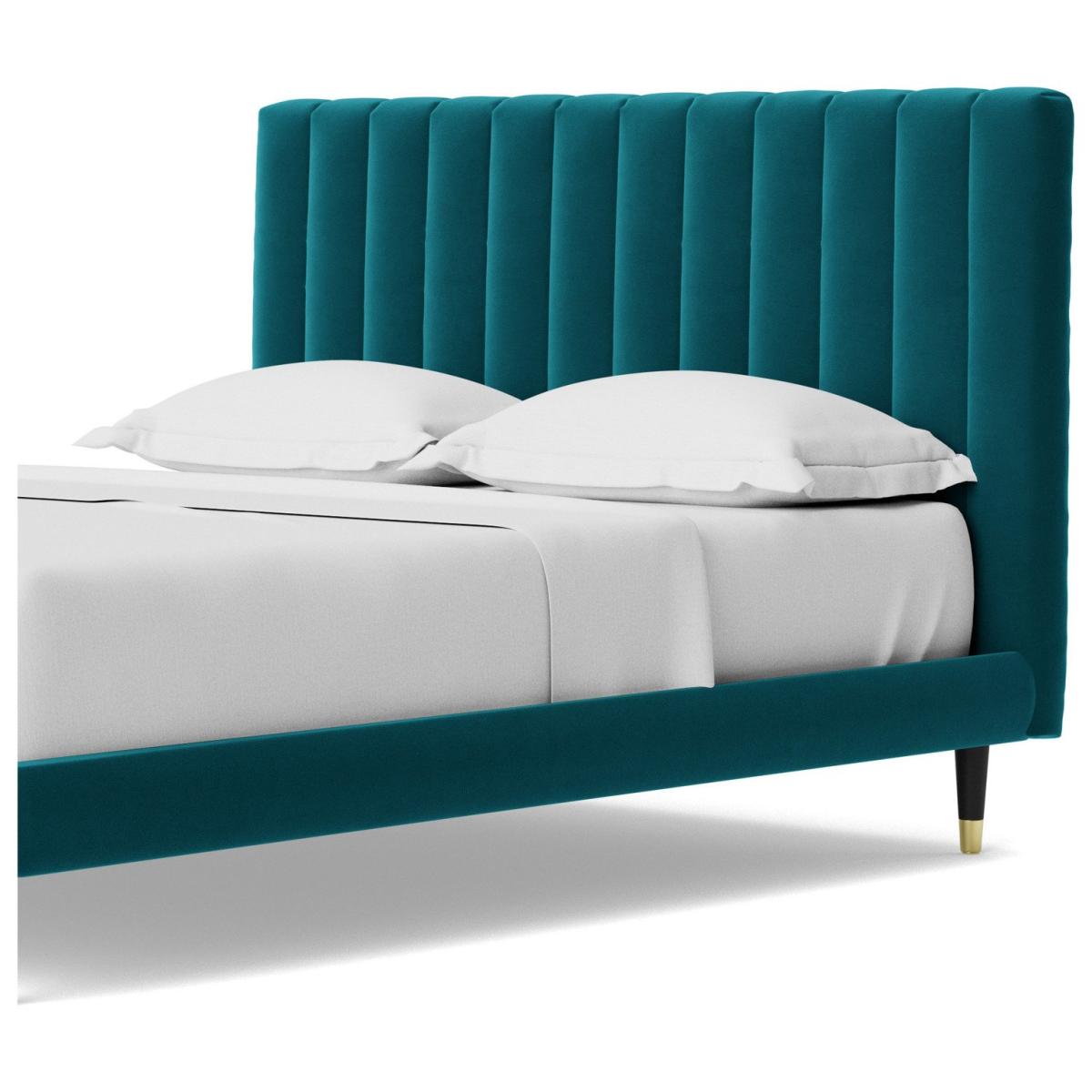 Sleek and polished, the Porlock speaks to those looking to inject some glamour into their bedrooms. An elegant, padded frame provides the perfect plinth for a mattress, while the pleated headboard oozes chic, deco class. Want more? Have a look at designs from Swoon's Porlock bespoke bed range. See the collection of bed frames and ottoman beds. Don't forget to order a free fabric swatch. Features beech plywood sprung slats. Our made to order furniture service means you can choose from different options, such as fabric, size and shape to create a beautiful bespoke piece of furniture. Because this piece is designed just for you, you might notice the delivery time is a little longer than usual. Luxurious and extra durable this deep pile velvet is sensually soft to the touch and doesn't mark or crease like traditional velvets. Part of the Porlock collection. Fabric frame. Easy velvet fabric - 100% polyester. Dark wood and brass feet. Base with sprung wooden slats. No storage. Size W162, L208, H108cm. Height to top of siderail 29cm. 17cm clearance between floor and underside of bed. Weight 60kg. Total maximum user weight 220kg. Self-assembly - 2 people recommended. Package Dimensions: Package 1 dimensions: H167.5, W95.5, D11cm. Package 1 weight: 20kg. Package 2 dimensions: H206.5, W43, D14cm. Package 2 weight: 40kg. General Information: Manufacturer's 1 year guarantee.