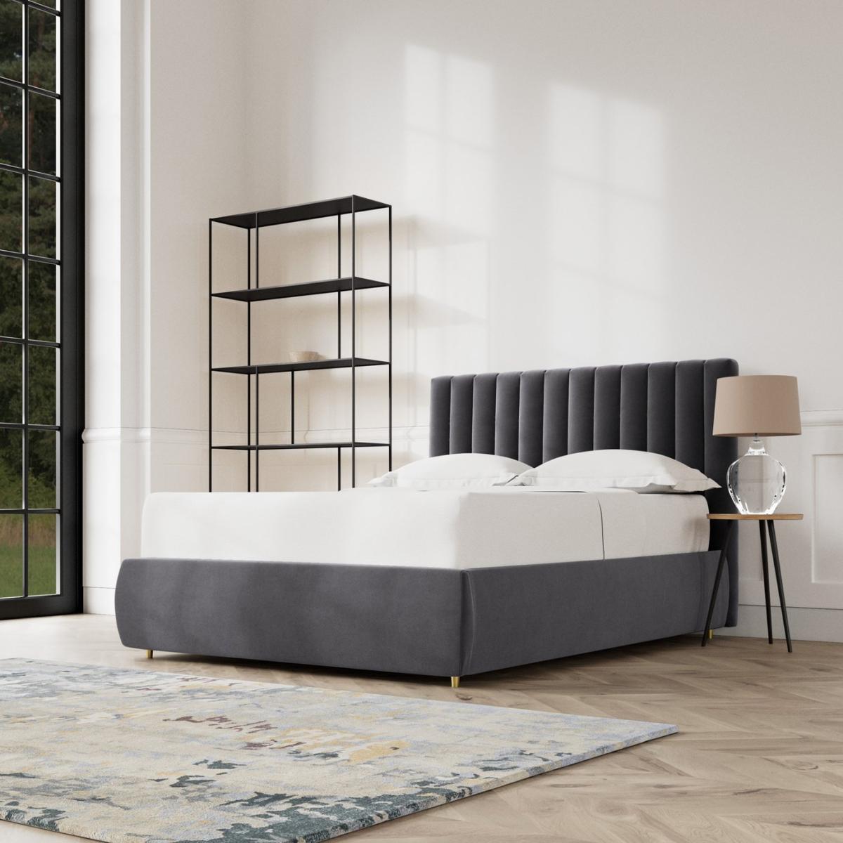 Sleek and polished, the Porlock speaks to those looking to inject some glamour into their bedrooms. It has an elegant, padded frame and a pleated headboard that oozes chic, deco class. And there's more. Lift up the end of the bed using its nifty mechanism to reveal loads of storage space underneath. Want more? Have a look at designs from Swoon's Porlock bespoke bed range. See the collection of bed frames and ottoman beds. Don't forget to order a free fabric swatch. Featuring beech frame and plywood sprung slats. Our made to order furniture service means you can choose from different options, such as fabric, size and shape to create a beautiful bespoke piece of furniture. Because this piece is designed just for you, you might notice the delivery time is a little longer than usual. Luxurious and extra durable this deep pile velvet is sensually soft to the touch and doesn't mark or crease like traditional velvets. Part of the Porlock collection. Fabric frame. Easy velvet fabric - 100 % polyester. Dark wood and brass feet. Base with sprung wooden slats. End lift. Ottoman: end opening. Storage capacity: 945 litres. Size W165, L215, H109.5cm. Height to top of siderail 29cm. 5cm clearance between floor underside of bed. Weight 84kg. Total maximum user weight 220kg. Self-assembly - 2 people recommended. Package Dimension: Package 1 dimension H14, W196, D26cm. Package 1 weight: 35kg. Package 2 dimensions: H38, W205, D19cm. Package 2 weight: 26kg. Package 3 dimension: H11, W165, D105cm. Package 3 weight: 23kg. General information: Manufacturer's 10 year frame guarantee.