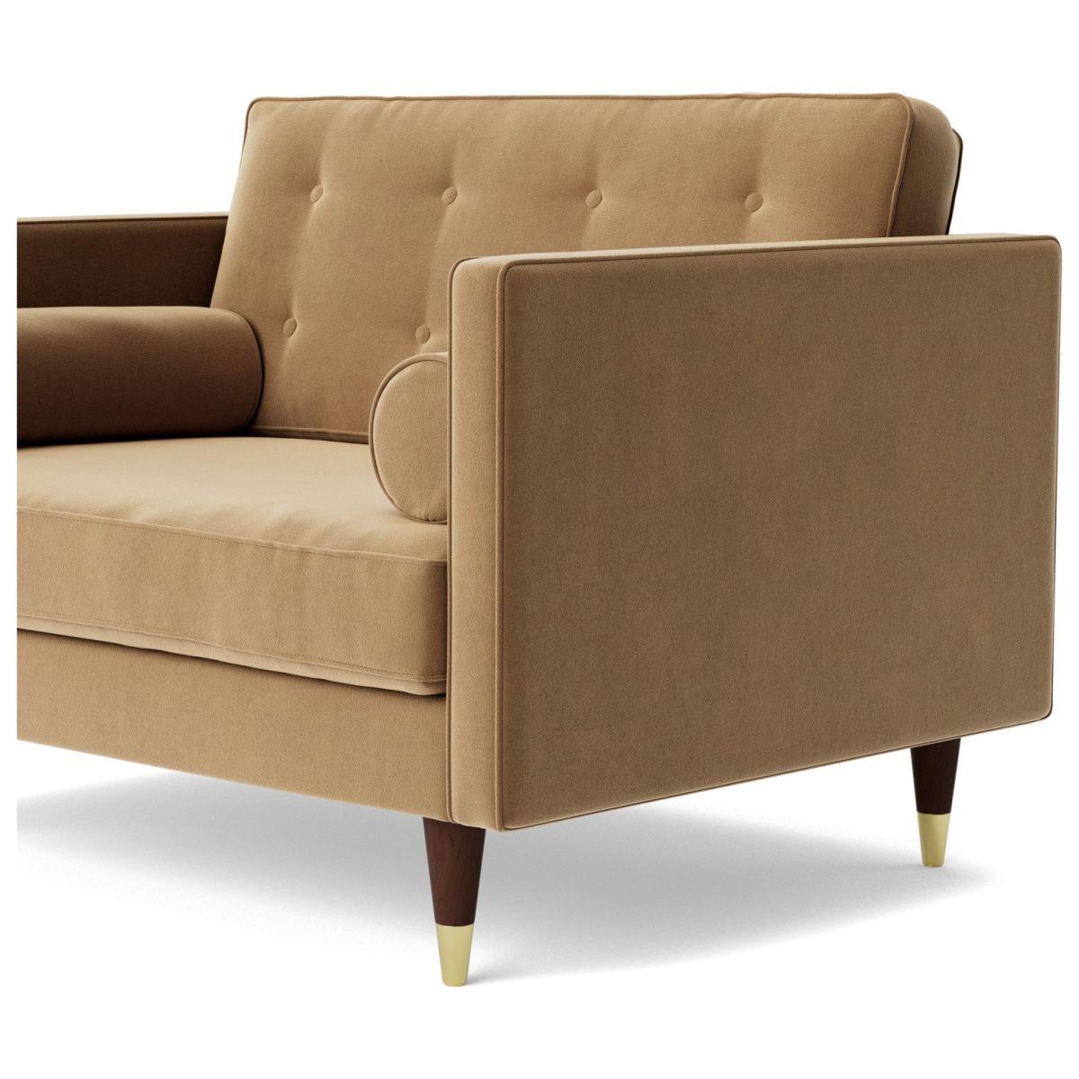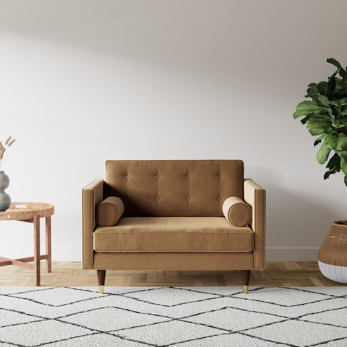We're constantly falling back in love with the love seat and this one really sweeps us off our feet. Button-backed, brass-capped and stacked full of character - we like the Porto. Inspired by the opulent casino lounge armchairs of 1950s Las Vegas, the bolster cushions are what define this Mid-Century piece. Want more? Have a look at designs from Swoon's Porto Mid Century sofa range. See the collection of armchairs, love seats, 2, 3 and 4-seater couches, chaise and corner sofas. Don't forget to order a free fabric swatch. Part of the Porto collection. Material: Made from 100% polyester. Wooden feet. Removable seat with foam and fibre filling. Removable cushion(s) with foam and fibre filling. Dimensions: Size H80, W114, D85cm. Floor to seat height: 42cm. Depth of seat: 60cm. Height of seat back: 36cm. Width of seating area between arms: 99cm. Height of arm rest: 63cm. Weight: 32kg. Packaged dimensions: Package size H55, W119, D90cm. General information: Professional clean only. Plump cushions regularly to maintain shape. Self-assembly. Maximum individual user weight 180kg. Manufacturer's 10 year frame guarantee.