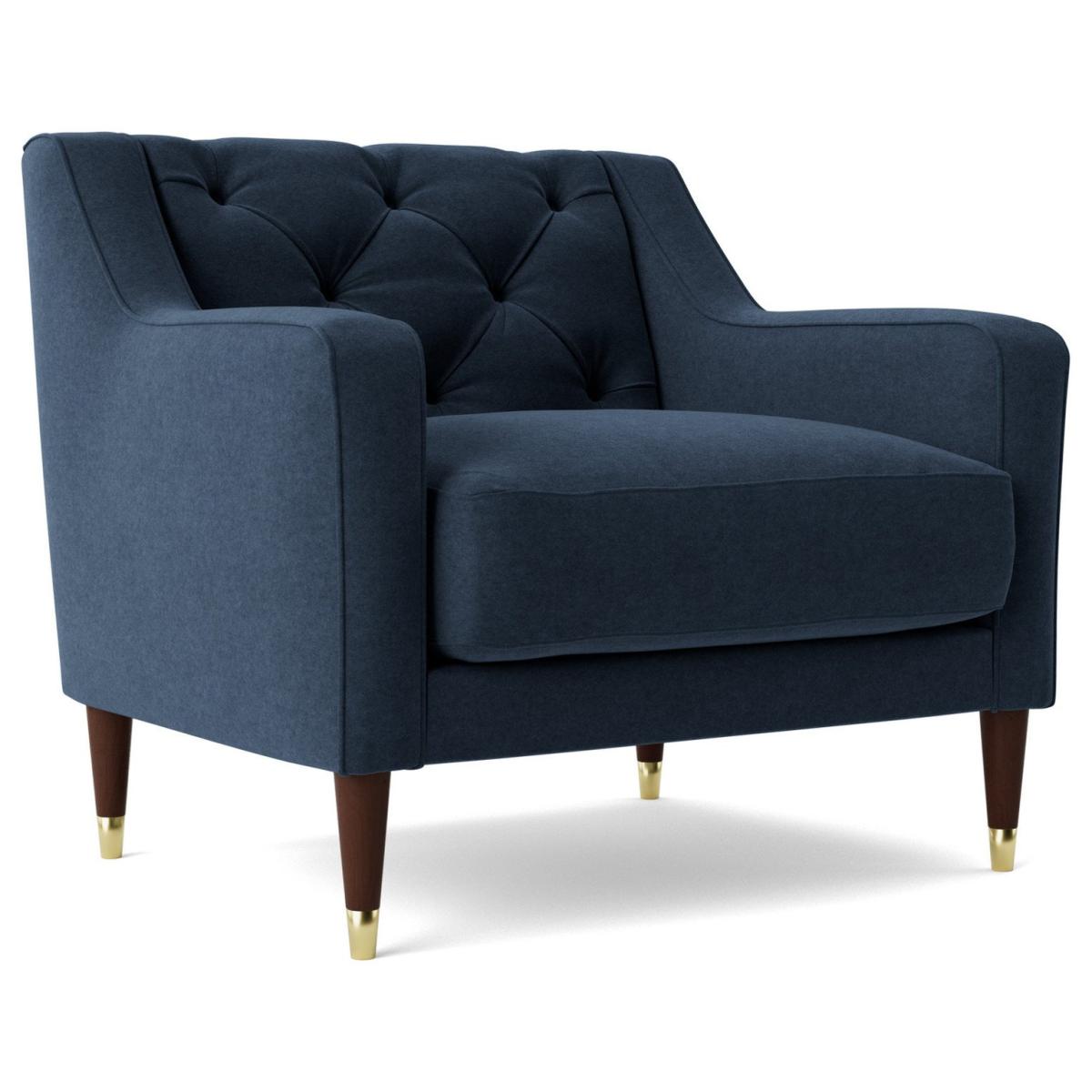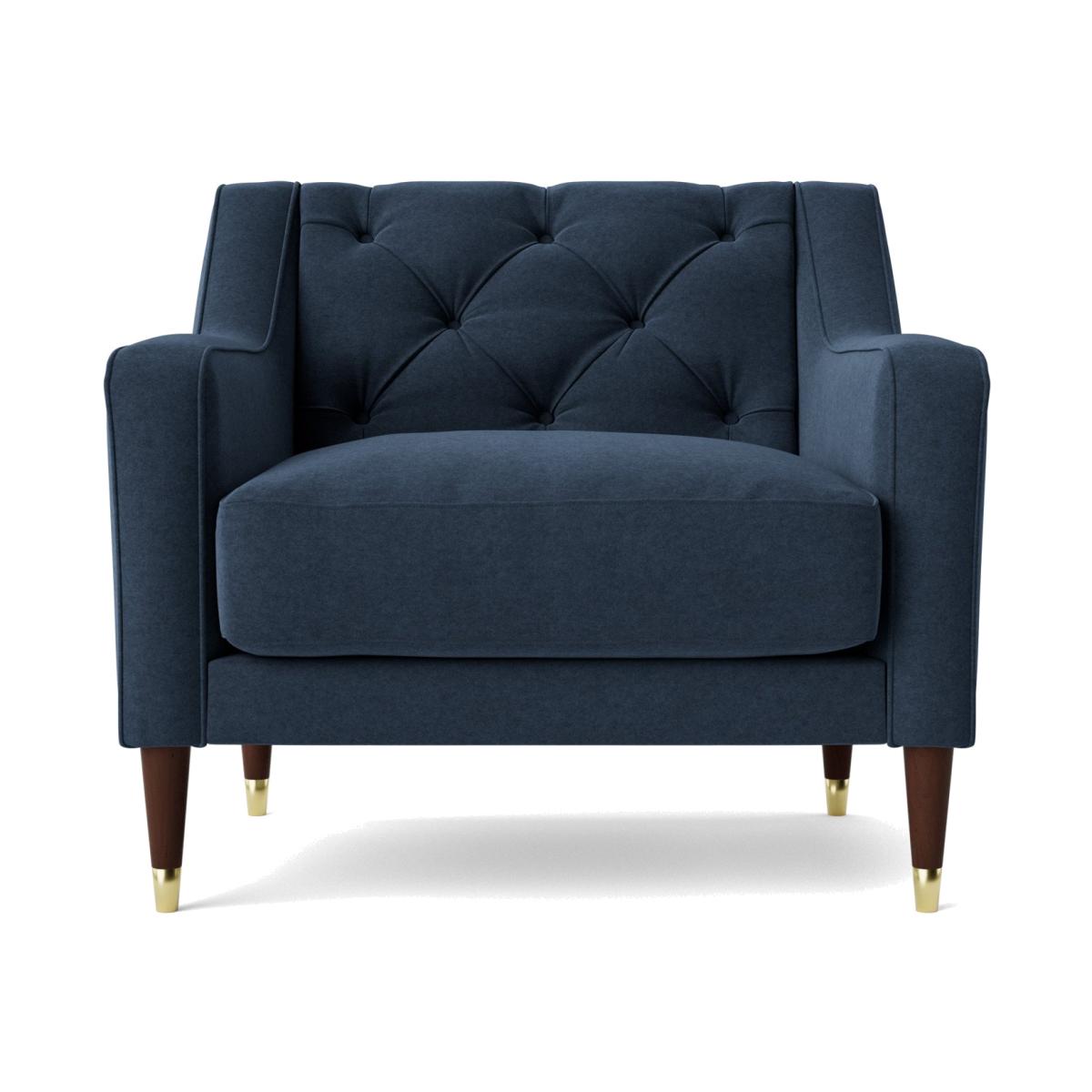 When creating the Pritchard, we combined all the best bits into one wonderfully retro, yet luxuriously traditional chair. Classic, British-style deep buttoning on a firm back creates an arty contrast with modern, brass-capped legs and vintage-inspired flat arms which themselves differ with one another. It's all topped off with foam and wadding in the seat to give the perfect comfort level. A happy medium with a spring in its step. Want more? Have a look at designs from Swoon's Pritchard Plush sofa range. See the collection of armchairs, 2 and 3-seater. Don't forget to order a free fabric swatch. Part of the Pritchard collection. Material: Made from 100% polyester. Removable seat with foam and fibre filling. Dimensions: Size H78, W78, D80cm. Floor to seat height: 44cm. Depth of seat: 58cm. Height of seat back: 34cm. Width of seating area between arms: 63cm. Height of arm rest: 57cm. Weight: 30kg. Packaged dimensions: Package size H66, W81, D85cm. General information: Professional clean only. Plump cushions regularly to maintain shape. Self-assembly. Maximum individual user weight 90kg. Manufacturer's 10 year frame guarantee.