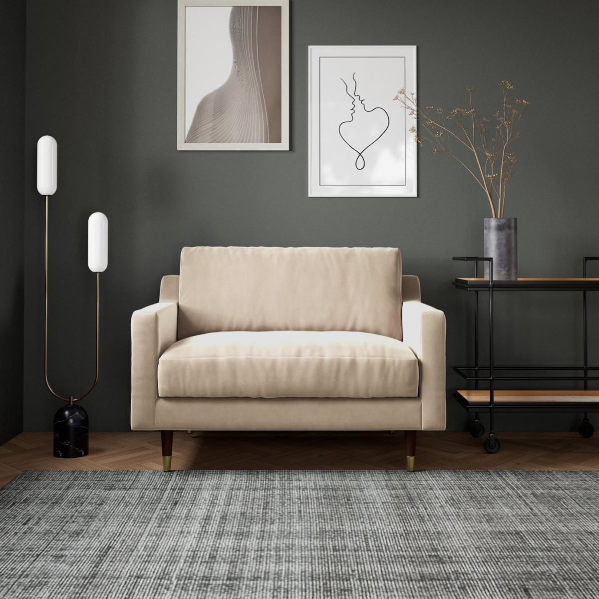 I love this cosy little loveseat for its versatility and understated style. The taupe velvet adds a touch of softness and luxury, making it perfect for both modern and vintage-inspired interiors. It works well in compact spaces or as an accent piece in a larger living area, offering a practical spot for relaxing or reading. To style it effectively, consider pairing it with neutral or patterned cushions to add visual interest, and keep surrounding decor minimal for a sleek look. Its neutral tone means it pairs effortlessly with a wide colour palette, whether bold or muted, making it a flexible choice for evolving interiors.