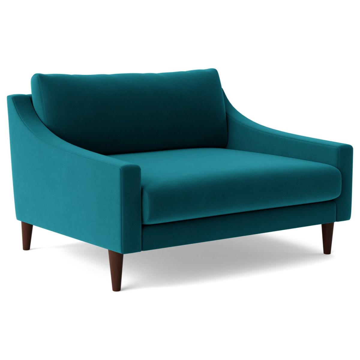 Our designer's take on a classic mid-century shape, the Turin invites you to relax with its sloped arms and seat. Sleek tapered legs and a minimal shape give it an elegant look, while the cushions and seat make it as comfortable as it is stylish. Want more? Have a look at designs from Swoon's Turin Classic sofa range. See the collection of ottomans, armchairs, love seats, 2, 3 and 4-seater couches, chaise corner sofas. Don't forget to order a free fabric swatch. Part of the Turin collection. Material: Made from 100% polyester. Wooden feet. Removable seat with foam and fibre filling. Dimensions: Size H75, W106, D93cm. Floor to seat height: 44cm. Depth of seat: 63cm. Height of seat back: 31cm. Width of seating area between arms: 90cm. Height of arm rest: 50cm. Weight: 27kg. Packaged dimensions: Package size H97, W62, D110cm. General information: Professional clean only. Plump cushions regularly to maintain shape. Self-assembly. Maximum individual user weight 180kg. Manufacturer's 10 year frame guarantee.