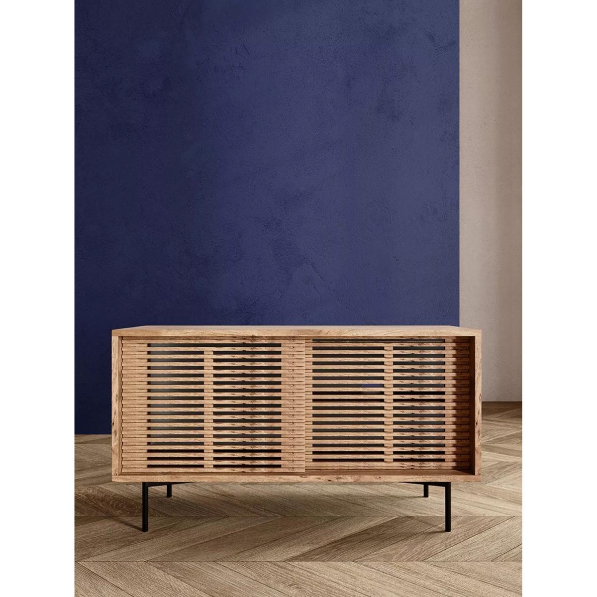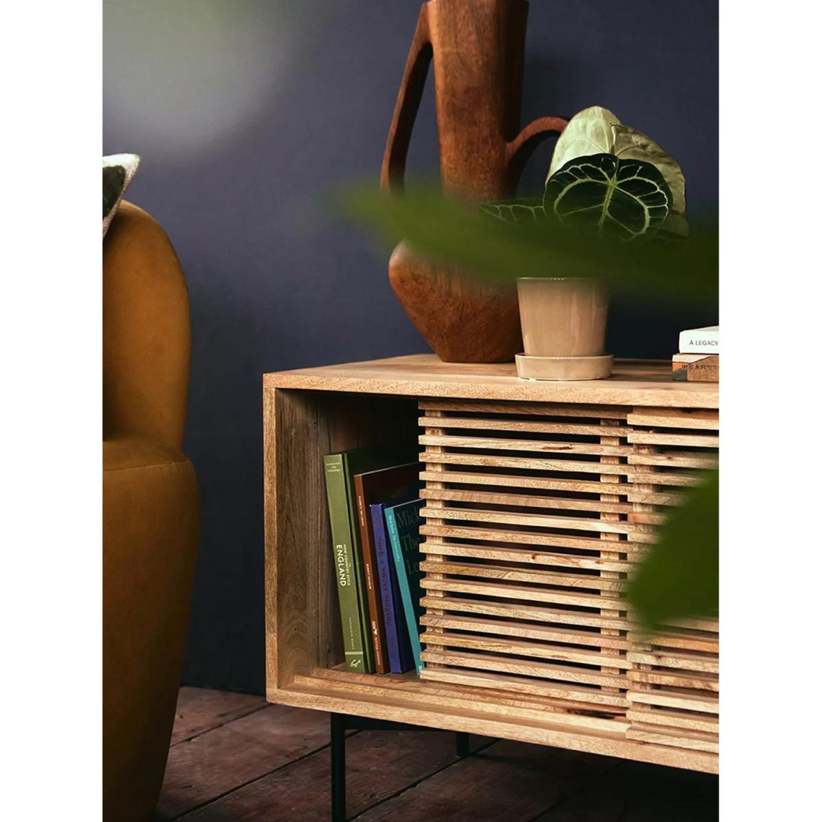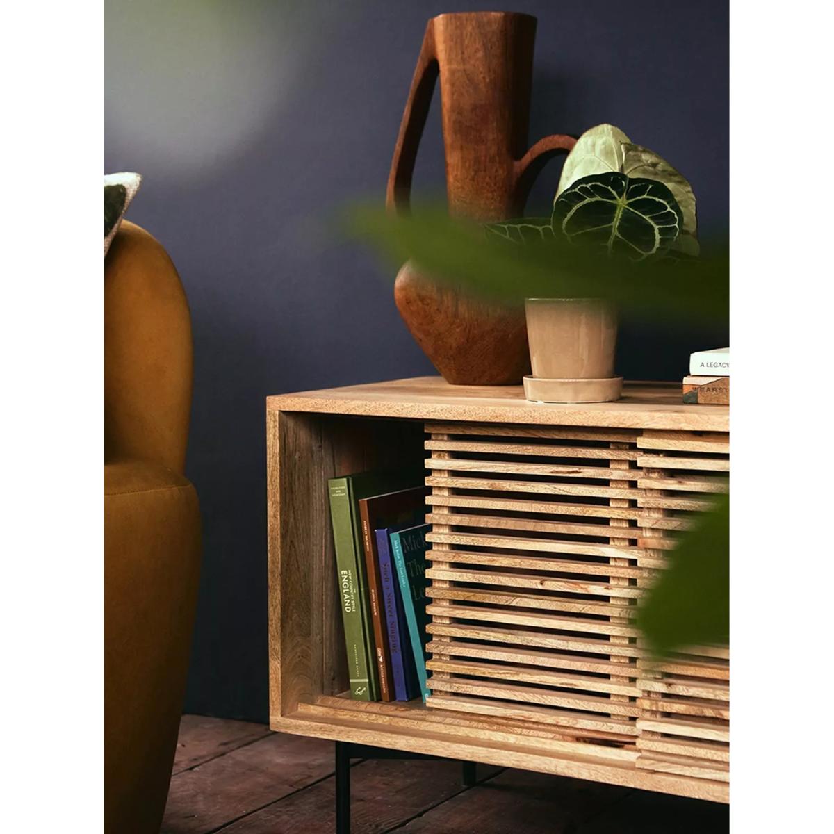 I’m a fan of this petite media unit for its clean lines and warm oak slatted front - it brings texture without feeling heavy. Its slim metal legs lift the design, keeping a space feeling open, so it works brilliantly in smaller living rooms, Scandi-inspired or modern coastal schemes. Styling tip: keep the top uncluttered with just a slim TV, a low vase or two and perhaps a small stack of art books. Behind the doors, hide consoles, remotes or cables in woven baskets to maintain that calm, pared-back look. Add a simple indoor plant beside it to introduce a touch of greenery and tie everything together.