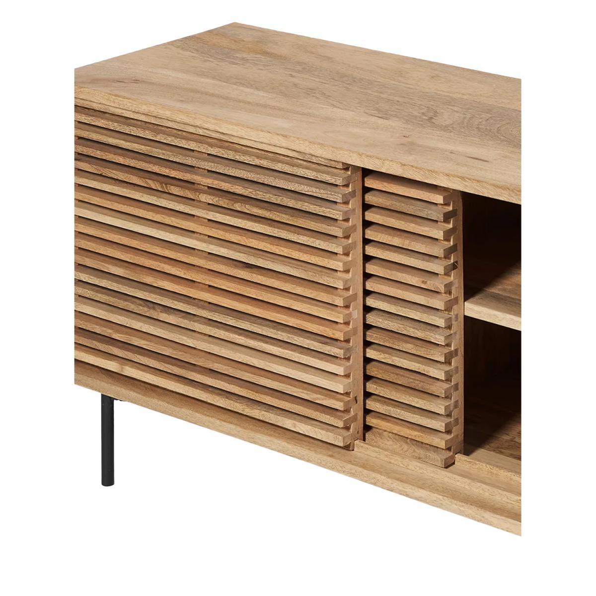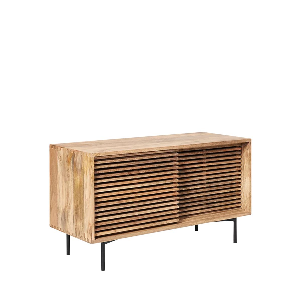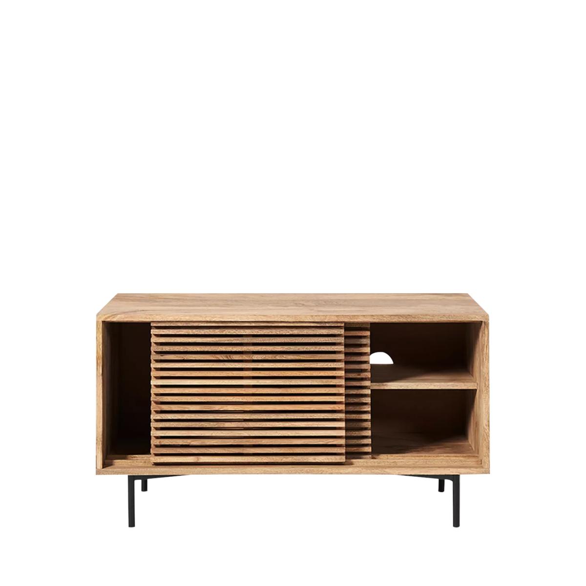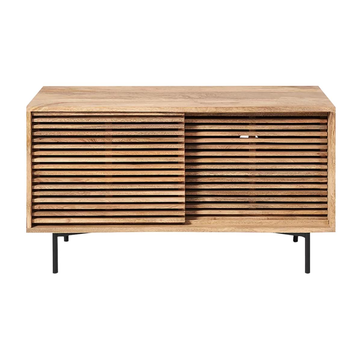 I’m a fan of this petite media unit for its clean lines and warm oak slatted front - it brings texture without feeling heavy. Its slim metal legs lift the design, keeping a space feeling open, so it works brilliantly in smaller living rooms, Scandi-inspired or modern coastal schemes. Styling tip: keep the top uncluttered with just a slim TV, a low vase or two and perhaps a small stack of art books. Behind the doors, hide consoles, remotes or cables in woven baskets to maintain that calm, pared-back look. Add a simple indoor plant beside it to introduce a touch of greenery and tie everything together.