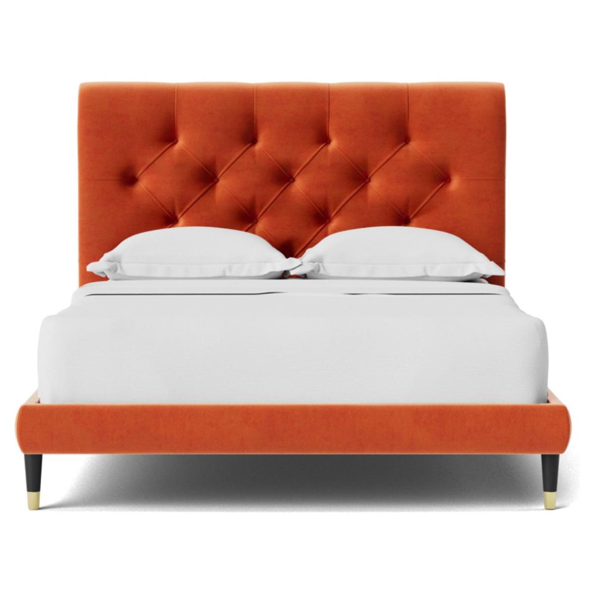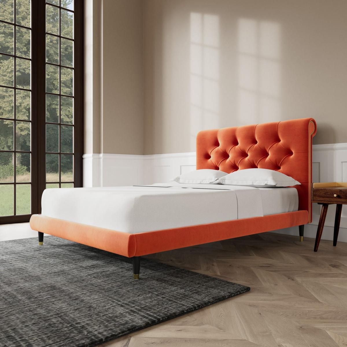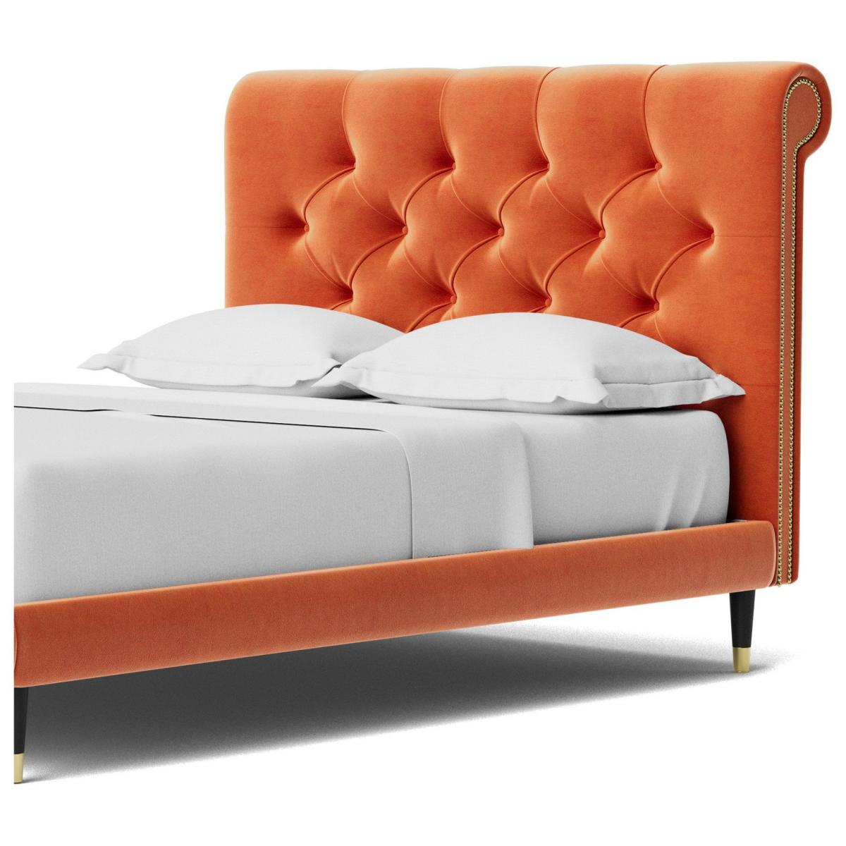 Oozing classic character, the Winston celebrates Chesterfield style in flamboyant fashion. A slim, padded frame proves the perfect plinth for a mattress. But the headboard is where the real party is. Want more? Have a look at designs from Swoon's Winston bespoke bed range. See the collection of bed frames and ottoman beds. Don't forget to order a free fabric swatch. Features beech plywood sprung slats. Our made to order furniture service means you can choose from different options, such as fabric, size and shape to create a beautiful bespoke piece of furniture. Because this piece is designed just for you, you might notice the delivery time is a little longer than usual. Luxurious and extra durable this deep pile velvet is sensually soft to the touch and doesn't mark or crease like traditional velvets. Part of the Winston collection. Fabric frame. Easy velvet fabric - 100% polyester. Dark wood and brass feet. Base with sprung wooden slats. No storage. Size W148, L205.5, H109cm. Height to top of siderail 29cm. 5cm clearance between floor and underside of bed. Weight 55kg. Total maximum user weight 220kg. Self-assembly - 2 people recommended. Package Dimensions: Package 1 dimensions: H21, W152, D93cm. Package 1 weight: 19.5kg. Package 2 dimensions: H14, W196.5, D43cm. Package 2 weight: 35.5kg. General Information: Manufacturer's 1 year guarantee.