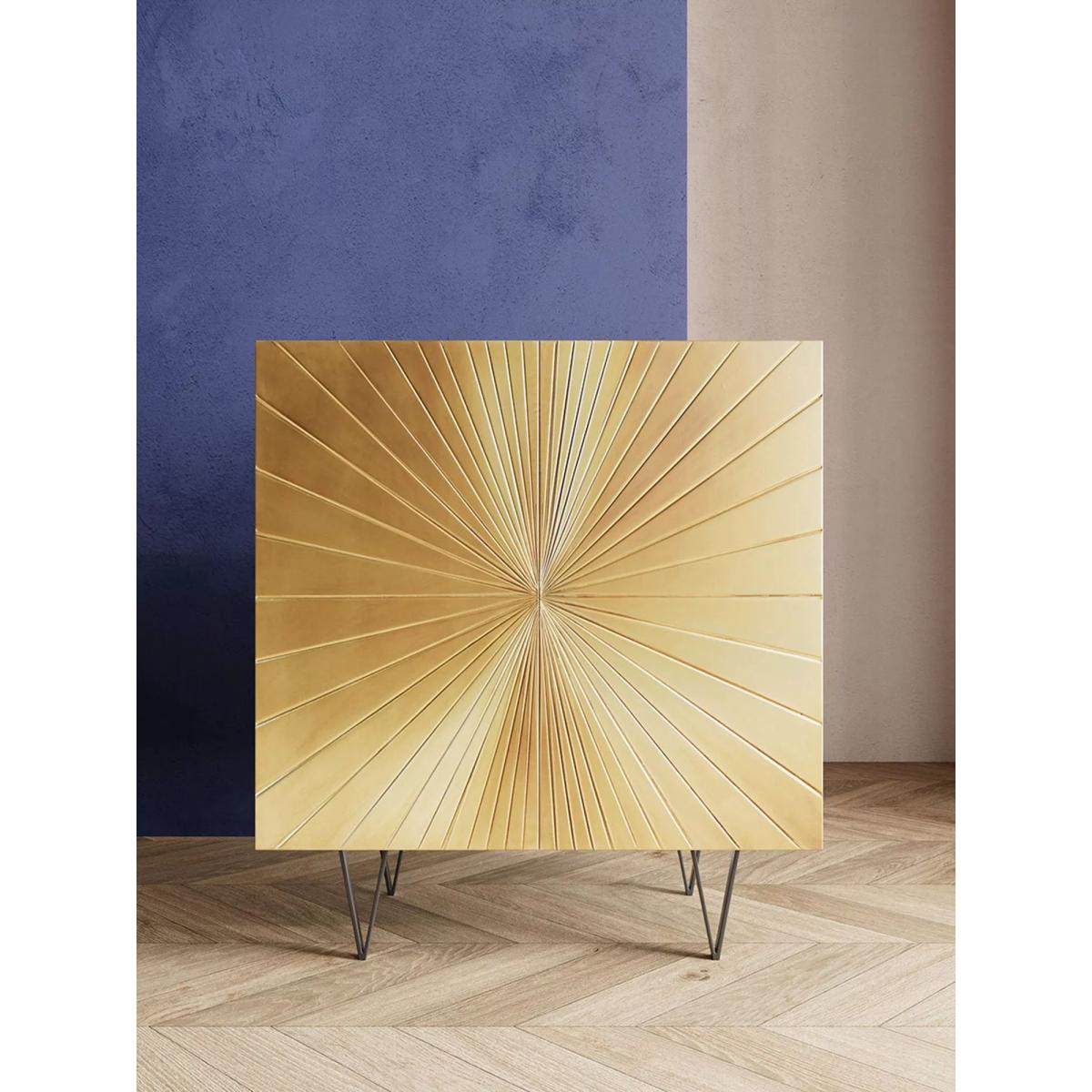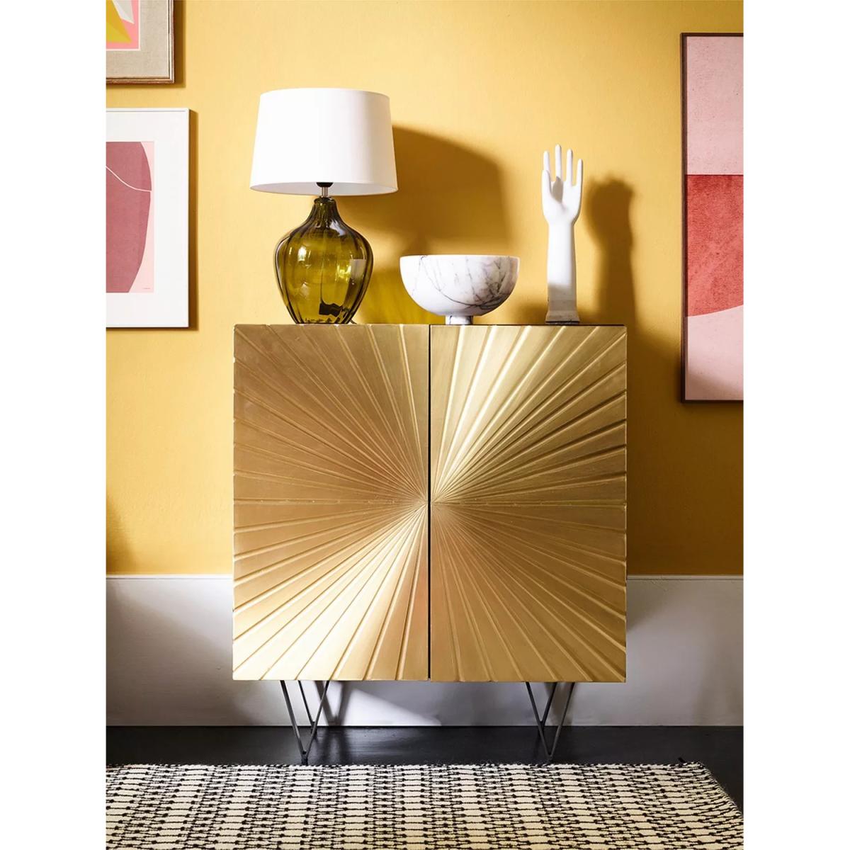 This brilliant gold cabinet is a real stand-out piece that adds a touch of glamour and sophistication to any space. Its geometric design and metallic finish work particularly well in modern, contemporary, or eclectic interiors, where it can serve as both storage and a statement feature. The brass finish lends itself beautifully to rooms with warm colour palettes or metallic accents. Practical styling tips include pairing it with minimalist accessories to let it shine or using it as a colourful display surface for vases, art books, or decorative objects on top. Its size and striking finish make it versatile enough for living rooms, hallways, or bedrooms, offering both style and function with ease.