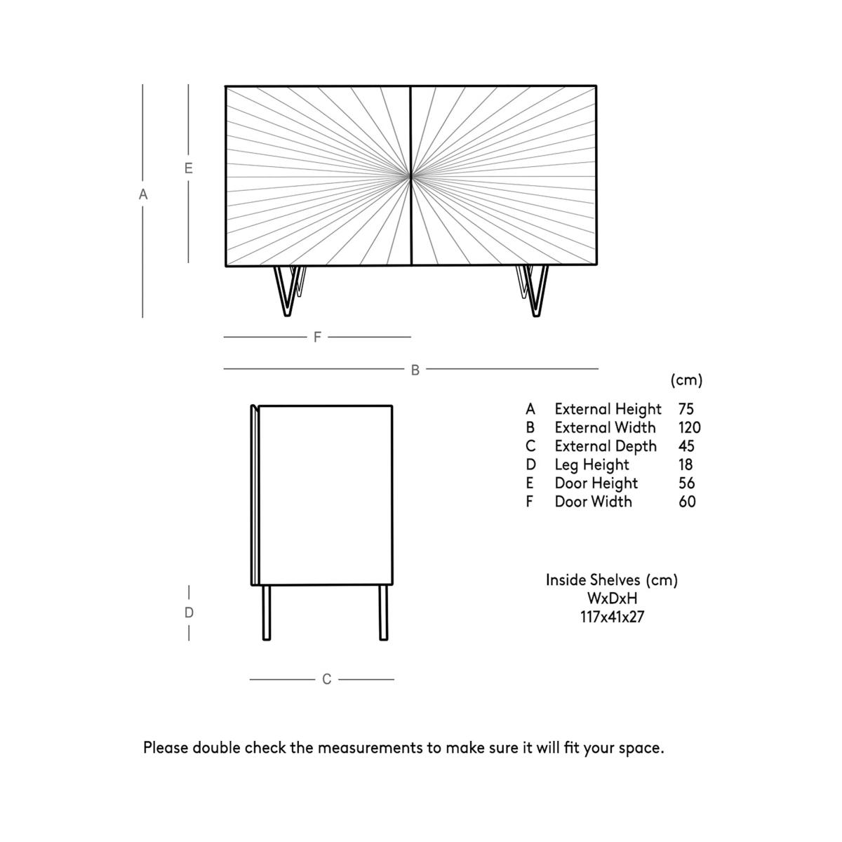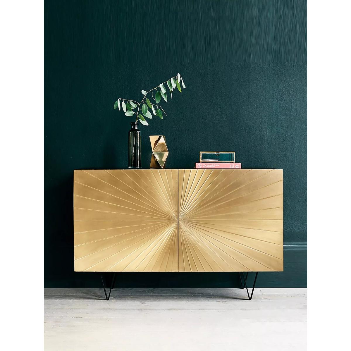 I’m a fan of the Ziggy brass sideboard for its crisp, sunburst-panel doors and slender hairpin legs - it brings a modern nod to mid-century style without overpowering a room. It sits equally well in a streamlined living area, an art-deco-inspired dining space or an eclectic hallway where you want a focal piece with subtle glow. Keep styling minimal so the brass detail can shine: think a low-profile table lamp, a couple of design books and a simple ceramic vase in a muted tone. Position it against a neutral or dark-painted wall to emphasise the finish, and layer in one or two jewel-toned accessories or monochrome artwork for contrast.