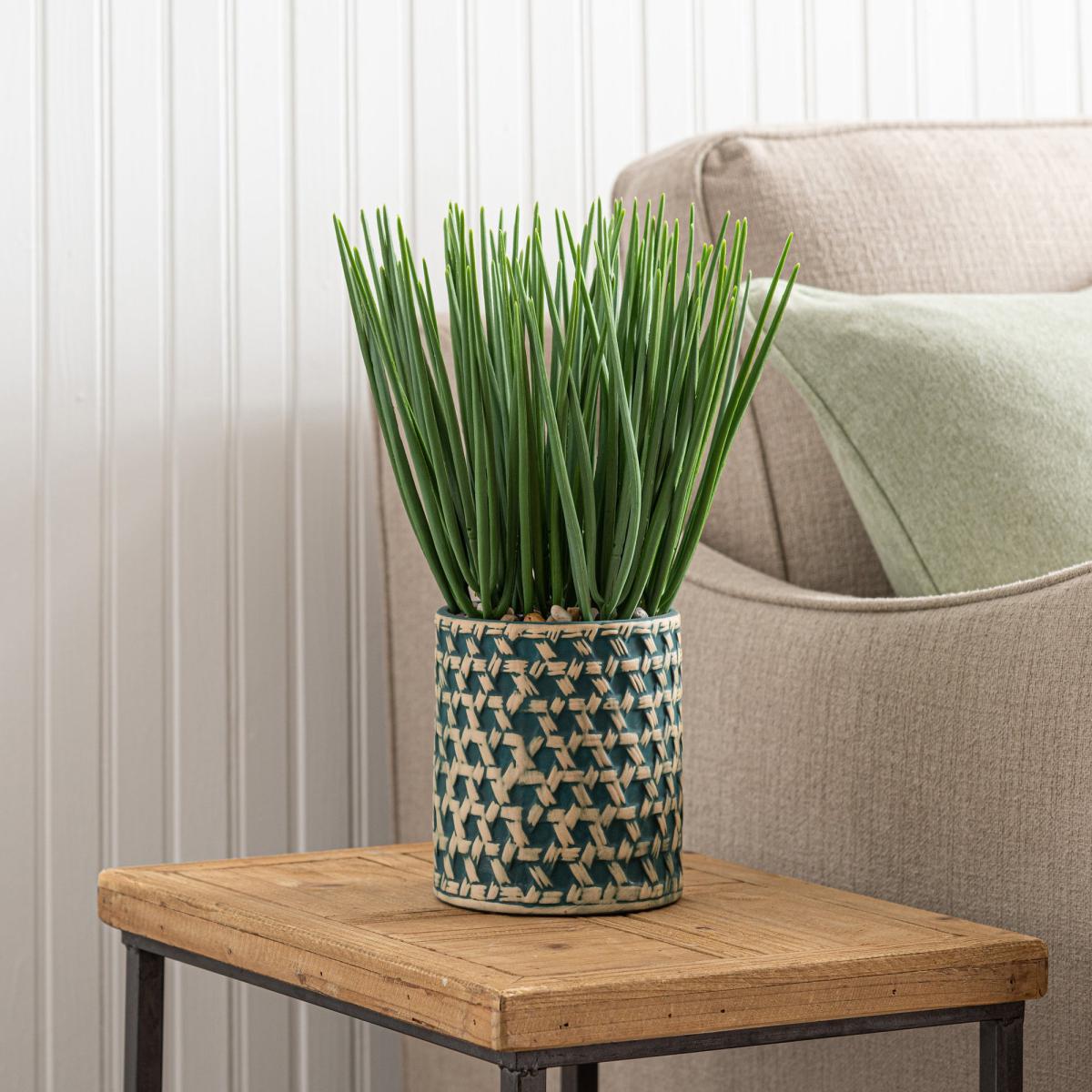 Set in a stylish ceramic pot, this beautiful artificial sword grass has a green colourway, adding a pop of colour to your home and bringing the outside in. This low maintenance piece is ideal for display on shelves, sideboards and tables, perfect for any room of the house.