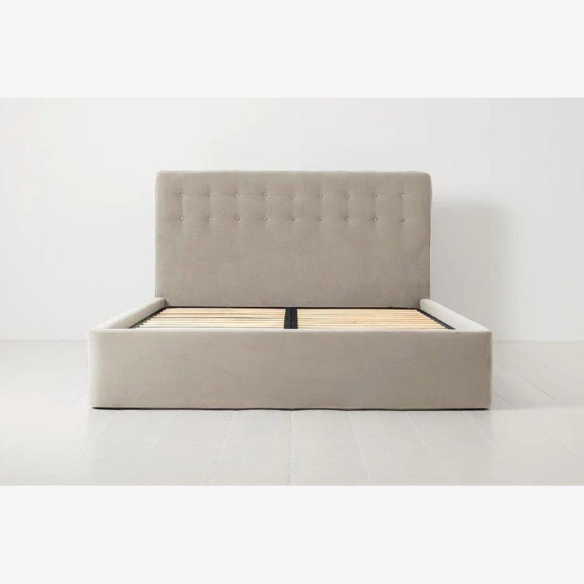 Bed 01 combines traditional timeless style with innovative, modest details such as PEFC certified solid birch plywood and upholstered pulled button detailing. Available in either cool linen or lavish velvet fabrics, choose from classic neutrals or stand-out hues to complete your bedroom oasis. Easily assembled or disassembled in just minutes thanks to the signature Swyft-fix system. Getting your beauty sleep never looked so good. Can’t decide which colour to go for? Request a free fabric sample box and get 17 slices of swatch perfection. Choose from linen, velvet, royal velvet or faux leather. Contact us here to request a swatch sample box. Single Dimensions:Height: 107cm. Width: 149cm. Length: 208cm. Double Dimensions:Height 107cm Width 149cm Length 208cm. King Size Dimensions: Height 107cm. Width 164cm Length 218cm. Super King Size Dimensions: Height 707cm. Width 194cm Length 208cm. Frame Height 32cm, Headboard Height 107cm. All screens vary in colour reproduction and whilst every effort has been made to display the colour as accurately as possible it is for guidance only.