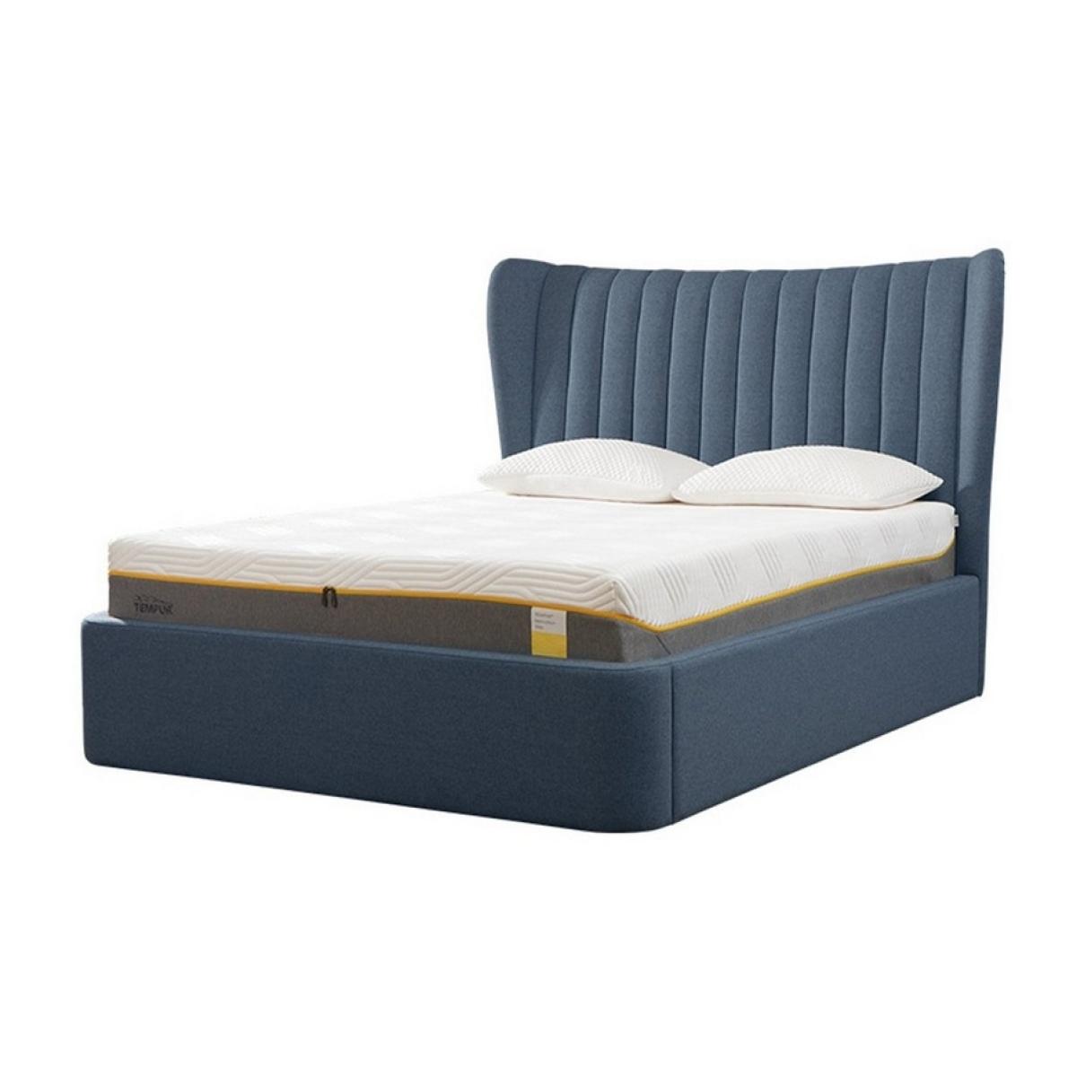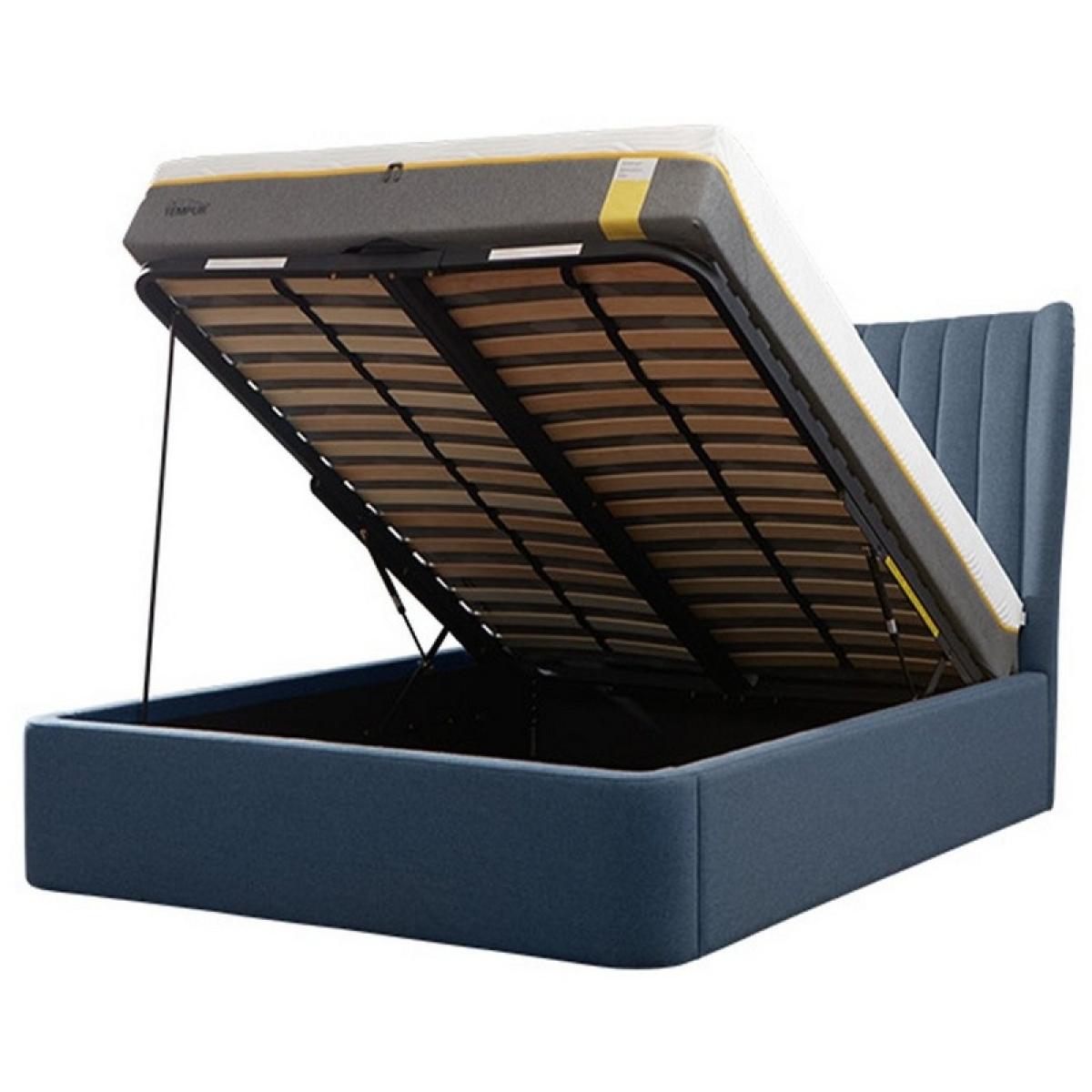 The Horton Ottoman Bedframe from Tempur is the perfect blend of classic and contemporary with its stately high-backed, pleated winged headboard, and chic slim line frame. For a fusion of classic and contemporary design take a look at the Horton upholstered in a Shetland Navy fabric. Where extra storage is required an ottoman bed provides a great solution. Simply lift up the frame to reveal a handy storage space, perfect for keeping bed linen and other lightweight items stowed away. Incorporating a traditional high-backed pleated winged headboard and a modern slim line frame for an extra twist of chic, the Horton Ottoman is upholstered in a range of fashionable soft textured fabrics. With the headboard designed to flush fit to the wall, this ottoman bedstead allows you to maximise your floor space. Hidden Extra Storage Space: Ottoman beds enable you to maximise your storage space. Easy lifting, aided by gas pistons, helps you to raise the frame to reveal a handy compartment, perfect for keeping bed linen and other lightweight items stowed away, freeing up valuable cupboard space. Features: Suitable for all TEMPUR® mattresses in standard king and super king sizes (not included, sold separately) Manufacturer's 10 year frame guarantee Manufacturer's 3 year moving parts guarantee (includes pistons and hinges) Upholstered ottoman base with integral headboard and discreet moulded feet Reverse side of integral headboard finished in a plain fabric to enable close fitting to a wall Operated by gas lift mechanism to access storage space With easy pull up handle to raise slatted frame Plus safety support strut for use when ottoman is fully open Maximum storage weight capacity approx 20kgs Finished in a soft textured fabric Mattress support provided by wooden slats suspended in adjacent twin metal frames For easy access this item is delivered boxed in sections This ottoman will be assembled as part of our home delivery and installation service Dimensions: King Size Overall Dimensions - W 172cm x L 223cm x H 136cm. Foot End Height - 36.5cm King Size Internal Dimensions - W 152cm x L 202cm x H 25cm. Super King Size Overall Dimensions - W 202cm x L 223cm x H 136cm. Foot End Height - 36.5cm Super King Size Internal Dimensions - W 182cm x L 202cm x H 25cm. Please note that all screens vary in colour reproduction and whilst every effort has been made to show the colour as accurately as possible it is for guidance only.