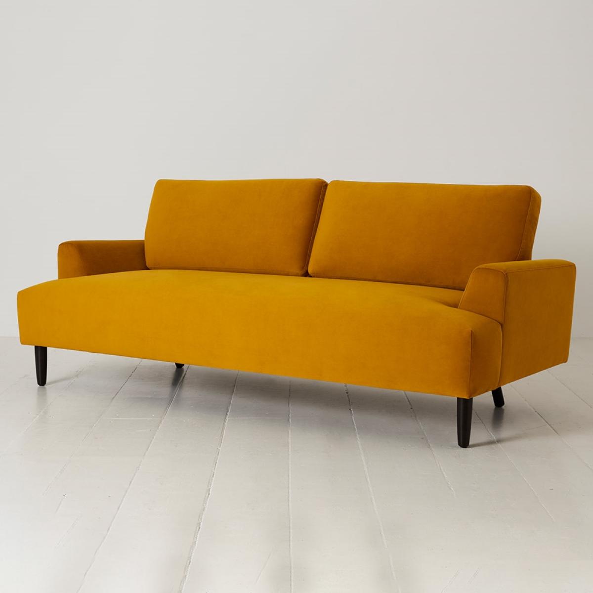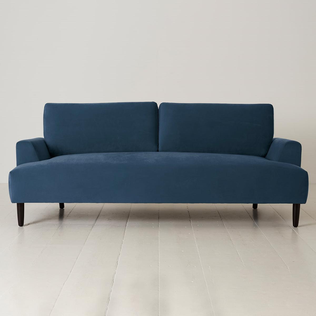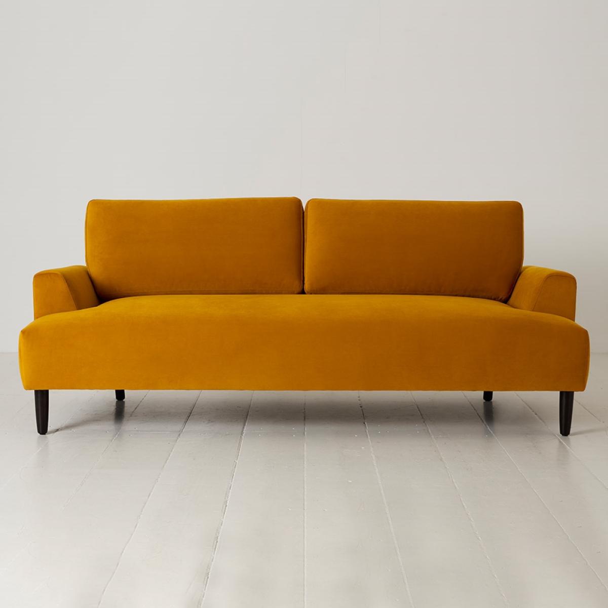 TheSwyft Sofa in a Box Model 05 Velvet 3 Seater Sofa has curves in all the right places! Covered in a luxuriously soft and stain resistant velvet, the chunky armrests and seat offer plenty of support while you relax and unwind. The plush back is designed at a 10 degree angle offering a deeper seat for added comfort; it's oh-so comfortable you'll probably end up catching a few winks completely horizontal. We wouldn't blame you! Styled in a selection of striking colours and the choice of velvet or linen fabrics, the dark wooden legs and curved lines will give your chosen space a retro feel. Pair with the matching pieces from the Swyft Model 05 range and configure your set any way you fancy! All delivered in compact and fully recyclable boxes and a breeze to assemble with no tools required; your living room will be transformed in minutes!.