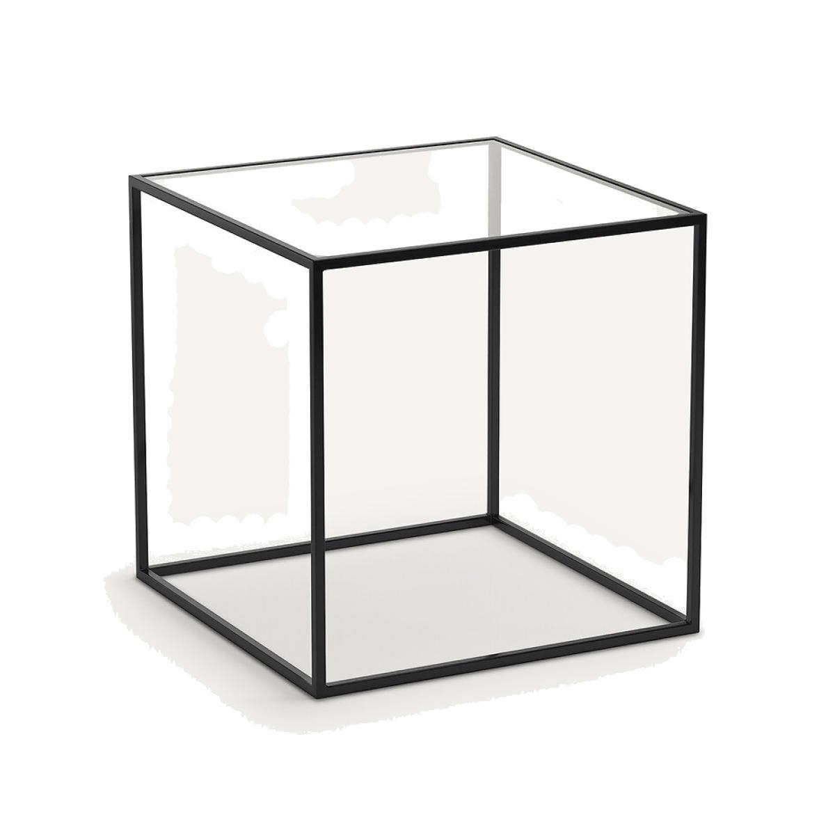 The Sybil side table. So elegant with its cubic shape and lacquered metal. Product Details •  Base in thin iron tube with epoxy finish •  Tabletop in transparent glassDimensions •  L4. 0 x H40 x D40cm Parcel dimensions and weight: •   L46.5 x H47 x D45.5cm •  5.7kg