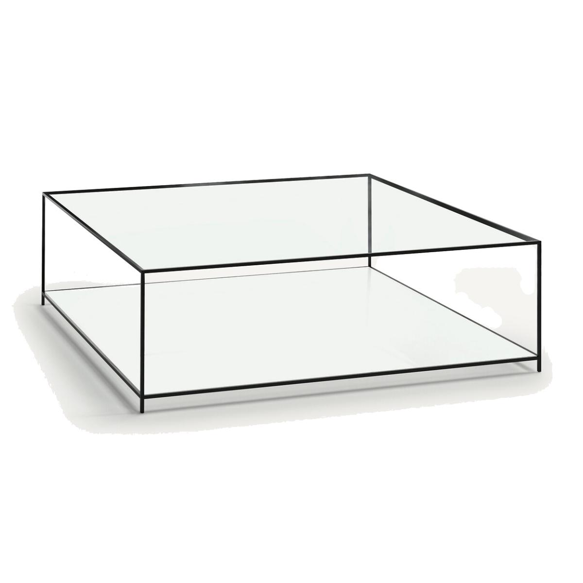 Sybil square coffee table. The elegant, transparent look brings a light and airy feel to your home. Product Details • Epoxy finished iron structure • 2 tempered glass tops, 8 mm thick. Dimensions • L100 x H33 x D100cmDelivery:. Available for home delivery. Note! Please check that all access points are large enough to accommodate your delivery (doors, stairs, lifts).Parcel Dimensions: • L113 x H41.5 x D109.5 cm • 51.2kg