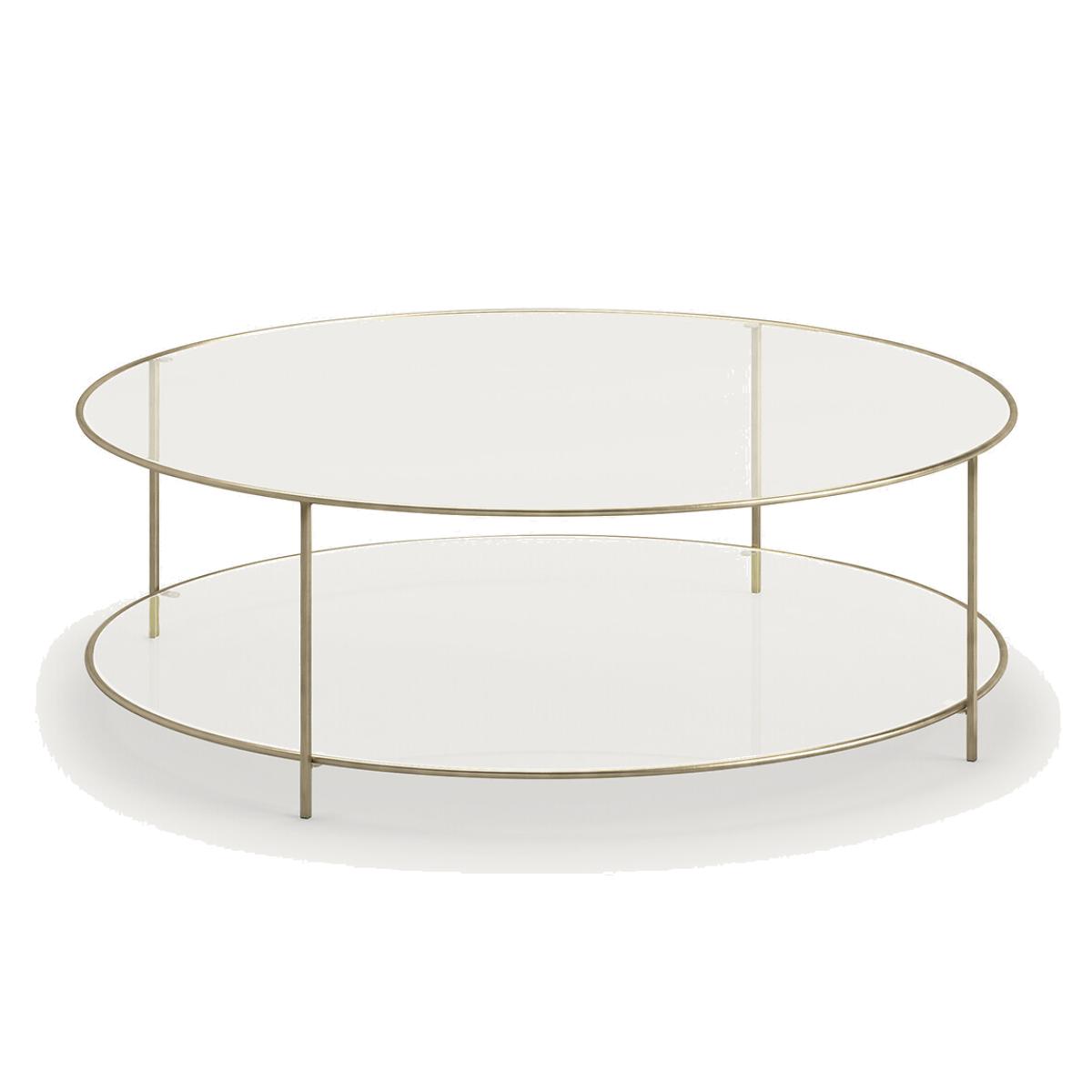 Sybil two-tier round tempered glass coffee table. The elegant transparency of the stunning double tempered glass top will suit any style of interior, modern or classic. Product Details • Iron structure, aged brass effect • 8mm thick tempered glass. Dimensions • Diameter 100 x Height 33cmDelivery:. This product will be delivered to your home. Parcel dimensions and weight: • L108 X D108 X H41.5cm • 46.7kg