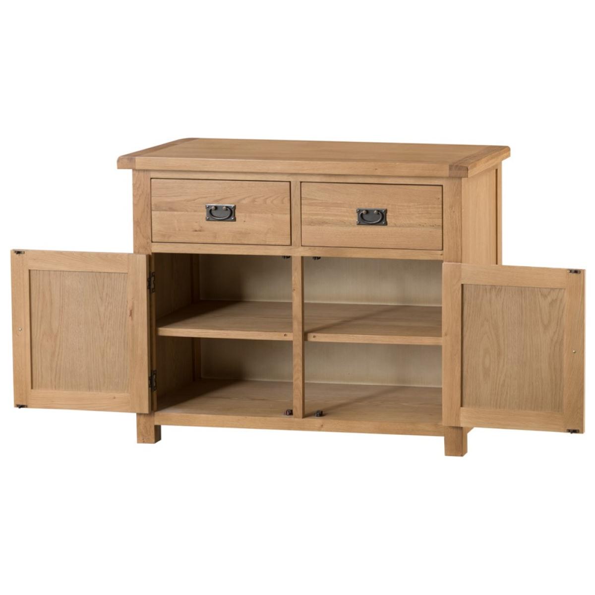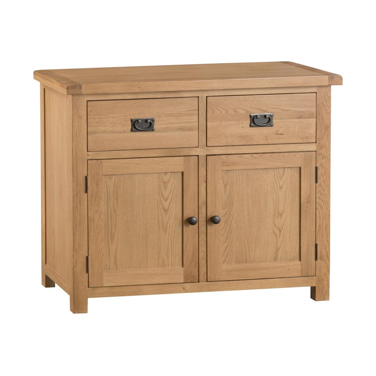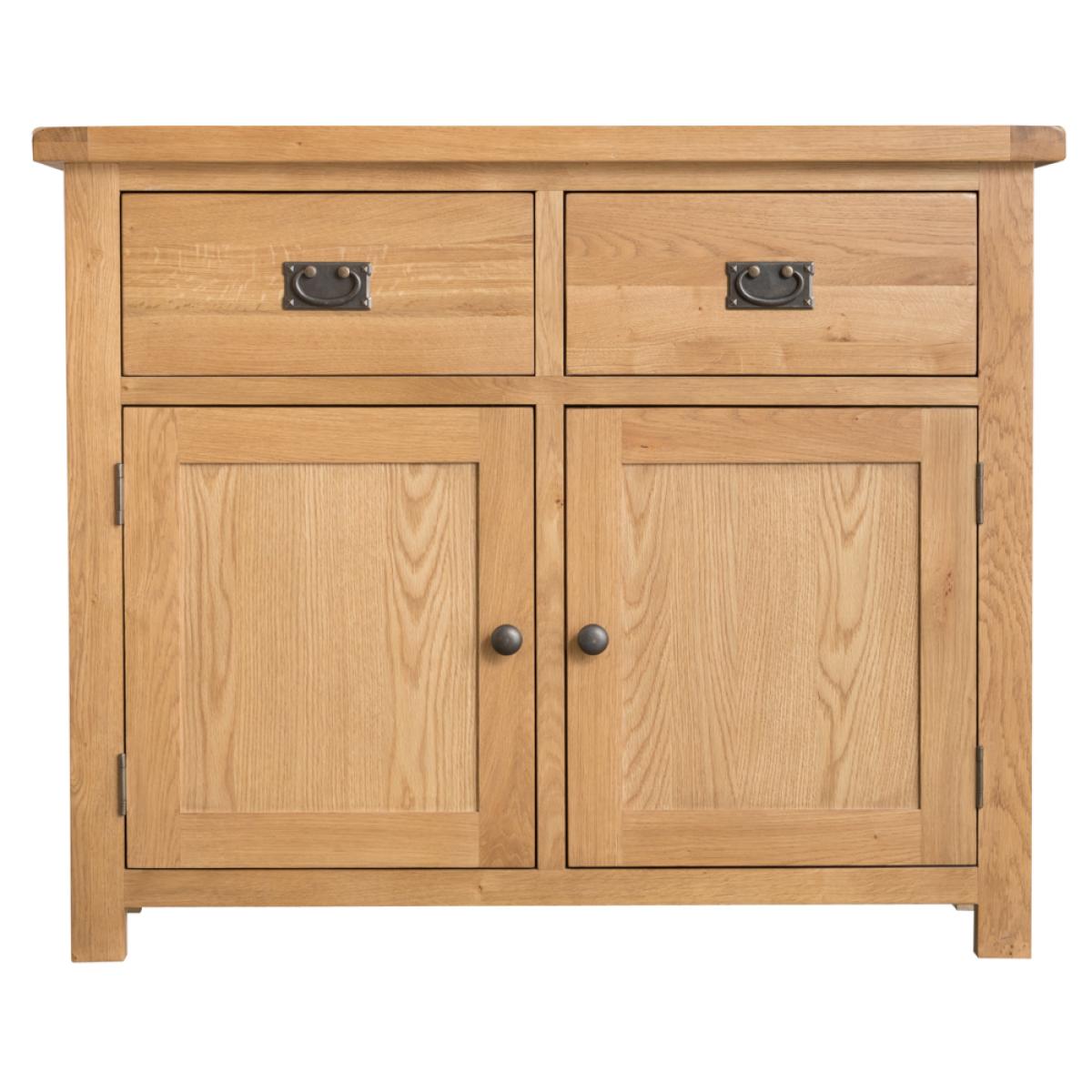 Add a touch of rustic style to your home with the Sydney 2 Door 2 Drawer Oak Sideboard. Featuring a natural medium oak finish for a classic look, the sideboard offers plenty of storage space and features 2 dovetailed drawers and a cabinet with a handy internal shelf. Stylish Oak Sideboard with a classic design. Natural oak finish complements any home Cabinet with handy internal shelf2 dovetailed drawers on wooden guides offer additional storage Antique style brass effect pulls and knobs complete the look