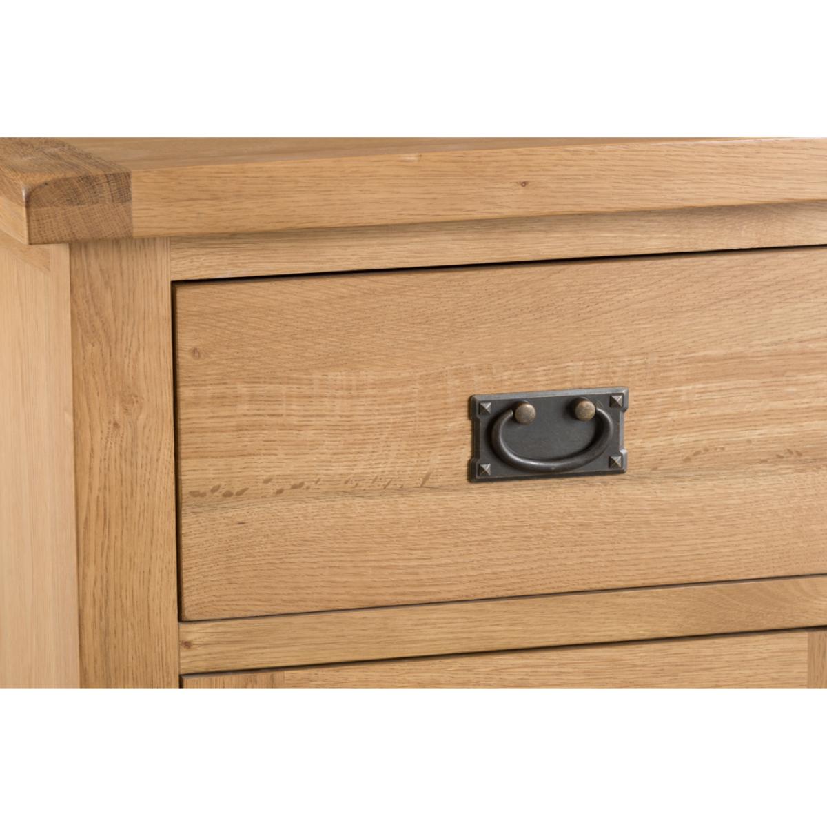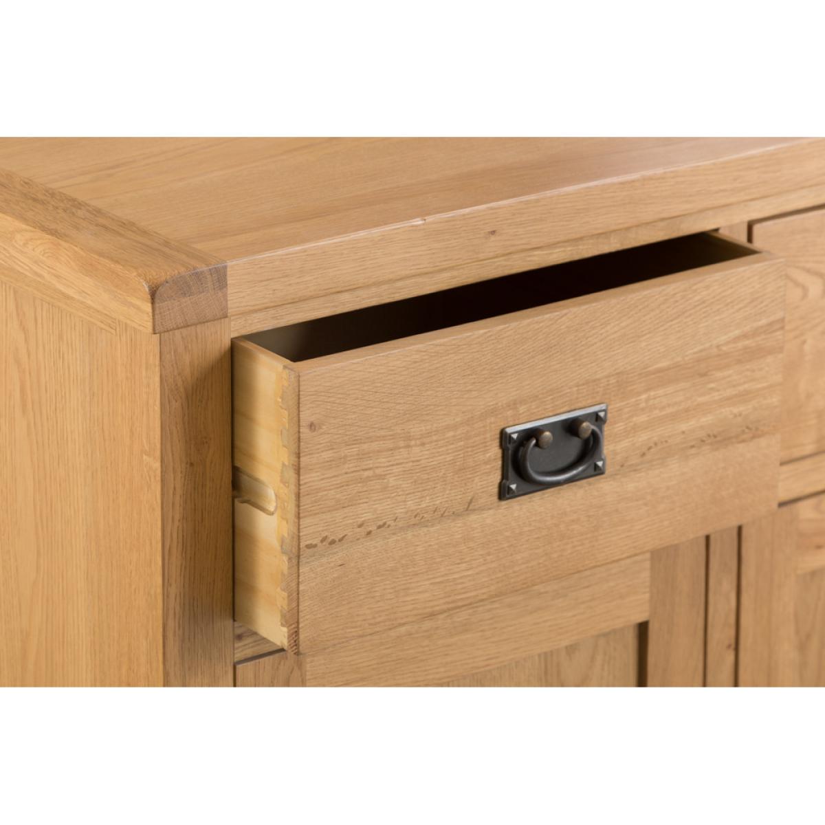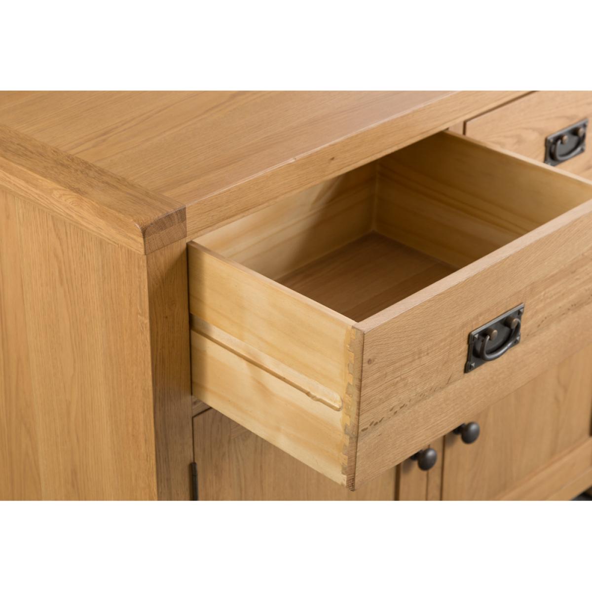 Add a touch of rustic style to your home with the Sydney 2 Door 2 Drawer Oak Sideboard. Featuring a natural medium oak finish for a classic look, the sideboard offers plenty of storage space and features 2 dovetailed drawers and a cabinet with a handy internal shelf. Stylish Oak Sideboard with a classic design. Natural oak finish complements any home Cabinet with handy internal shelf2 dovetailed drawers on wooden guides offer additional storage Antique style brass effect pulls and knobs complete the look