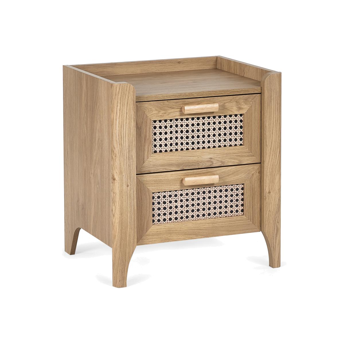 A beautifully sleek design with a bohemian feel, the Sydney 2 Drawer Bedside offers exquisitely curved edging accompanied by a raised lip around the edge providing a practical addition, stunningly combined with a rattan-styled front. Finished with a natural oak effect featuring two drawers providing enough storage space to put your belongings away with gloved handles for easy access. Creating the perfect airy, warm feel around your home.