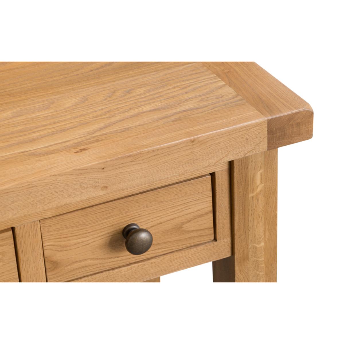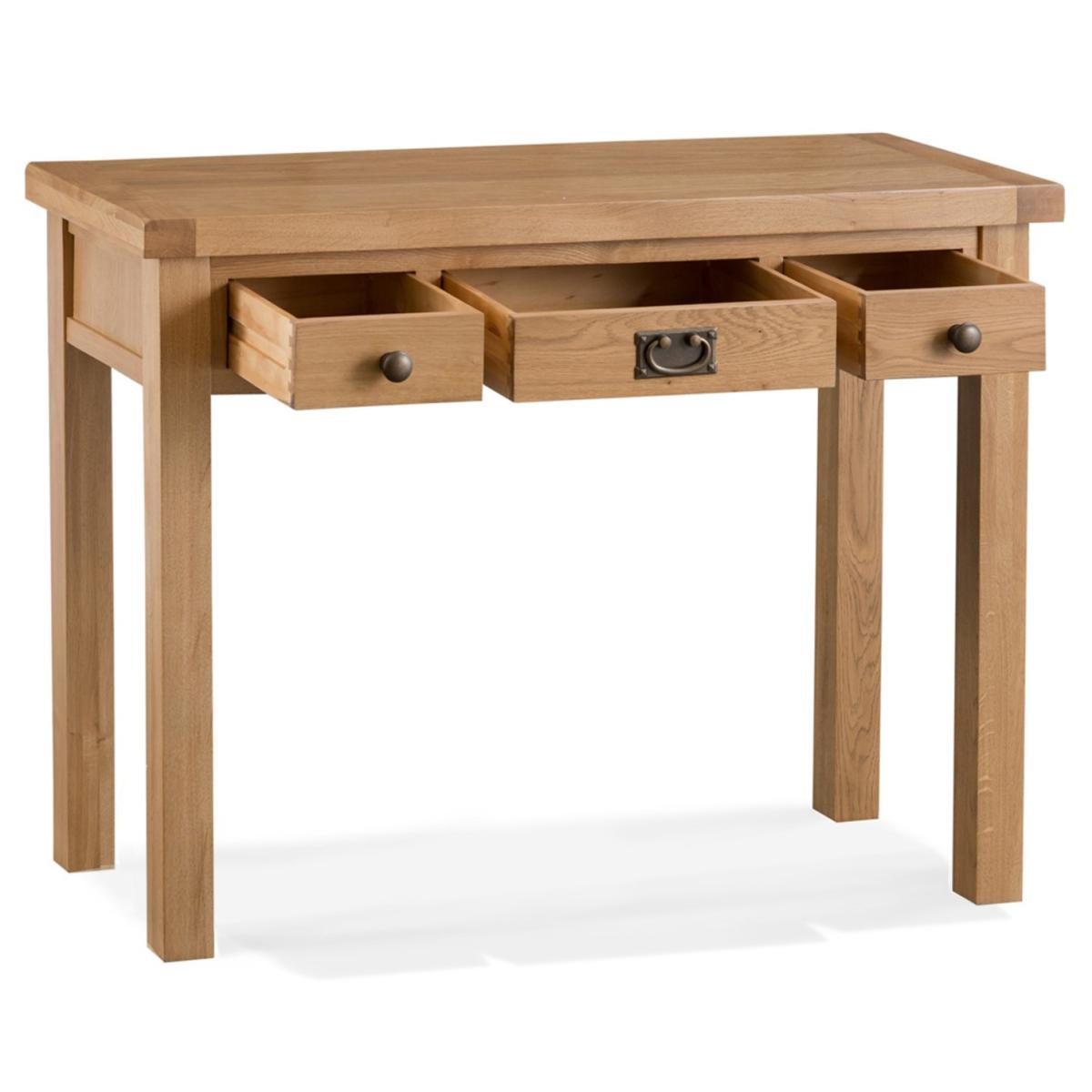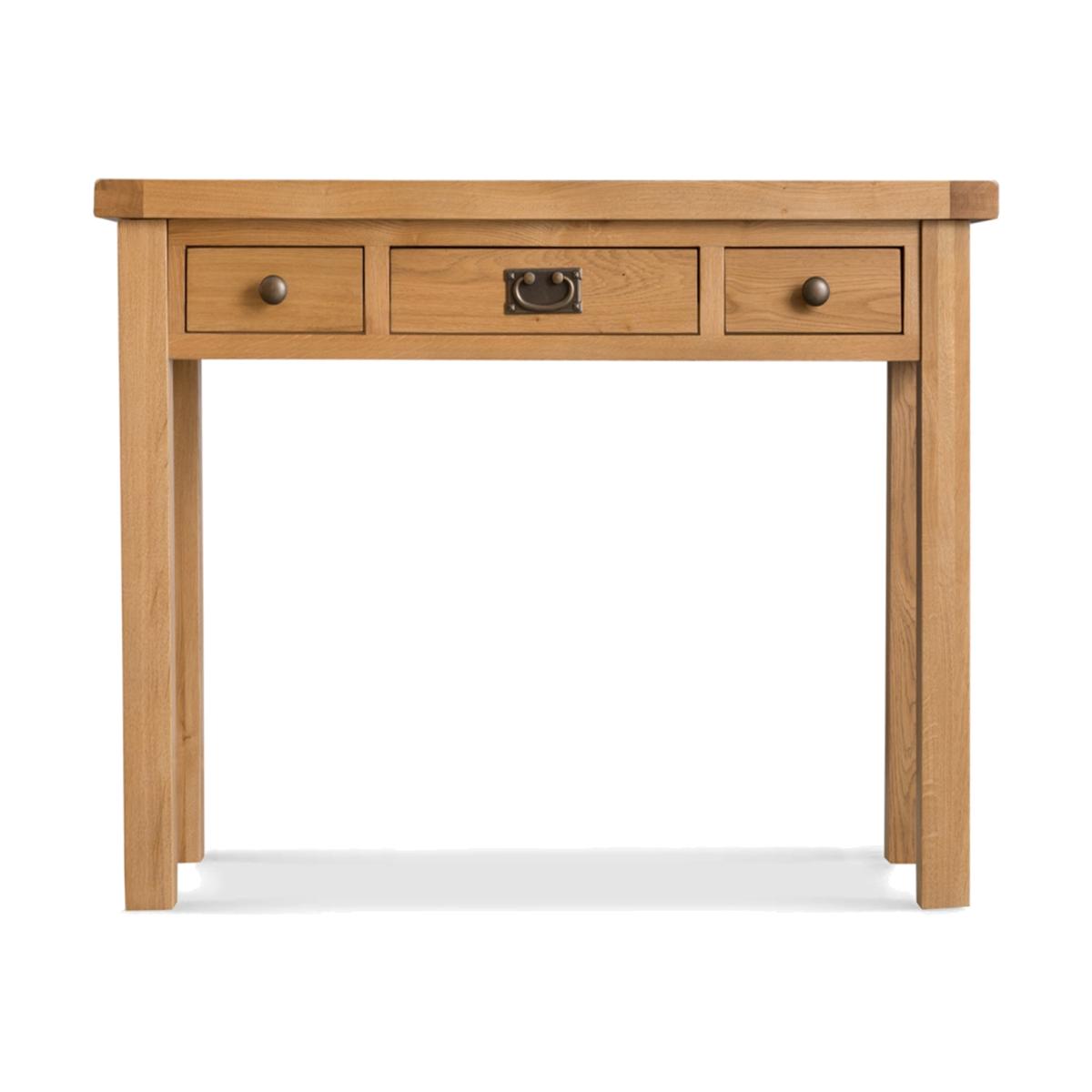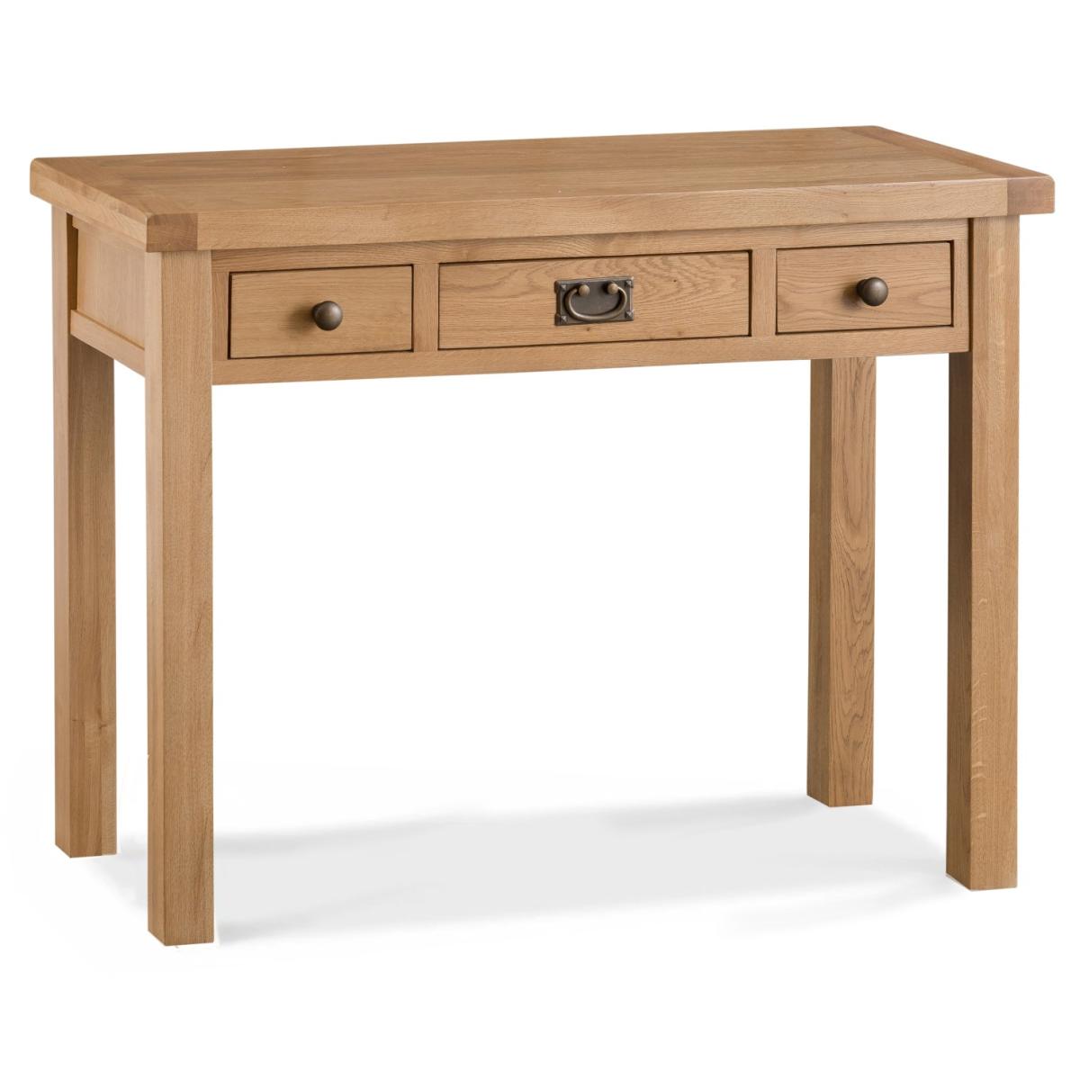 Bring classically beautiful rustic style to your bedroom with the Sydney 3 Drawer Dressing Table. Carefully crafted, the dressing table features a natural oak effect frame to suit any décor and is complete with 3 convenient drawers. Classically stylish 3 Drawer Dressing Table Natural medium oak finish for a rustic style to suit any interior 3 dovetailed drawers on wooden guides Antique style brass effect handles beautifully complete the look Look out for more from the Sydney range