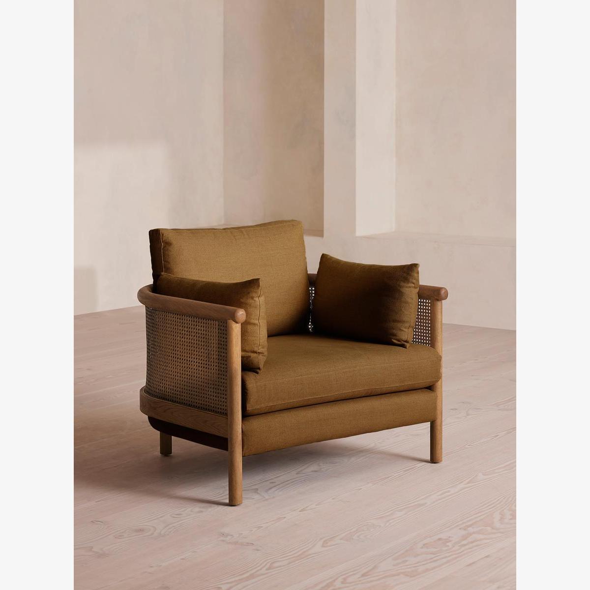 I’m a fan of the Sydney chair in ochre linen because its warm tone and pared-back frame slot straight into both Scandi-influenced and mid-century spaces. The natural wood detailing and neutral upholstery make it easy to layer contrasting textures - think a chunky wool throw in slate grey or a jute rug underneath to ground the look. For styling, angle the chair slightly towards a sofa to create a conversation nook, and add a lumbar cushion in a bold print for extra character. It also holds up well in more eclectic or boho schemes when paired with rattan side tables and a few potted plants to soften the lines.