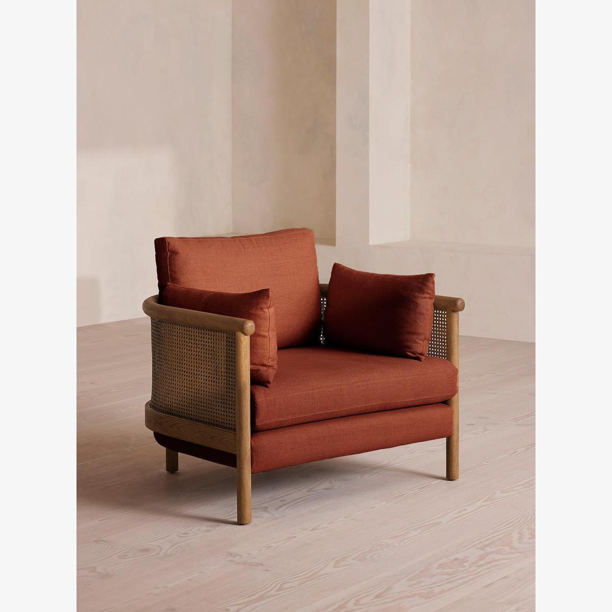 I’m a big fan of the Sienna chair for its blend of clean lines and natural materials. The warm terracotta linen works brilliantly against pale walls or light timber floors, while the rattan-woven sides add a hint of texture without feeling fussy. Its solid oak frame gives you both comfort and durability, so it’s equally at home in a busy living room or a quiet reading nook. Styling-wise, keep accessories minimal to let the chair’s colour pop - think a charcoal wool throw or a muted geometric cushion. Pair it with a low wooden coffee table and a jute rug for a relaxed, contemporary look, or add a sculptural floor lamp and a stack of art books to pull together a more curated scheme.