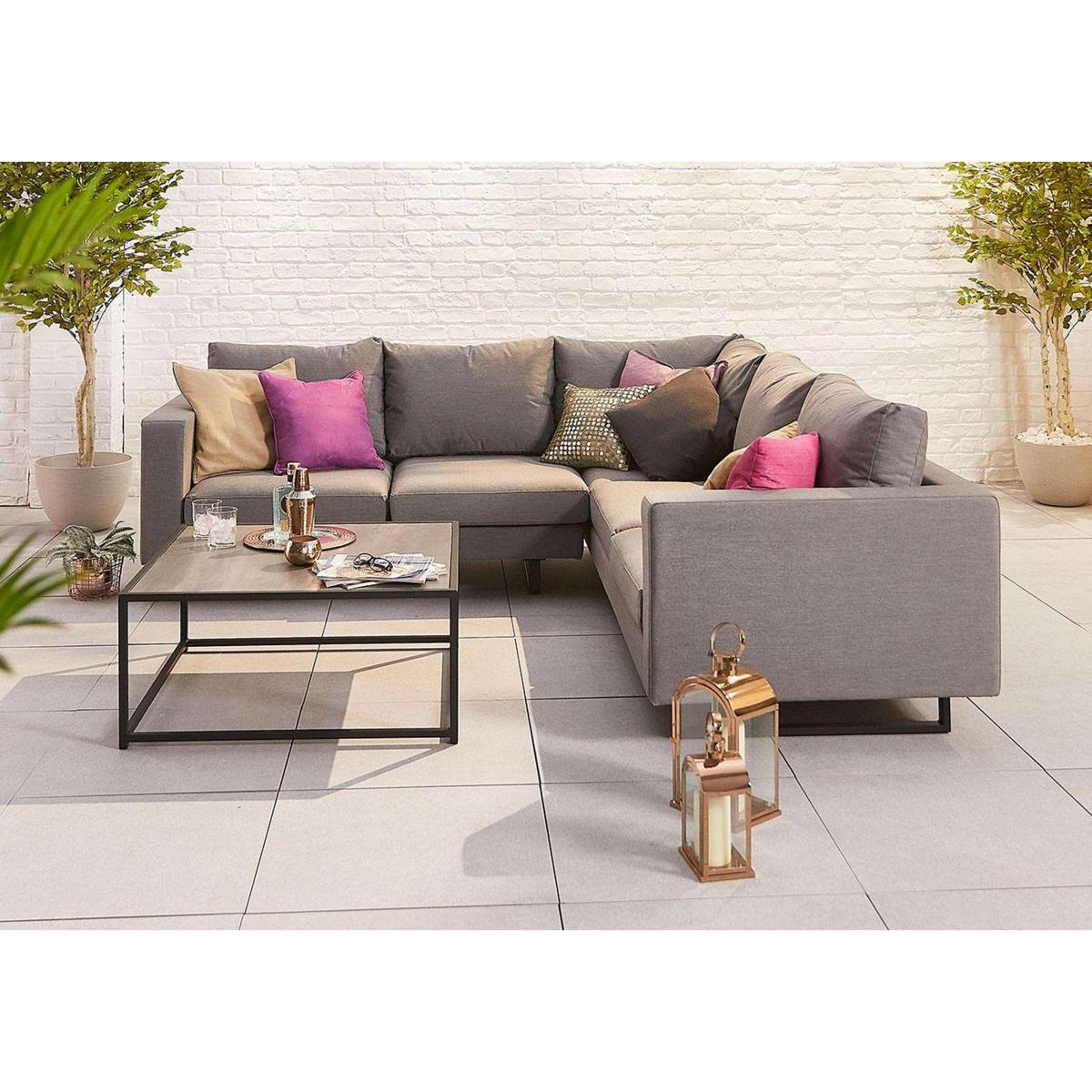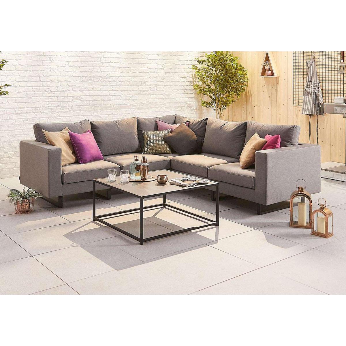 Relaxing is easy with this stylish garden corner sofa set. The perfect size for smaller outdoor spaces, it comprises a super-comfy corner sofa plus practical coffee table. Sink in and sprawl out, cold beverage at hand. Why you'll love it. Compact corner sofa and coffee table set is perfect for summer socialising. On-trend urban style. Upholstered in revolutionary easy-clean, water-repellent Sunbrella® fabric. Stain-, fade- and UV-resistant. Mould and mildew proof. Quick-dry foam cushion filling allows water to drain away. Sofa has stylish U-shaped black metal legs. Square coffee table with a black frame and a smooth faux wood top. A Furniture Village online exclusive. What you need to know. Sofa seats up to 5 adults. Sofa and coffee table frame are made of aluminium. We recommend covering the sofa and table in wet weather and when not in use. Sunbrella fabric can be cleaned with plain or soapy water. Aluminium should be cleaned with warm soapy water and a soft cloth. Avoid abrasive cloths and chemical cleaners. If your aluminium furniture is exposed to coastal winds, wipe it regularly.