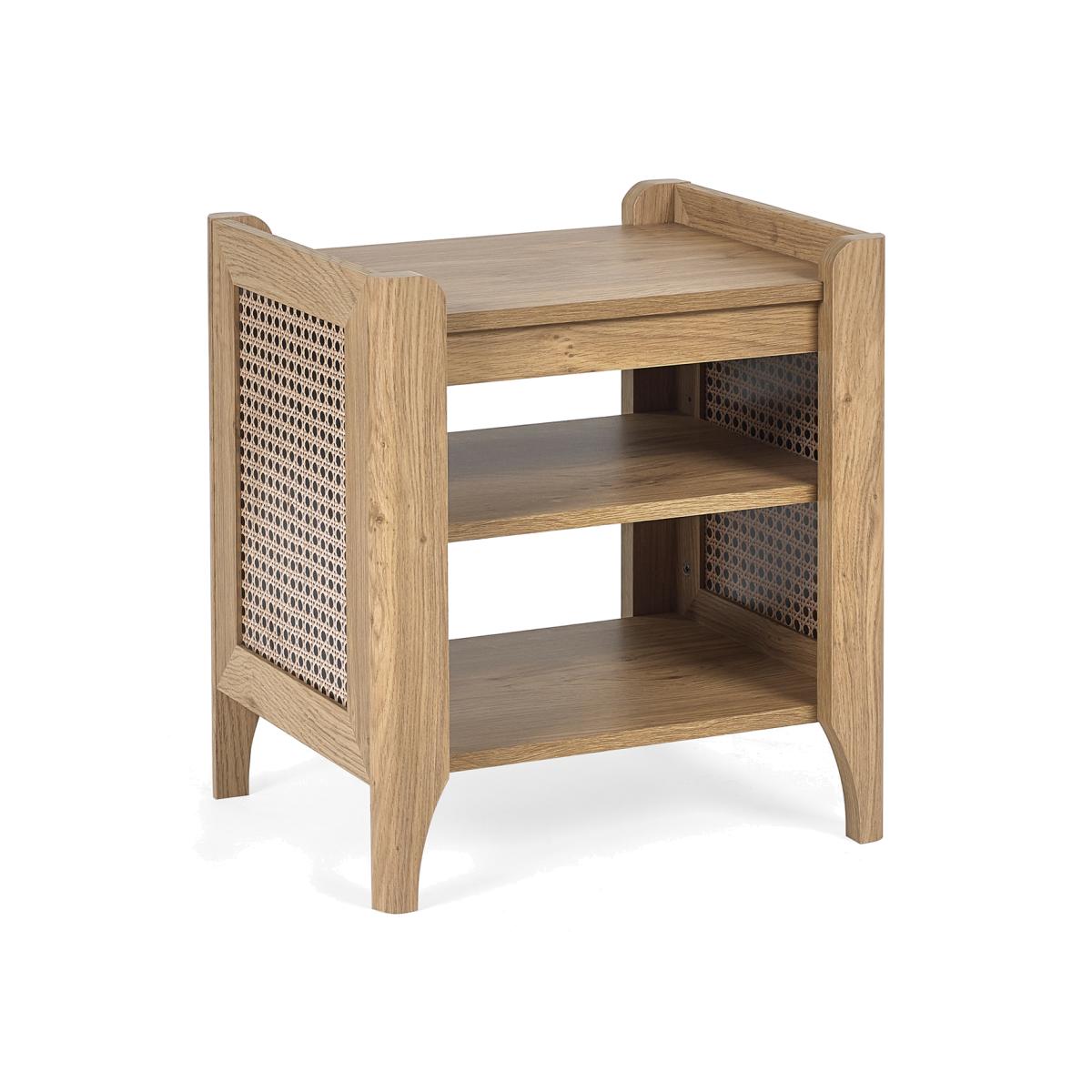 Showcasing a beautifully sleek design with a bohemian feel, the Sydney Lamp Table offers exquisitely curved edging accompanied by a raised lip around the edge providing a practical addition, stunningly combined with a rattan-styled front. Finished with a natural oak effect featuring a removable shelf allowing you to store key essentials both on the top and bottom of the table. All around creating the perfect airy, warm feel within your home.