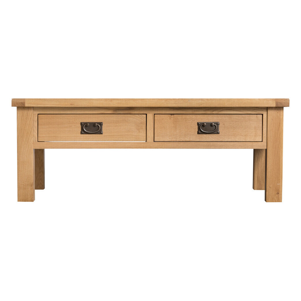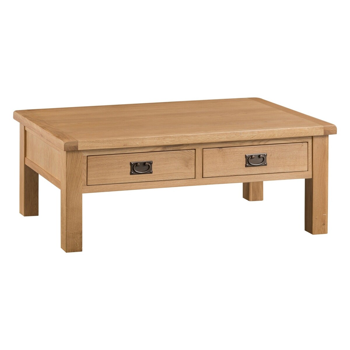 The Sydney large coffee table is a strong and stylish centrepiece for your living room. With 2 dovetailed drawers, the coffee table is complete with a radiant, medium oak finish that brings out the grain in the wood. Stylish coffee table with durable solid wood frame. 2 dovetailed drawers running on wooden guides. These drawers have antique-style pull out brass handles. Short, sturdy, solid wood legs that provide lots of stability and support. Chunky solid oak top that provides a stable surface. Blends well with other items from the furniture collection. 10 minute assembly. Look out for more items from this range of furniture.