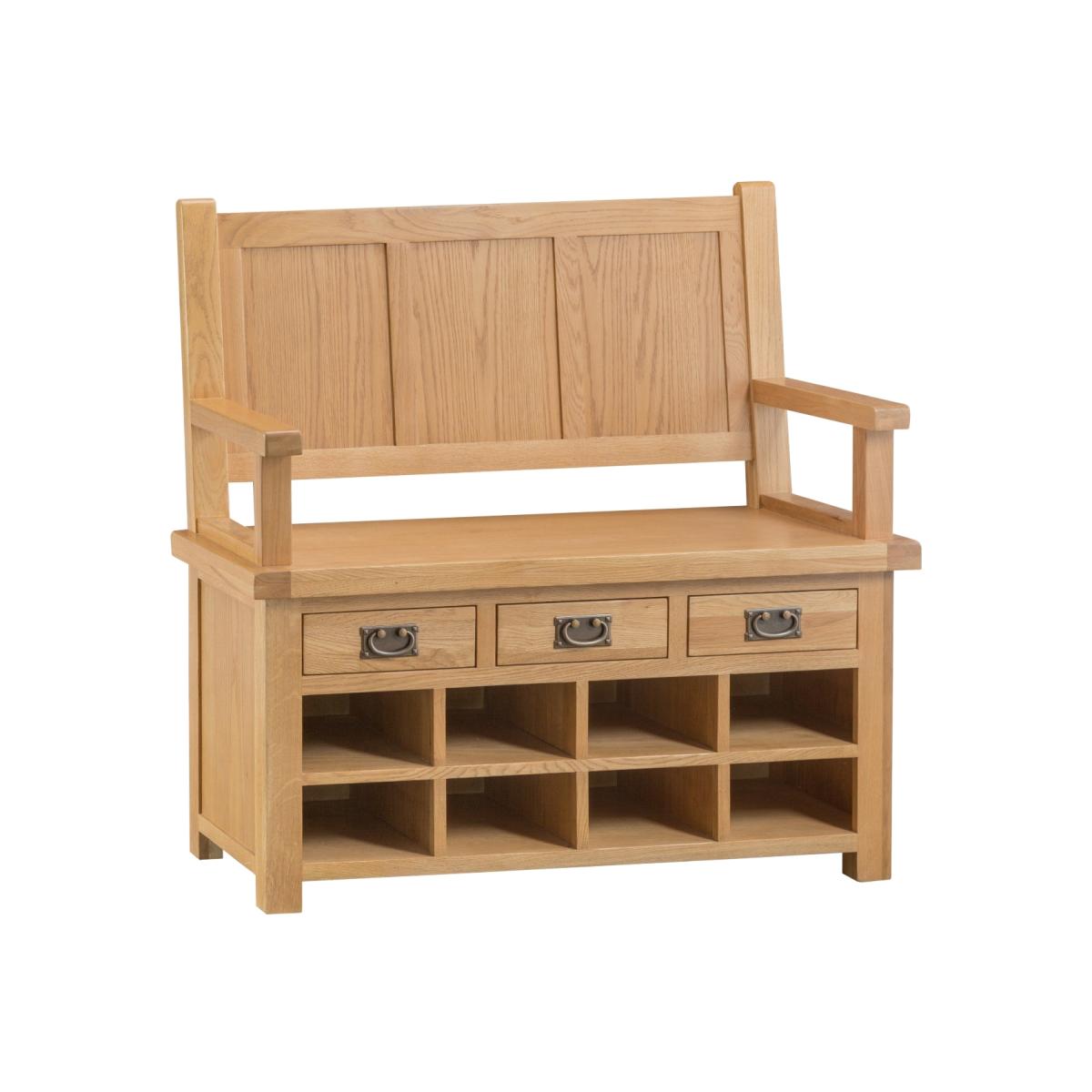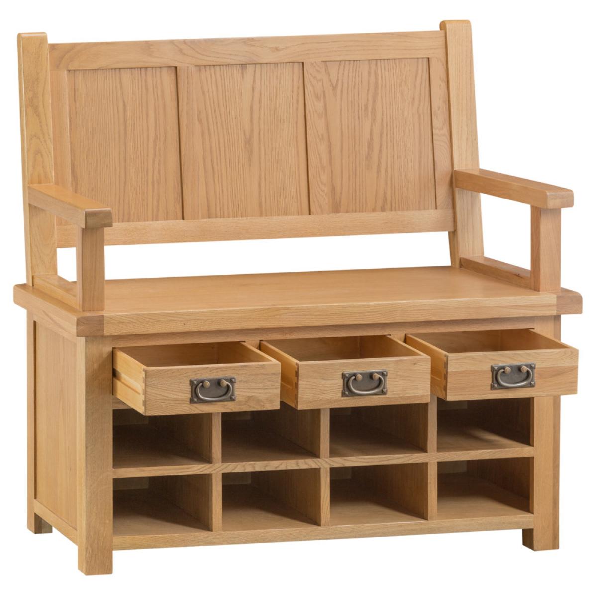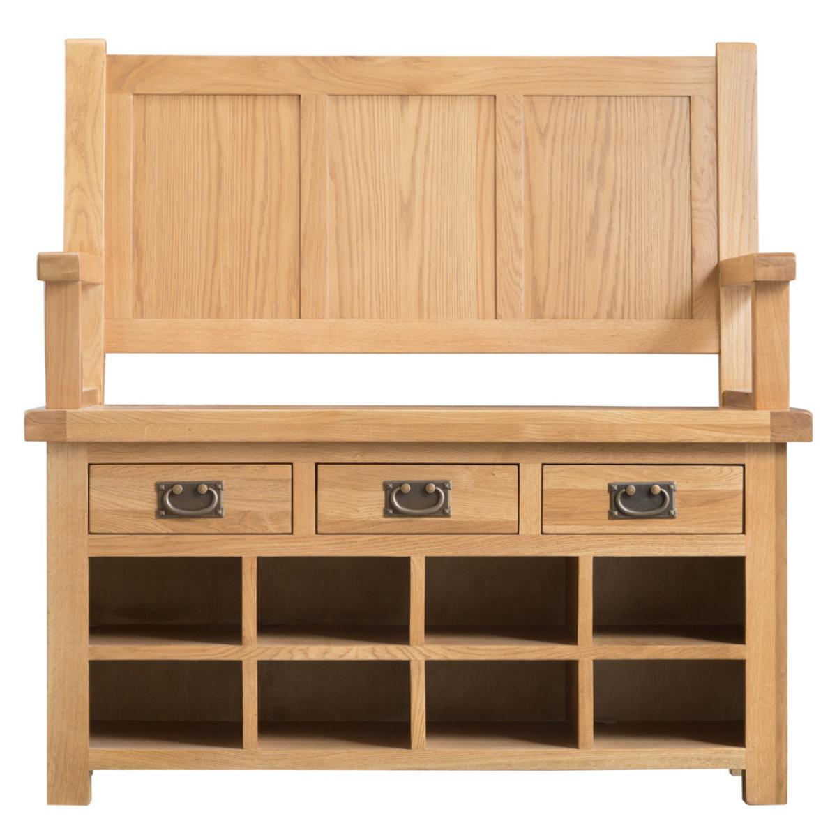 The Sydney monks bench is a classy, timeless, and artistic accent bench that will introduce practicality, comfort and style to your home. It was designed with quality and elegance in mind, and will provide exceptional value for money. This accent bench was crafted from durable timbers and features a sturdy solid wood frame. Bench with a strong, enduring frame that sets it up for years of regular use. Natural medium oak finish for a warm, classic look. 8 cubby holes to store your shoes. 3 dovetailed drawers running on wooden guides. These drawers have antique, brass pull handles. High backrest for extra comfort and support. Goes perfectly with other items from the Sydney collection. Comes ready assembled. Look out for more items from this range.
