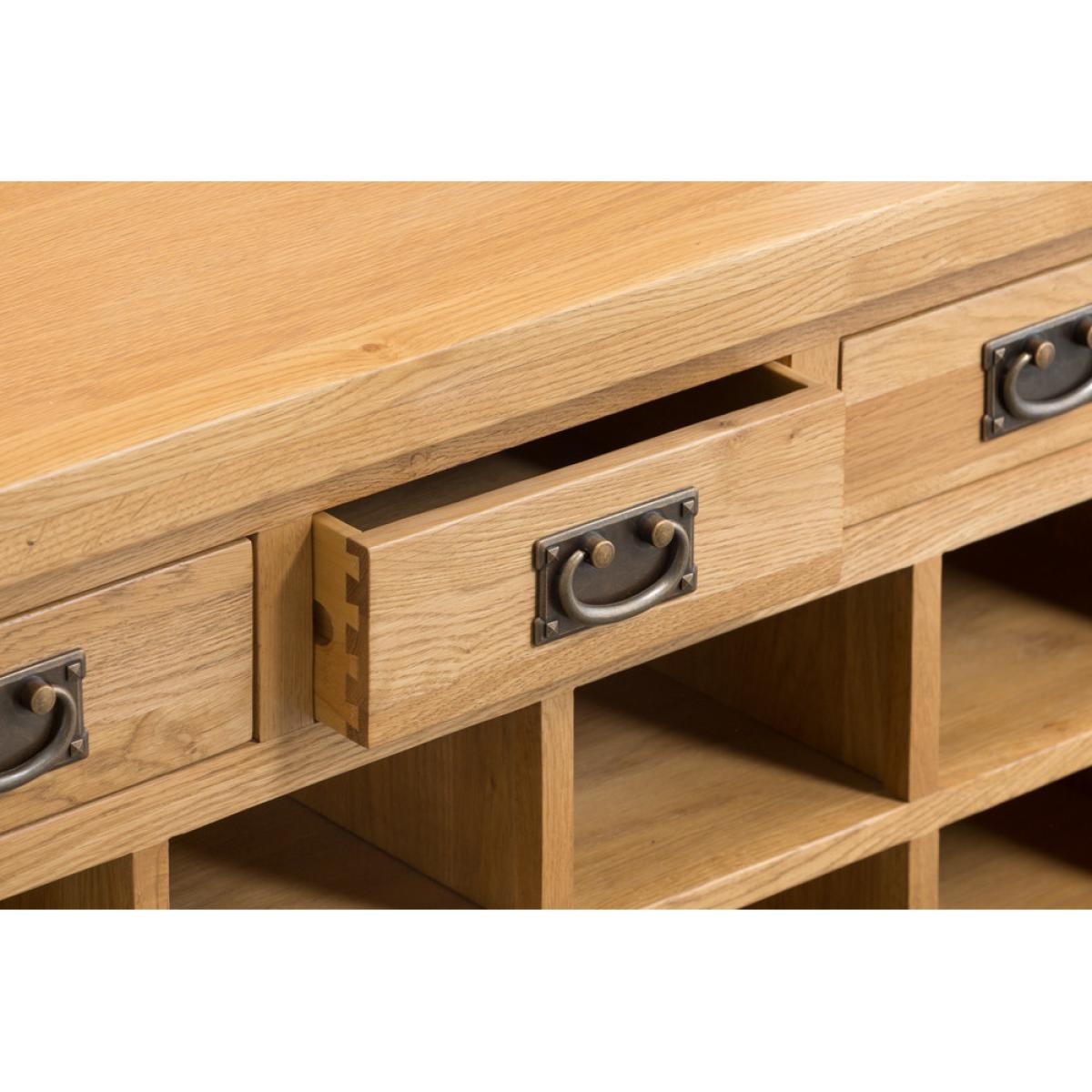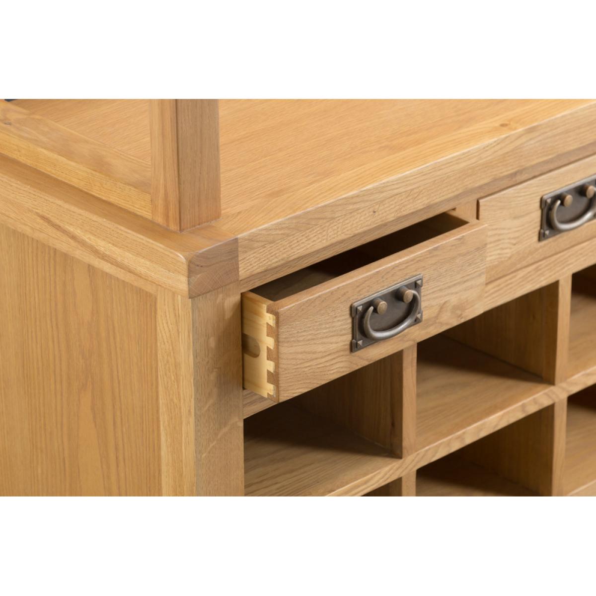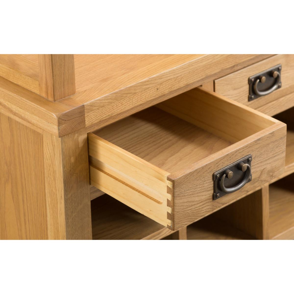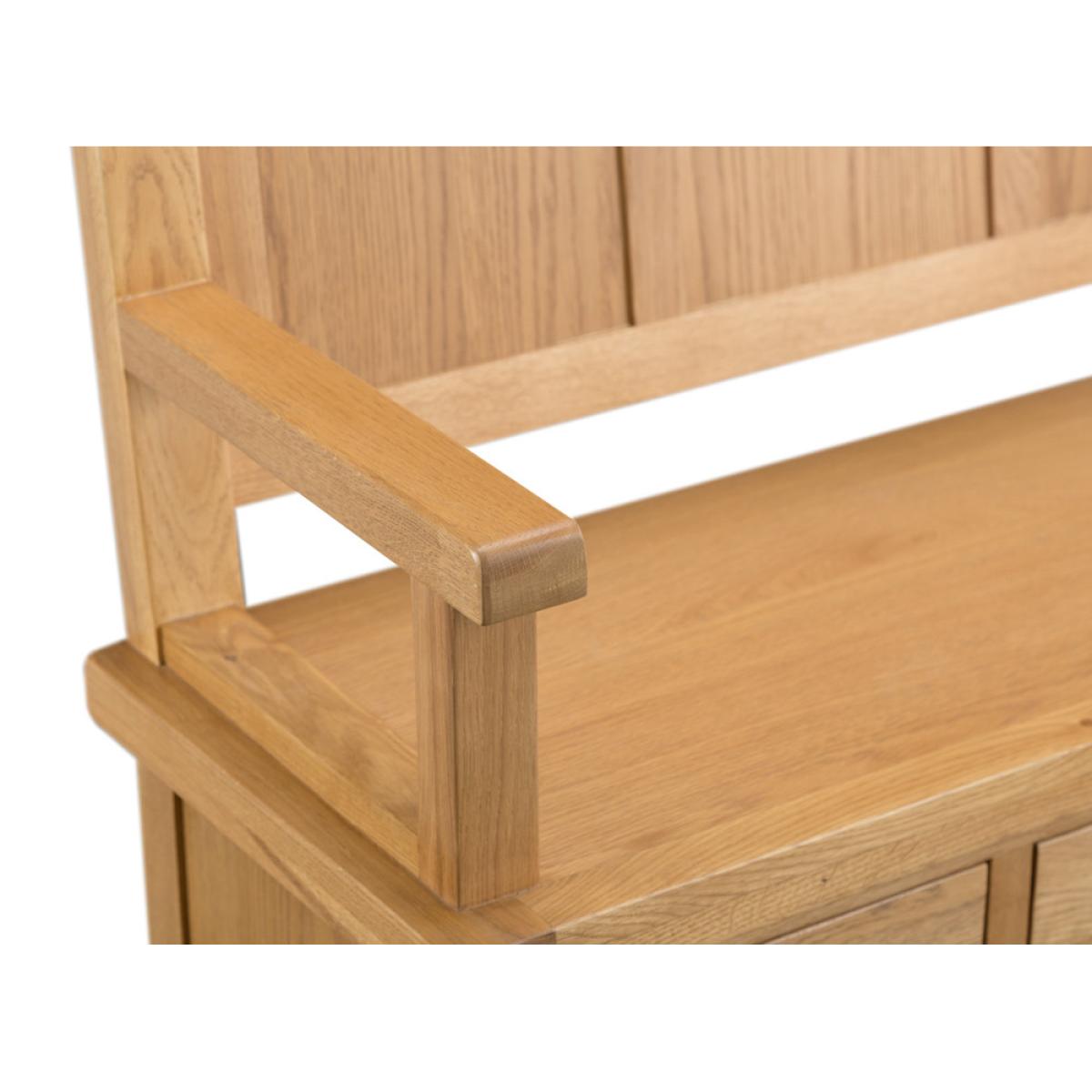 The Sydney monks bench is a classy, timeless, and artistic accent bench that will introduce practicality, comfort and style to your home. It was designed with quality and elegance in mind, and will provide exceptional value for money. This accent bench was crafted from durable timbers and features a sturdy solid wood frame. Bench with a strong, enduring frame that sets it up for years of regular use. Natural medium oak finish for a warm, classic look. 8 cubby holes to store your shoes. 3 dovetailed drawers running on wooden guides. These drawers have antique, brass pull handles. High backrest for extra comfort and support. Goes perfectly with other items from the Sydney collection. Comes ready assembled. Look out for more items from this range.