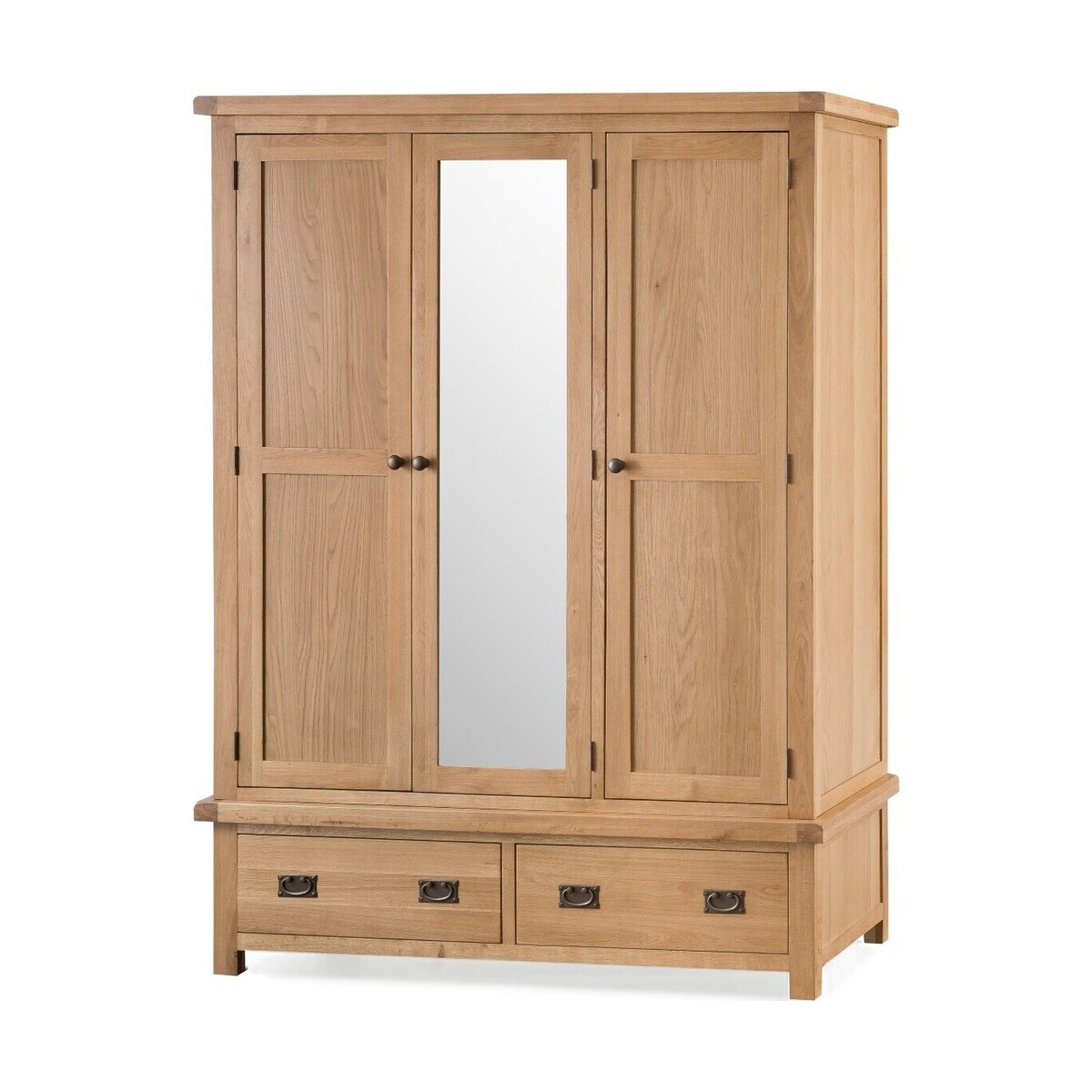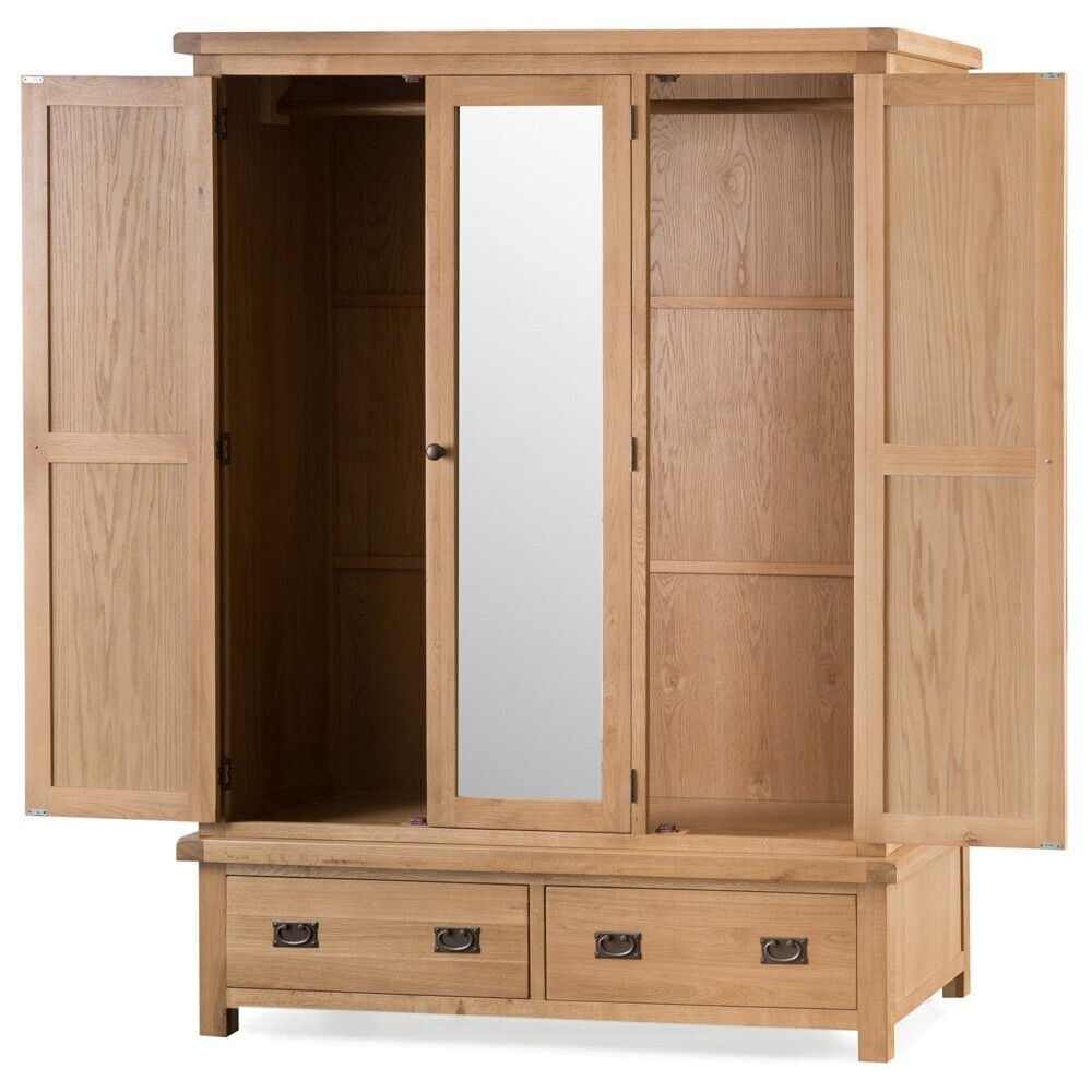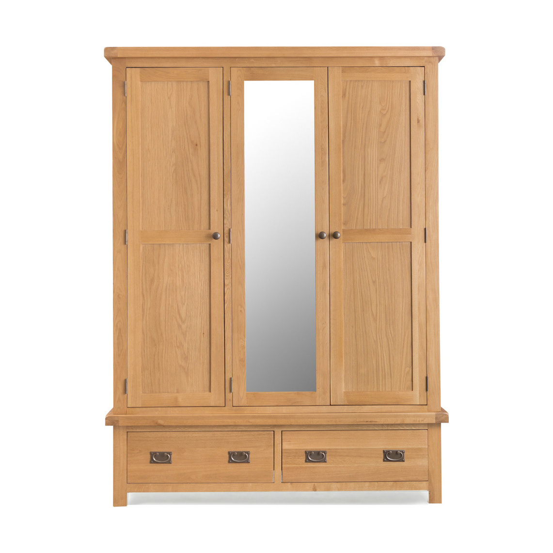 Featuring a classic rustic design, this Sydney Three Door Wardrobe with Mirror is a stylish and functional piece of bedroom furniture. Featuring three doors, the large wardrobe is complete with a floor length mirror and two lower drawers. Rustic three door wardrobe Complete with floor length mirror in the centre Two lower drawers Natural medium oak effect finish Antique brass effect handles complete the look