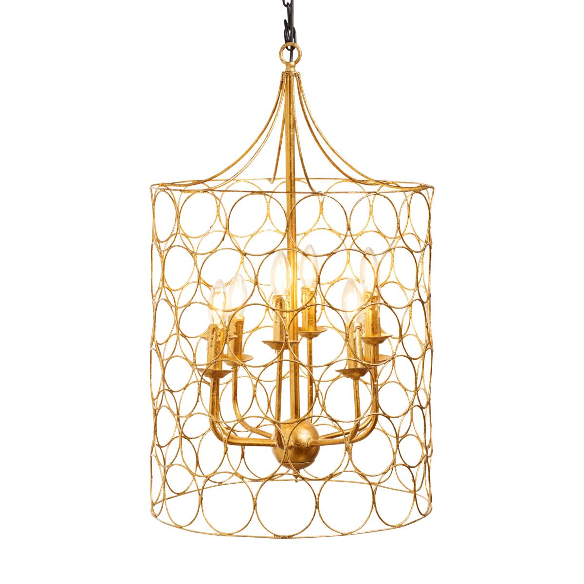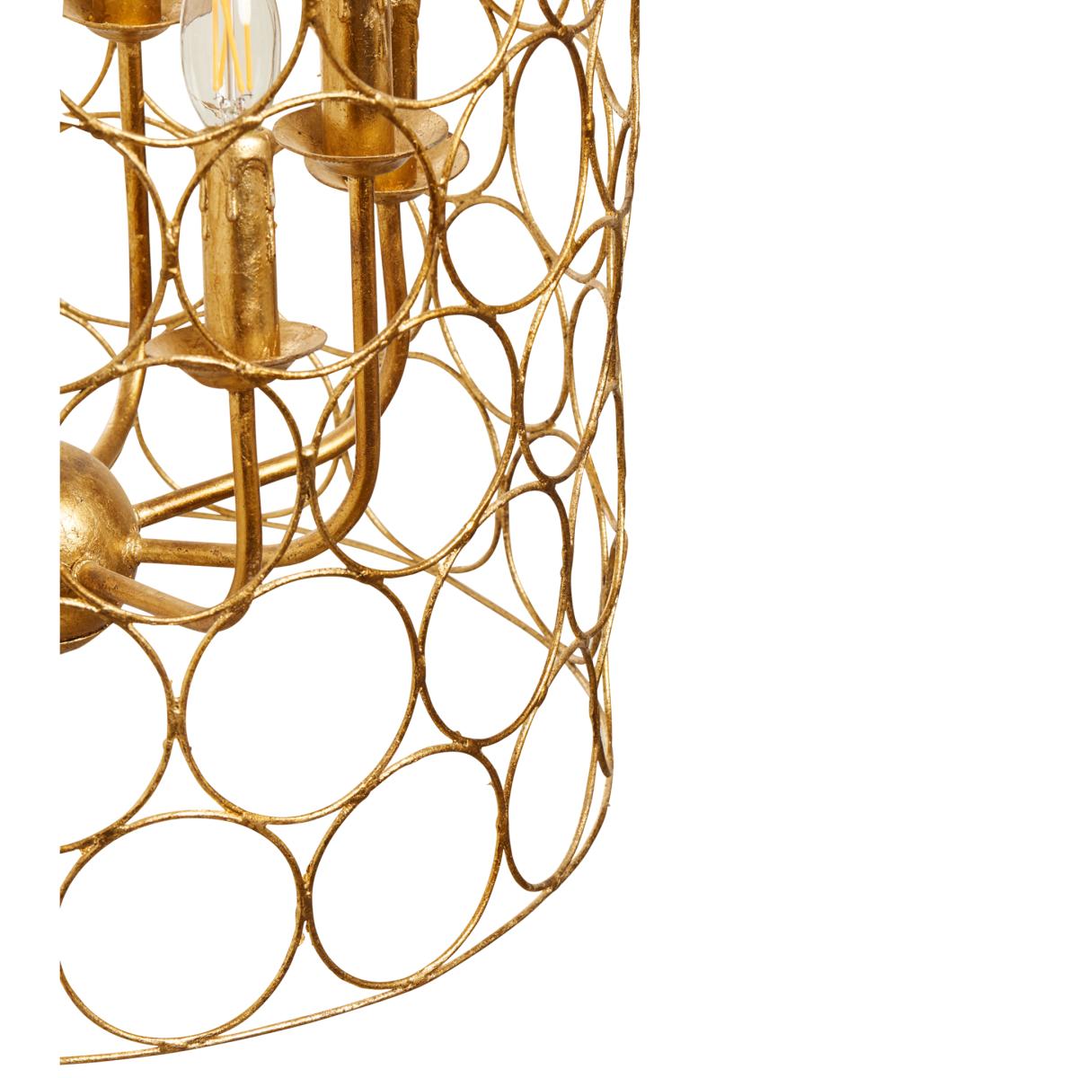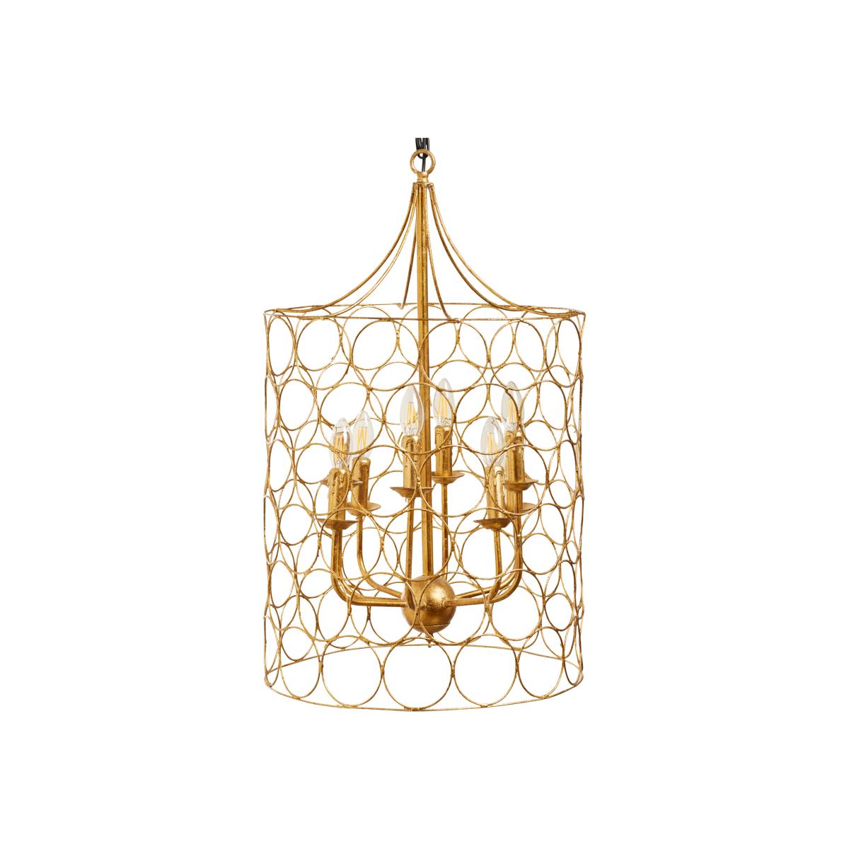 A traditional hanging lamp with a modern twist, the Sylla Hanging Lamp features a chandelier that's encased in a cylinder of golden circles. The pendant light's design was inspired by a historical figure of the same name who won a huge amount of gold for the Roman Empire, as documented by the Roman author, Pliny the Elder.