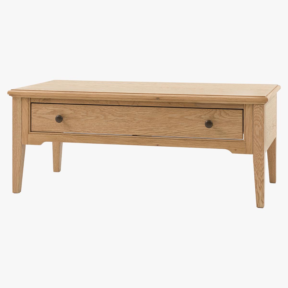 Crafted for homes that celebrate natural beauty, the Sylva range pairs timeless design with the warmth of solid wood. Each piece is thoughtfully made with a light oak finish, making it the perfect subtle piece that’s full of charm. Featuring a smooth-gliding drawer, this coffee table is perfect for keeping everyday essentials neatly within reach offering both style and practicality at the heart of your living space.
