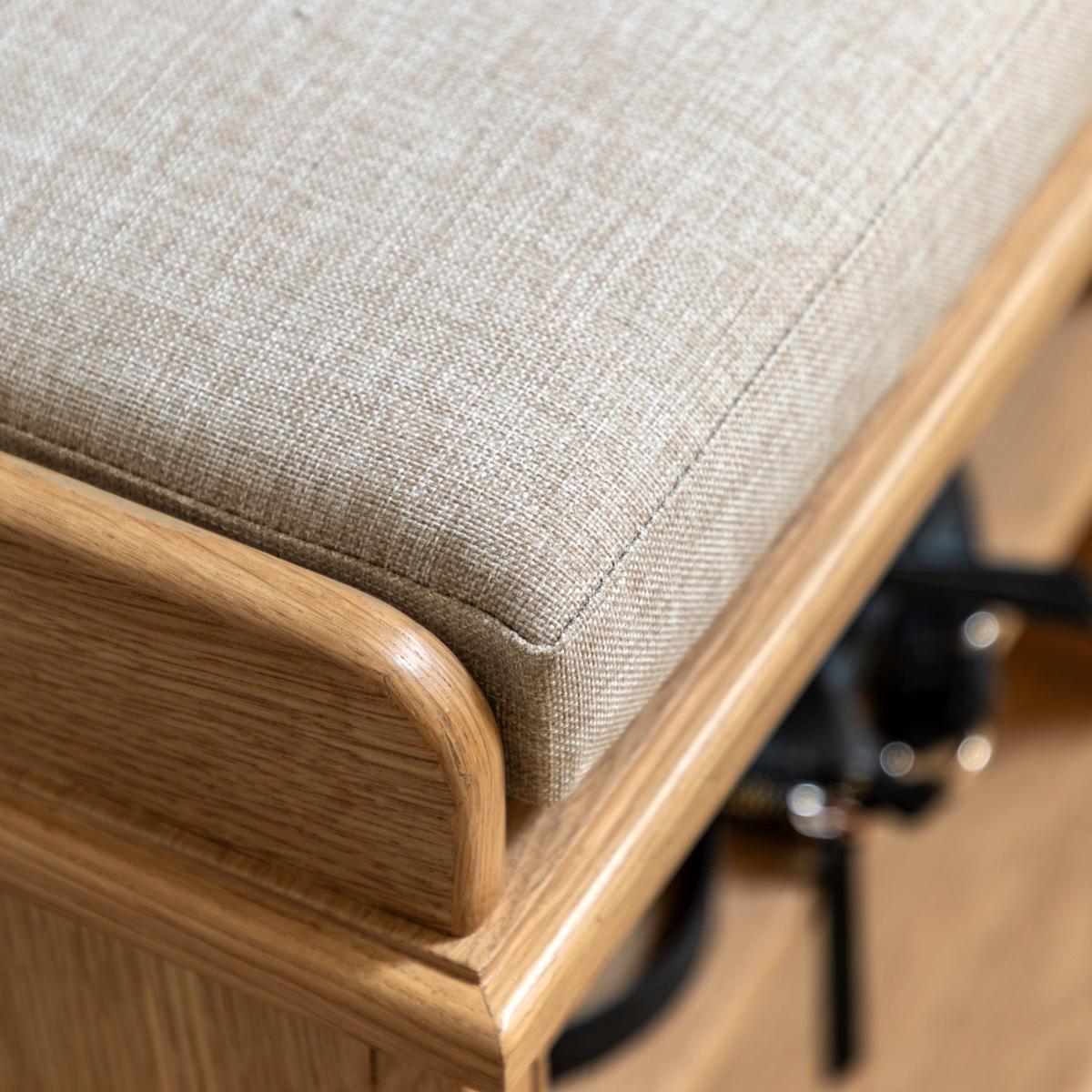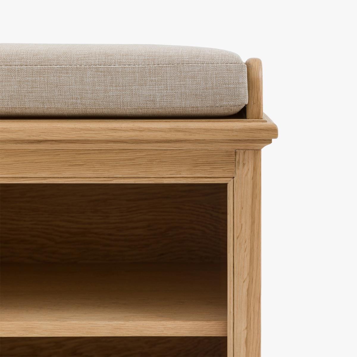 I love this bench for its functional yet timeless design, making it a versatile piece in both traditional and contemporary interiors. It’s great in mudrooms or hallways, offering ample storage with its open compartments, while the upholstered top adds comfort for sitting. Styling tips include pairing it with cosy cushions or throws to soften the natural wood, or placing baskets in the compartments for organisation. The neutral tones mean it works well with a variety of colour palettes, and it can be styled as a statement piece in an entryway or even used as a focus in a lounge corner. Its simplicity makes it easy to incorporate into various schemes, adding both practicality and understated style.