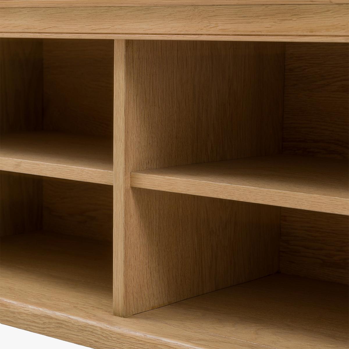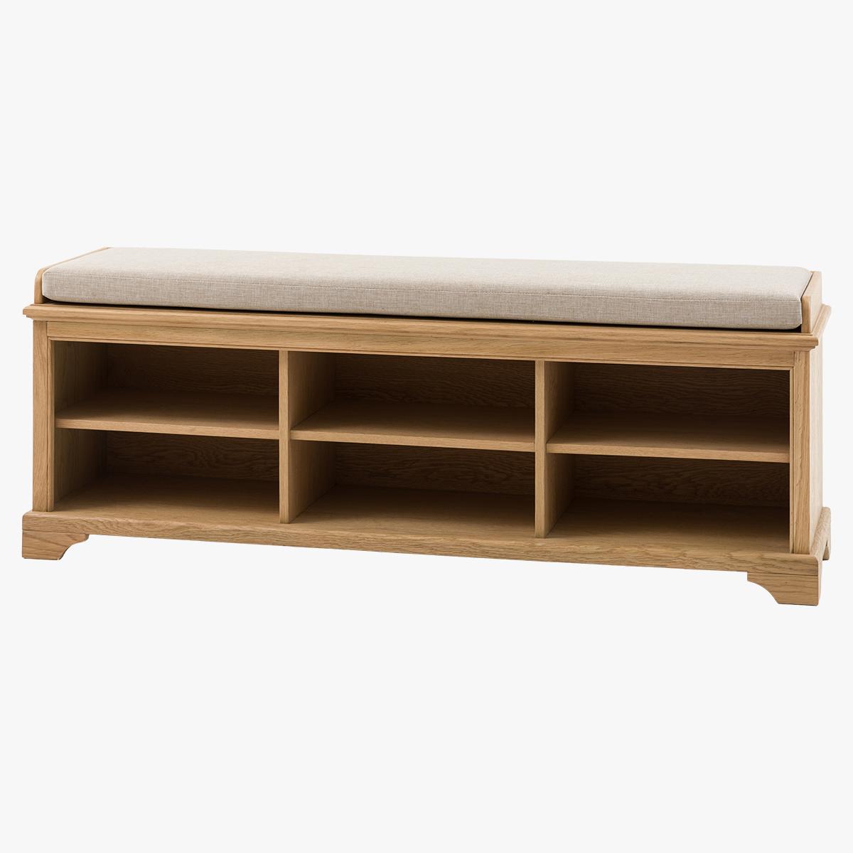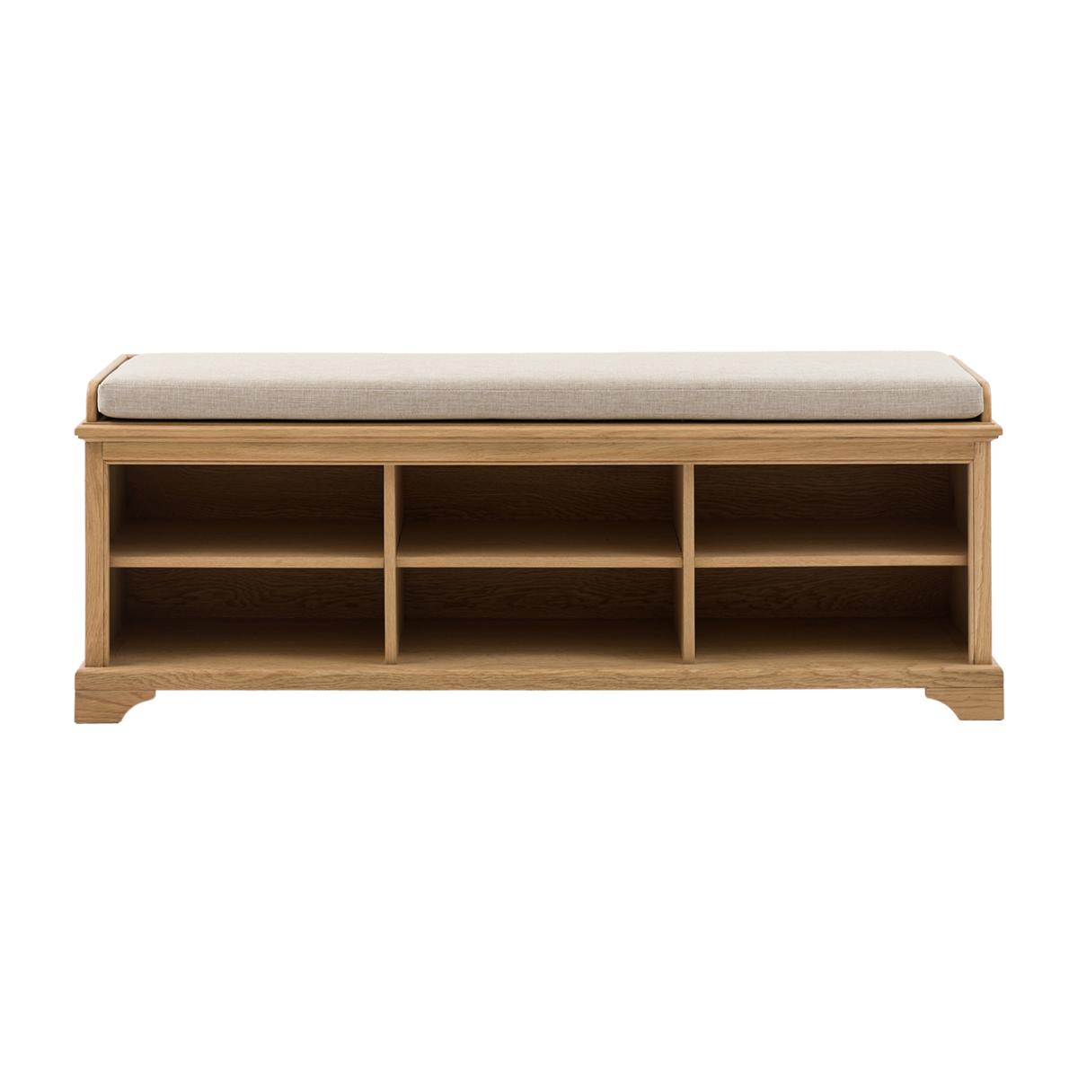 Crafted for homes that celebrate natural beauty, the Sylva range pairs timeless design with the warmth of solid wood. Each piece is thoughtfully made with a light oak finish, making it the perfect subtle piece that’s full of charm. This hallway bench combines style and practicality, featuring a soft cushioned seat and six spacious compartments underneath, perfect for storing shoes or baskets to keep your hallway neat and tidy.