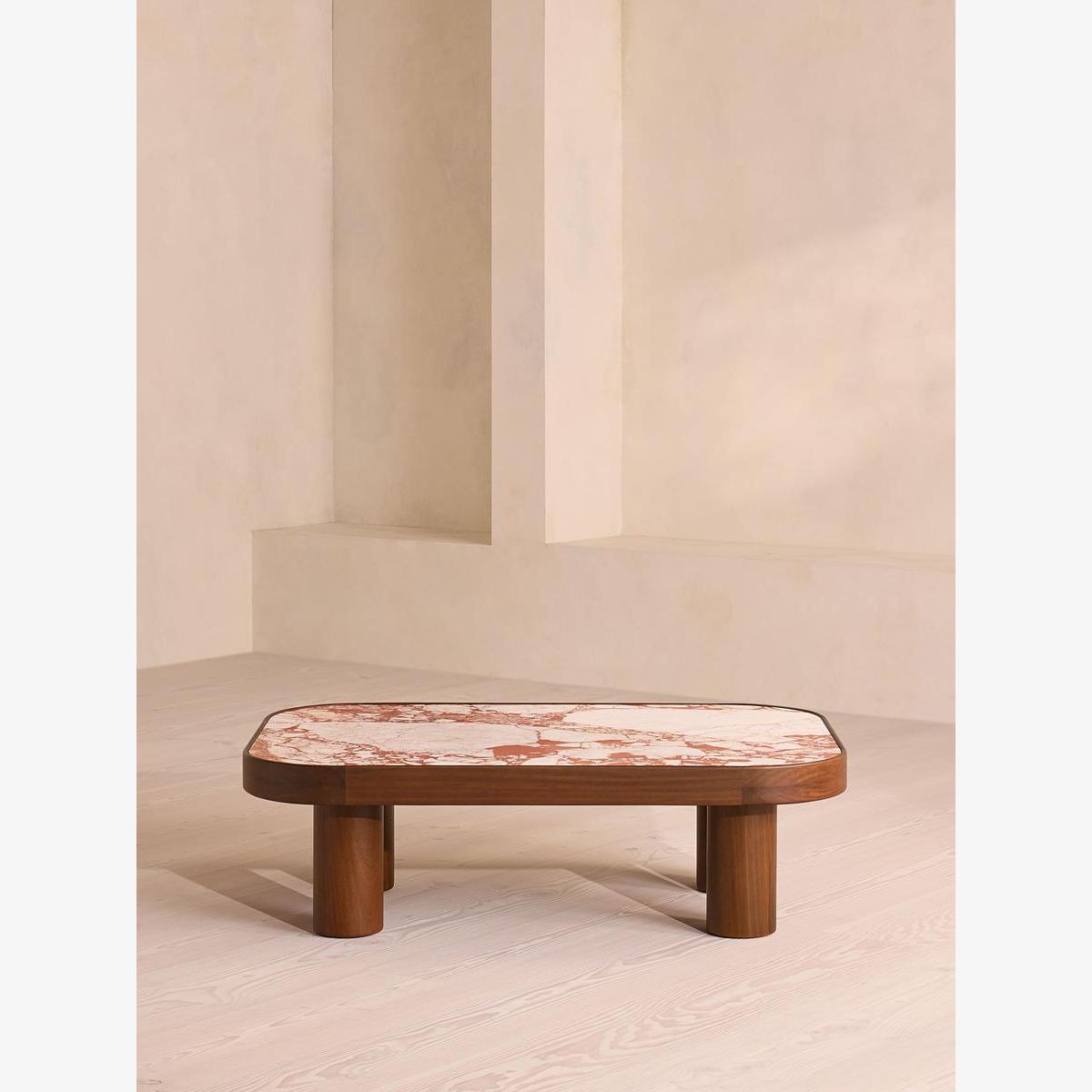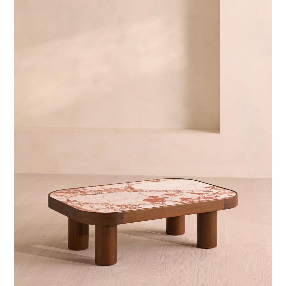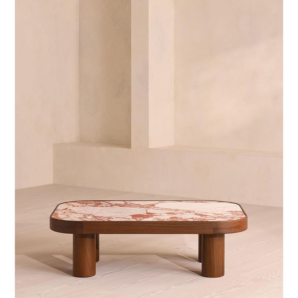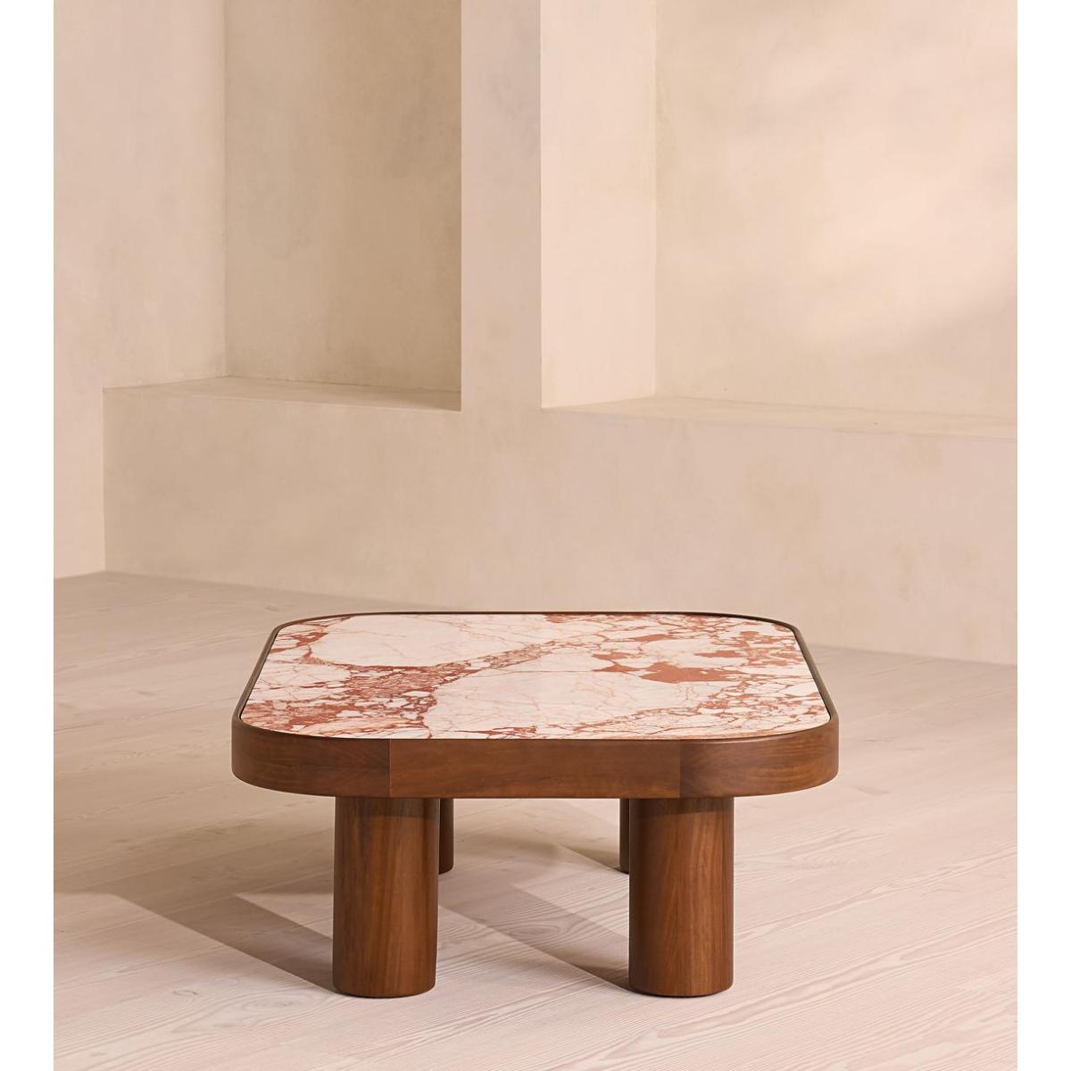 Natural veining across an inset marble top makes each piece completely unique. The four cylindrical legs and rounded rectangular top of our Sylvan coffee table are crafted from durable iroko wood. The wood's dark stain is complemented by a deeply coloured Red Bulgari marble top, characterised by distinctive natural veining.