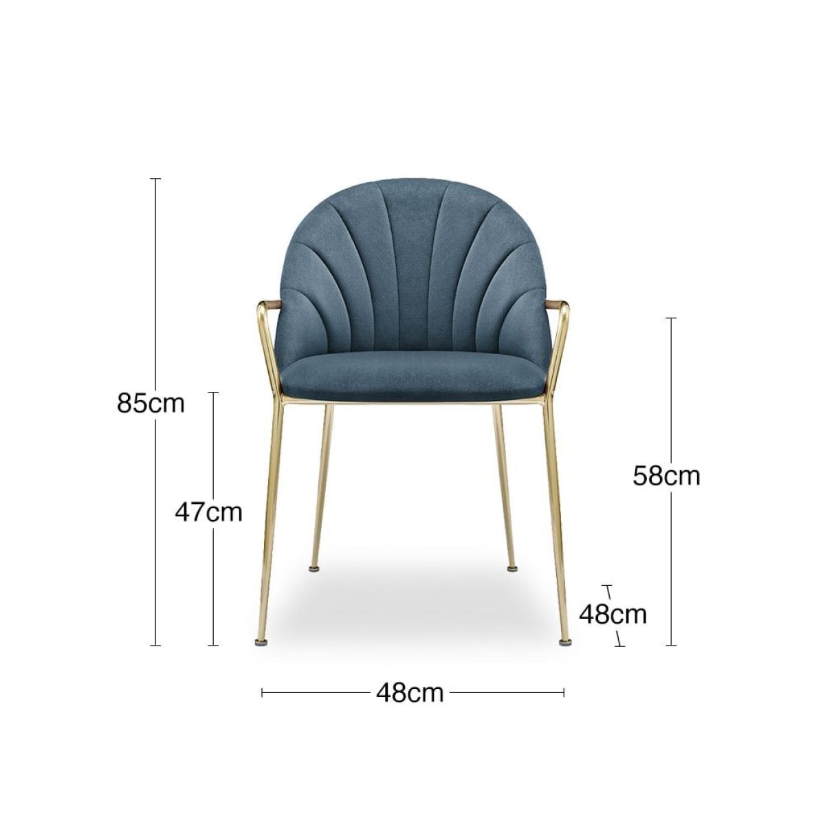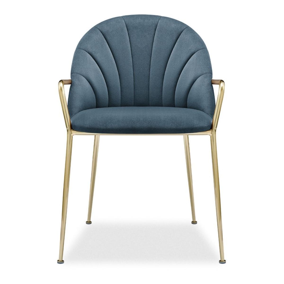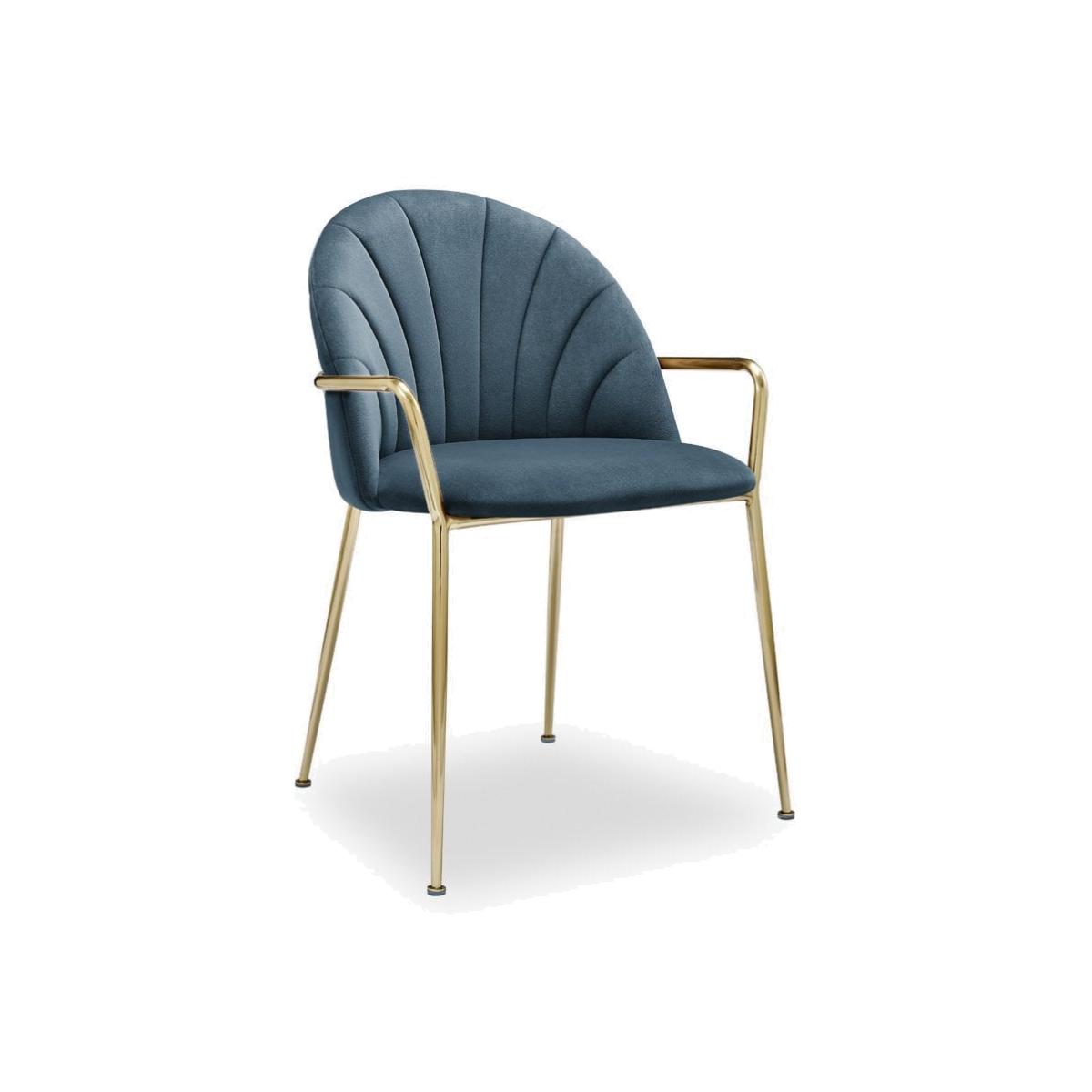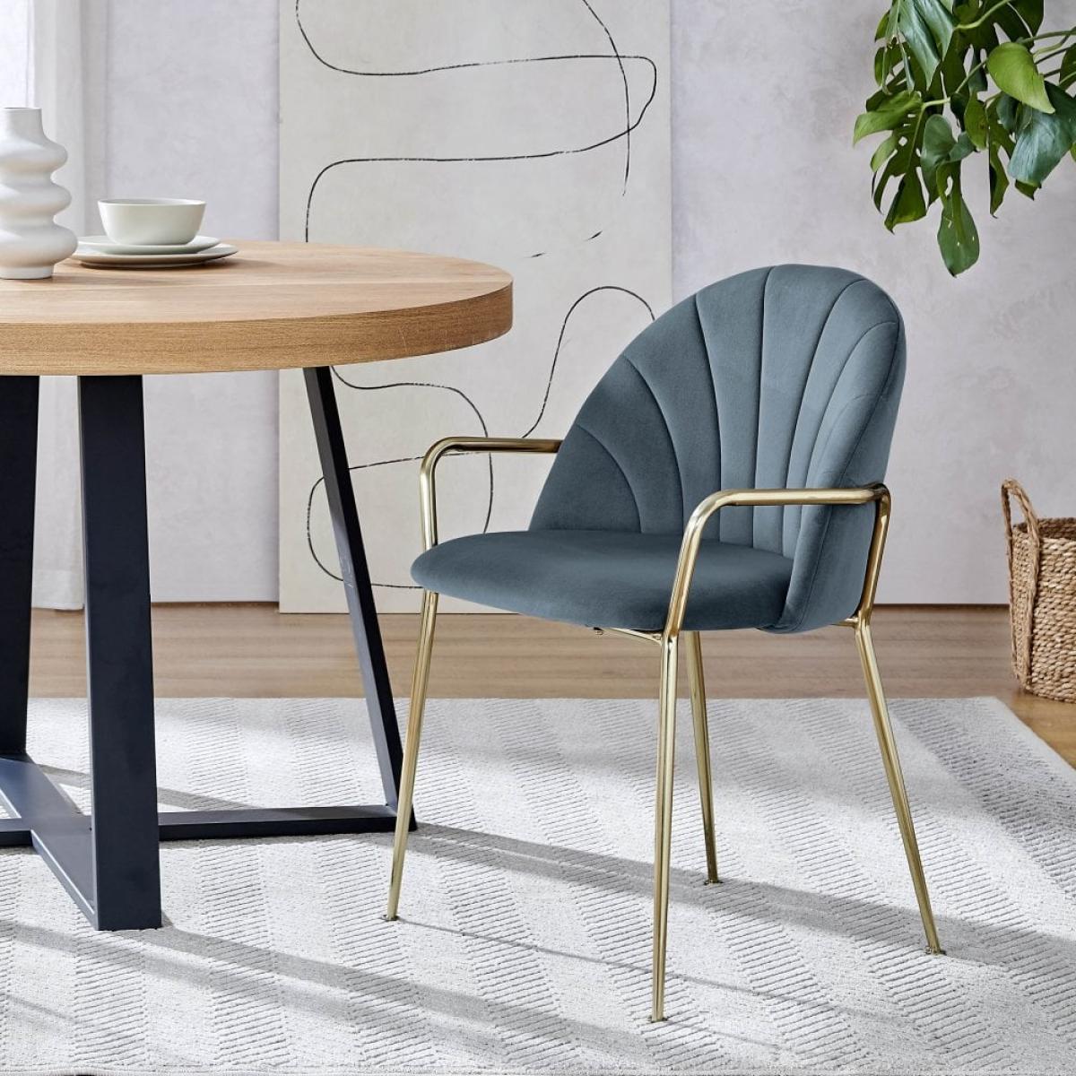 I love this one because it blends classic elegance with modern tactility. The Dust Blue recycled velvet fabric adds a touch of colour without overpowering a space, making it versatile for both contemporary and vintage-inspired interiors. The curved back offers comfort while the gold-toned metal legs and armrests lend a subtle glamour, perfect for a sophisticated dining room or even a stylish home office. For styling, try pairing it with a natural wood or marble table to highlight its elegant materials, and consider layering with textured textiles or muted patterns to create a balanced, inviting look. It works particularly well in spaces that celebrate eco-conscious choices, giving a thoughtful update to traditional dining set-ups.