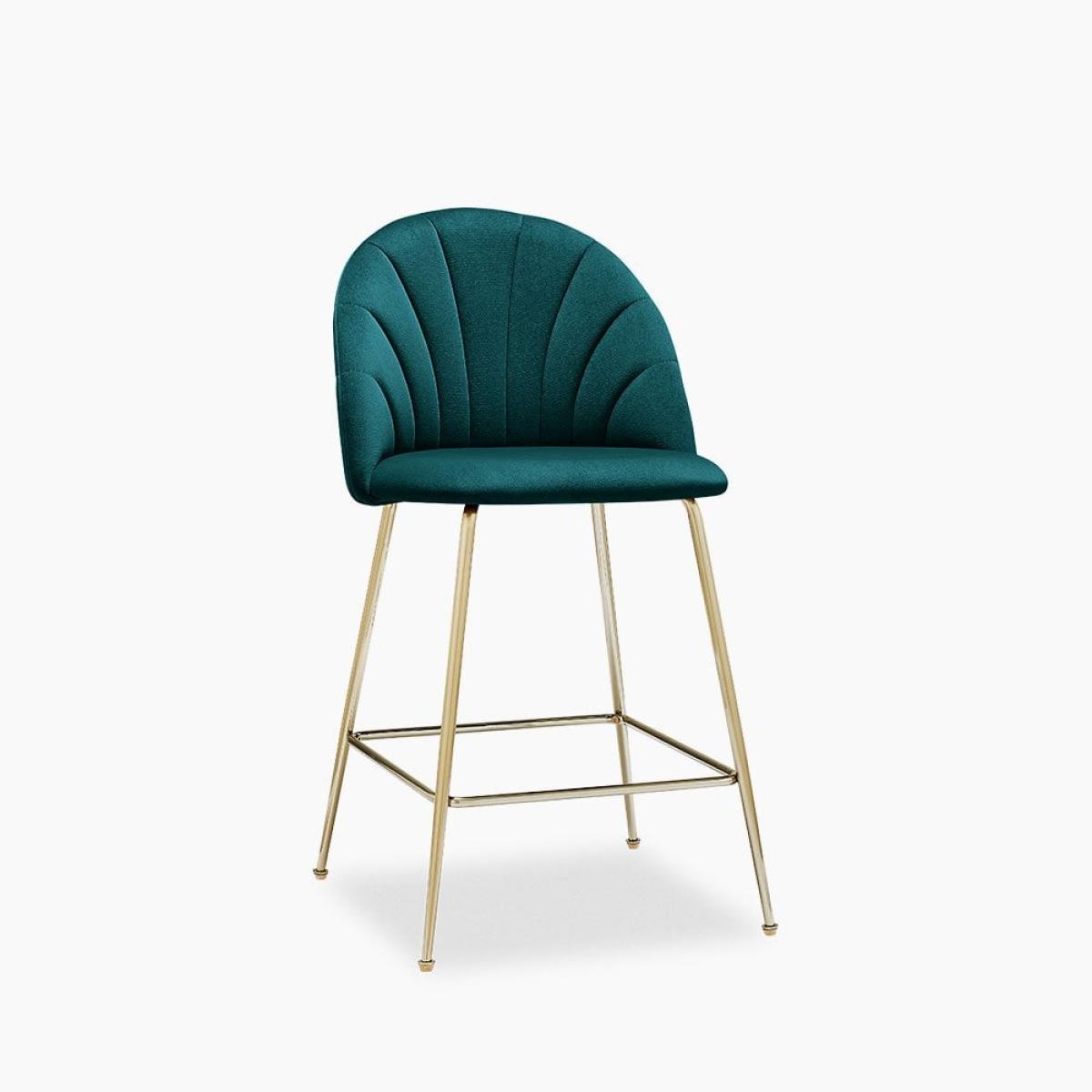 Introducing the Sylvia kitchen stool. This art deco design features a comfortable curved back that perfectly shapes the body with retro fan stitched design. In soft teal sustainable velvet and brass metal legs with a built-in footrest for maximum comfort, the Sylvia adds a sleek touch to your kitchen island. For a rich depth of colour and unique softness, our velvet used in this product is not only of the highest quality but it is made from 100% recycled PET yarns so it is kinder to the environment too. View The Sylvia Range