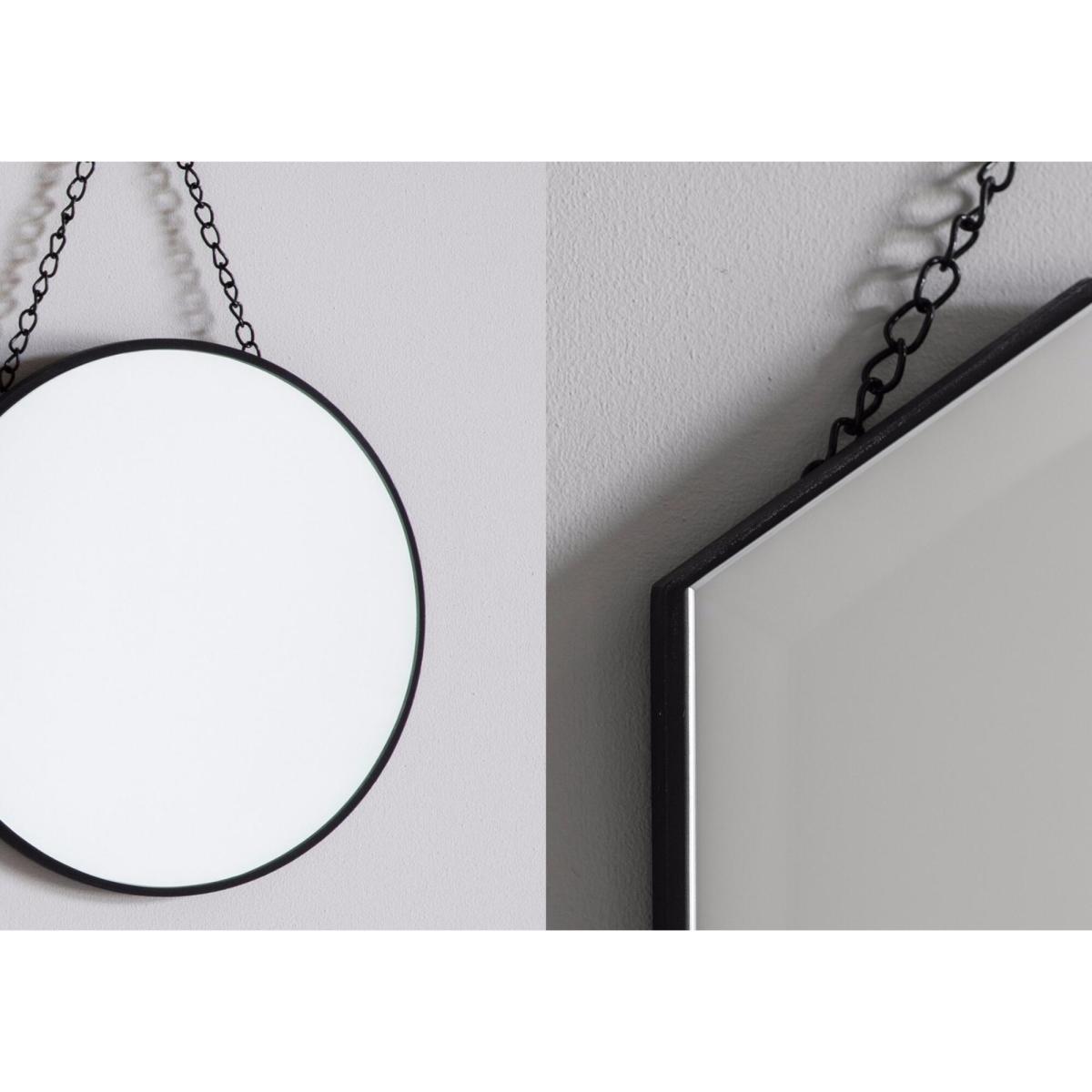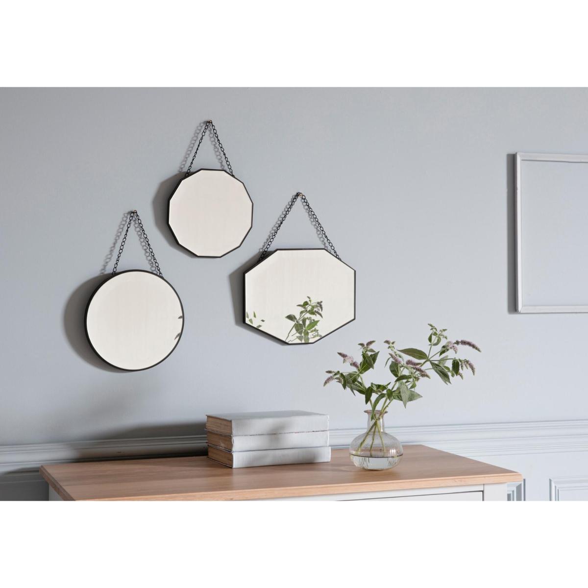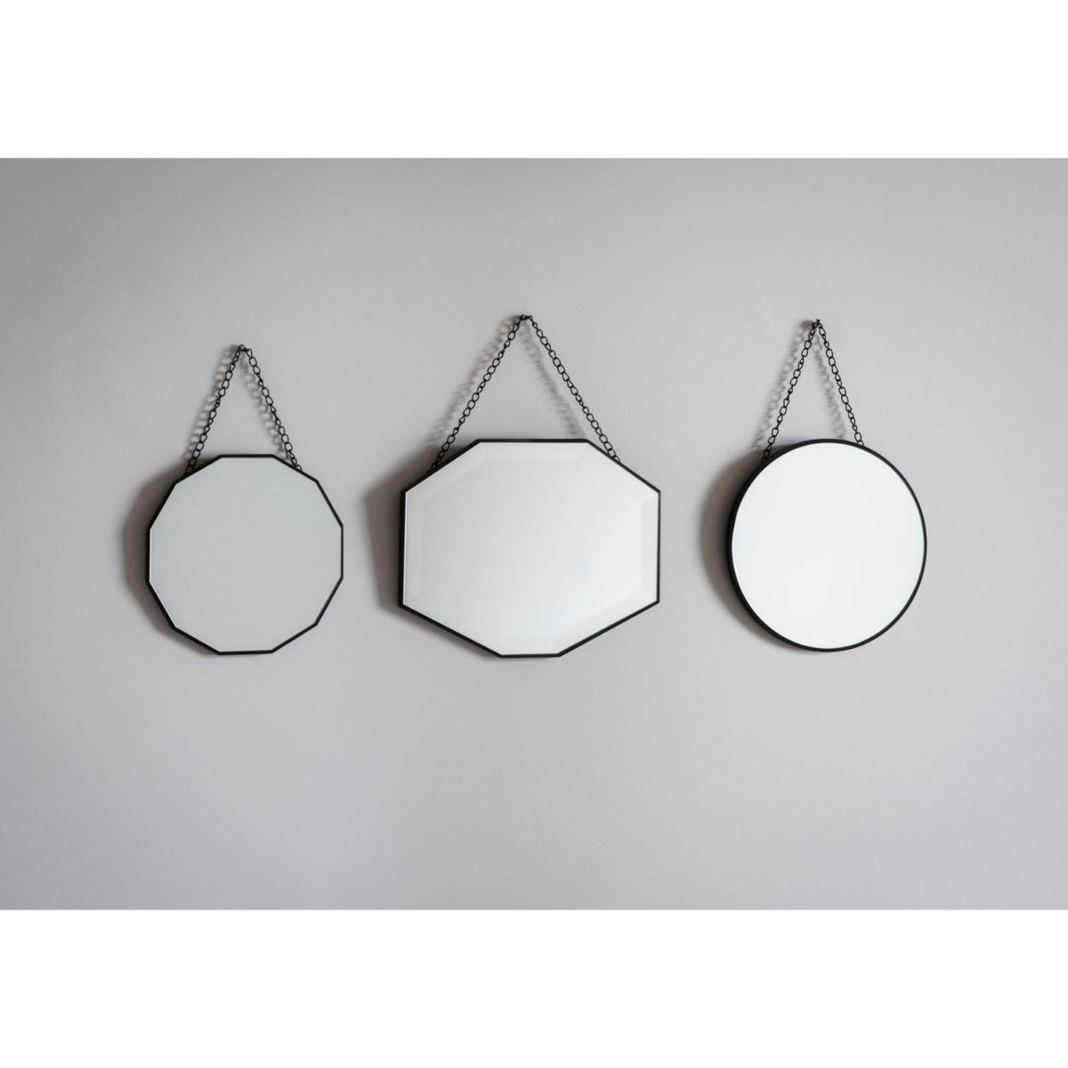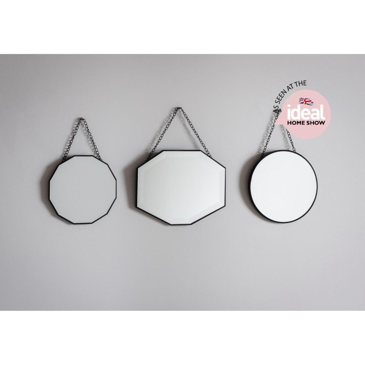 In various shapes and sizes this is a fun set for the more adventurous home-decorator. These three mirrors hang on matt black chains giving them a hint of the industrial. Mix and match to your heart's content.