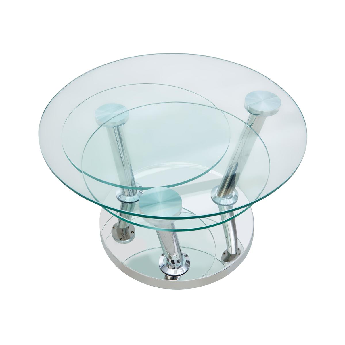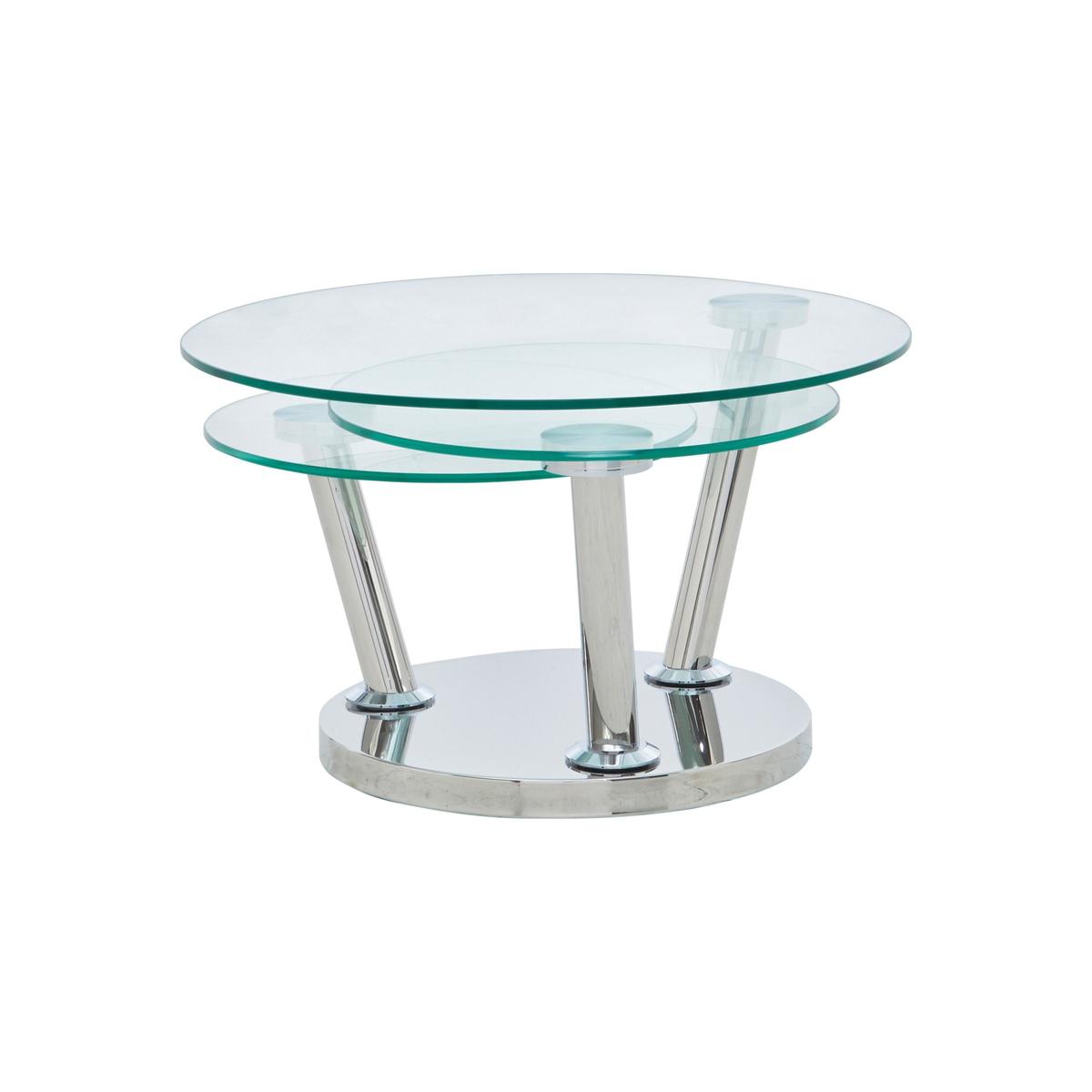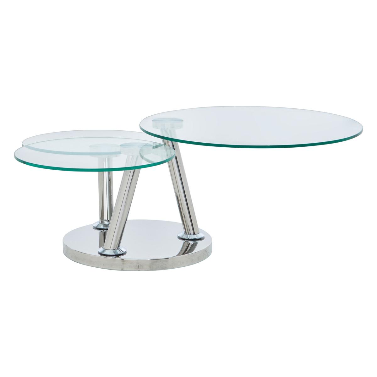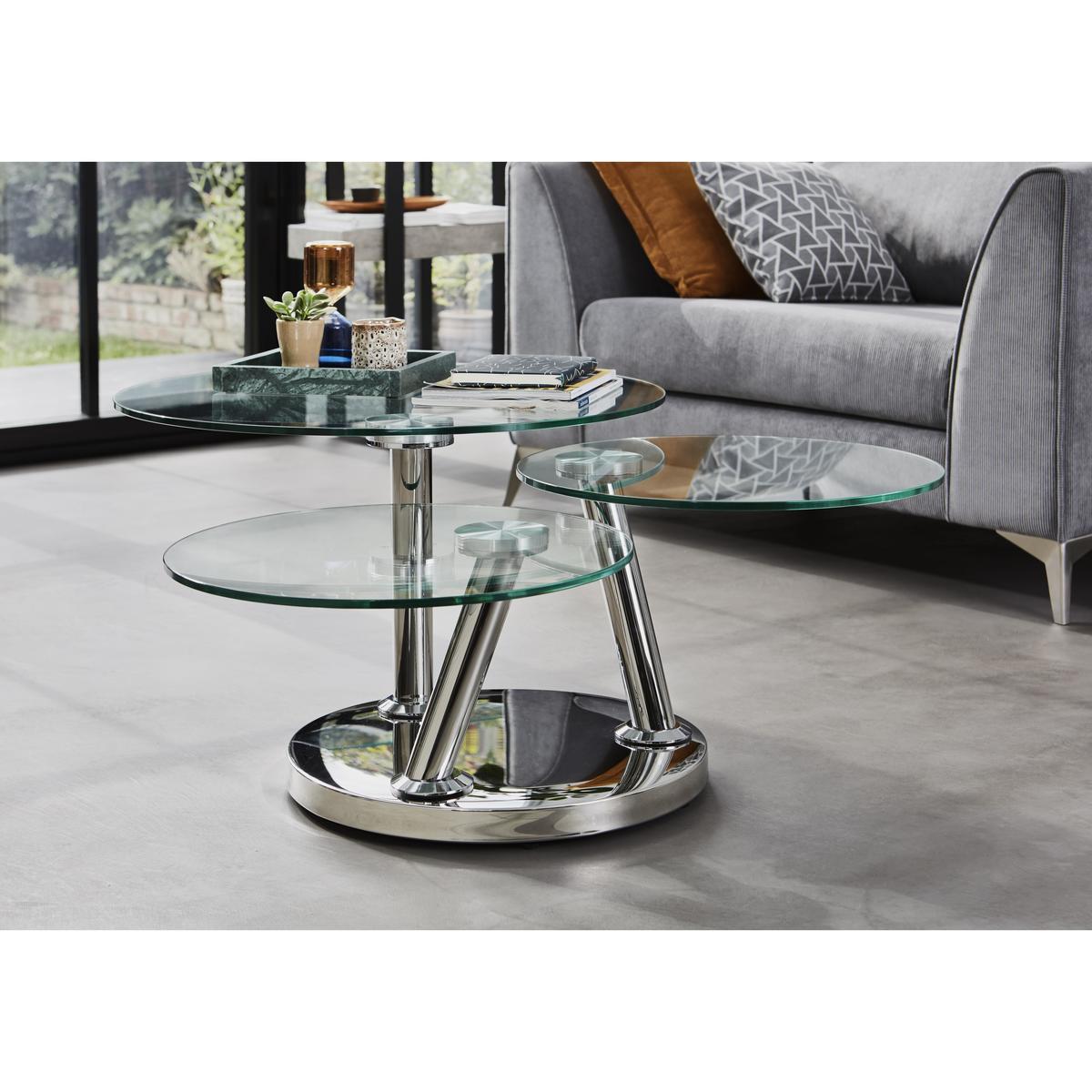Contemporary compact occasional furniture with a sculptural look Three- tier coffee table has a unique swivel extension mechanism Stylish combination of polished stainless steel and toughened glass Sculptural, stylish and with a unique seamless swivel extension mechanism, the Synchro coffee table will take pride of place in any modern living room. Comprising a three- tiered table top arrangement, this contemporary coffee table is the perfect piece for a more compact space. Stacked one on top of the other, its three table tops take up only 73 cm of space. Simply rotate each table surface outward and youll enjoy up to 115 cm of useful occasional table space. And along with being practical, this three- way swivel mechanism a UK first is also ultra- stylish, perfectly complementing the tables high- end modern materials. The plinth and angled pedestal supports are made of polished stainless steel, and the top is easy- care 10 mm toughened glass. Available at a great- value price, the Synchro coffee table is part of the Synchro range of occasional furniture. The collection also includes a usefully compact lamp table. To avoid scratching the glass table top, we recommend using coasters and placemats at all times. Be sure to mop spills quickly, and avoid abrasive cloths and cleaning materials.