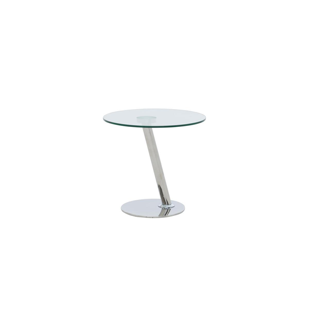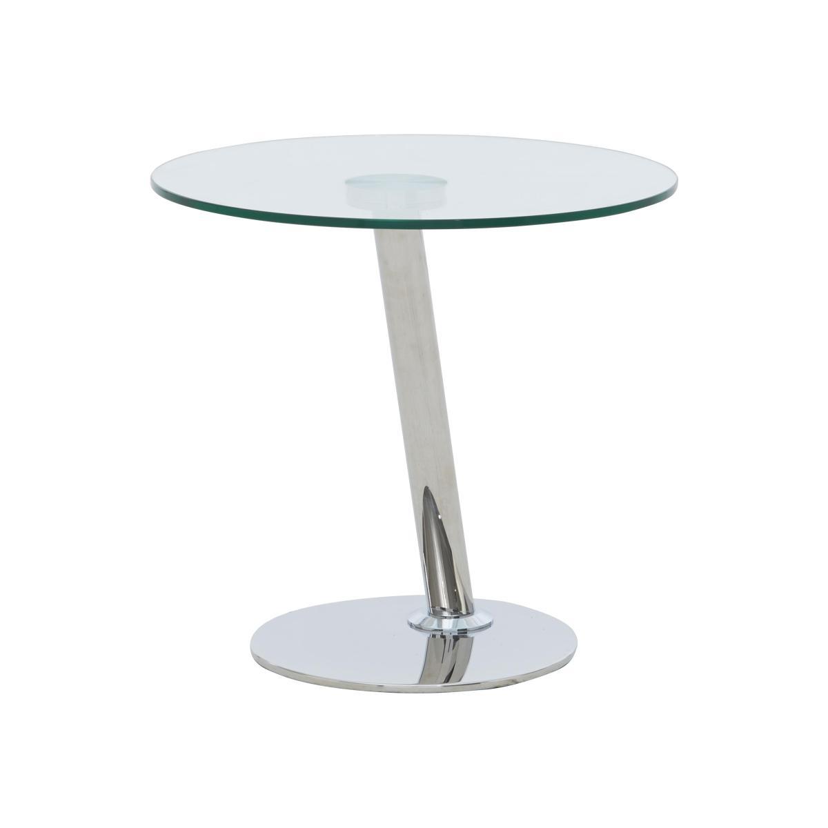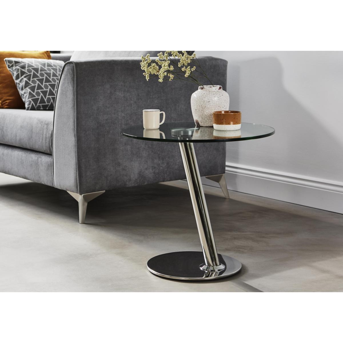 There’s nothing quite like the Synchro range of occasional furniture. Stylish and sculptural, the ultra-modern coffee table has a three-tier top – and features the UK’s first three-way extension mechanism. Rotate the table tops inwards to create a stacked arrangement that’s ideal for a more compact room, and then swivel each one outwards for three times the amount of surface space. Tables have polished stainless steel plinths and angled pedestal bases with 10 mm toughened glass tops. This great-value range also includes a lamp table. Contemporary compact occasional furniture with a sculptural look. Lamp table has a unique angled pedestal base. Stylish combination of polished stainless steel and toughened glass. Compact living room furniture just got more stylish. The Synchro lamp table is a fabulous fusion of polished stainless steel and 10 mm toughened glass, a combination that ensures that this occasional table is both practical and striking. With its sculptural lines – the circular plinth and angled pedestal base – this versatile table is the perfect surface for drinks and nibbles at a party or perhaps a stack of magazines. This great-value and well-made end table is part of the innovative Synchro range which also includes a striking three-tier coffee table with a unique swivelling extension mechanism. To avoid scratching the glass table top, we recommend using coasters and placemats at all times. Be sure to mop spills quickly, and avoid abrasive cloths and cleaning materials.