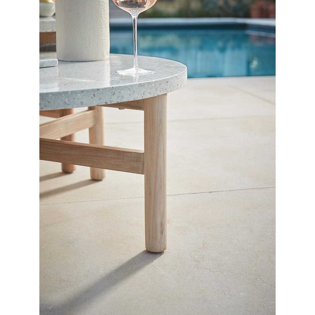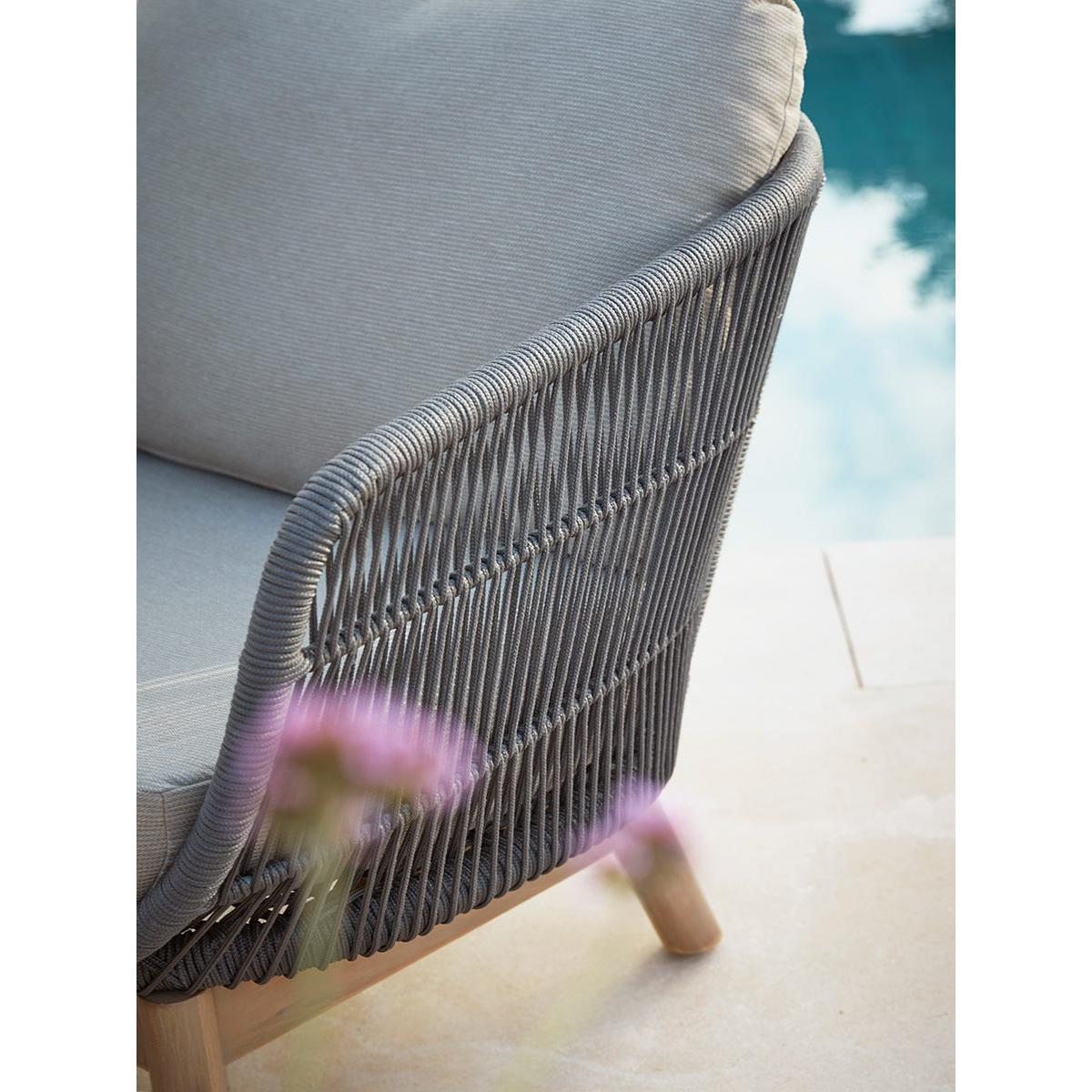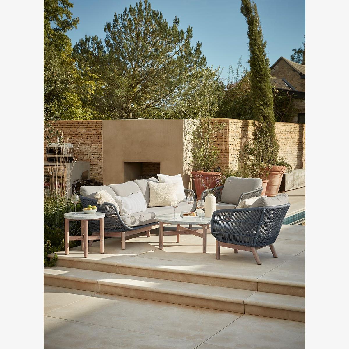 Sophisticated but comfortable, our Syros Lounge set is full of luxurious contemporary details. Featuring a welcoming arrangement of generously proportioned seating, the set includes a three seater outdoor sofa, two matching armchairs and one coffee and one side table leaving you with endless options to get the layout just perfect for your outdoor entertaining. The seats are formed from woven rope in a dark charcoal tone which contrasts effectively with the acacia wood legs and lighter coloured cushions. The round tables have the same acacia wood bases topped with statement terrazzo tops.