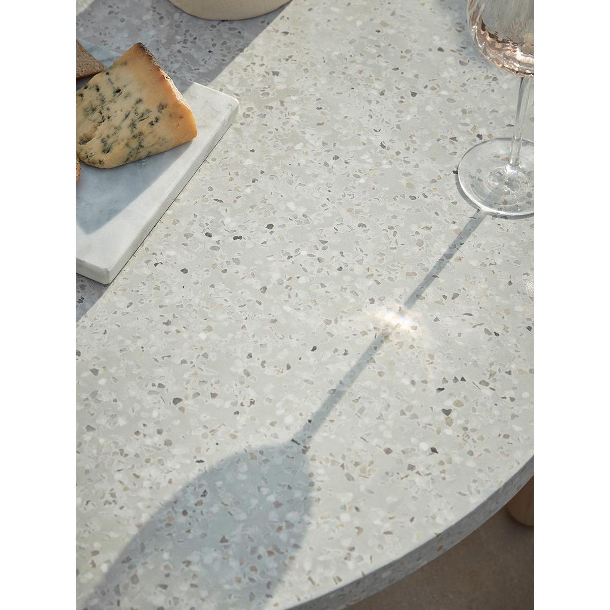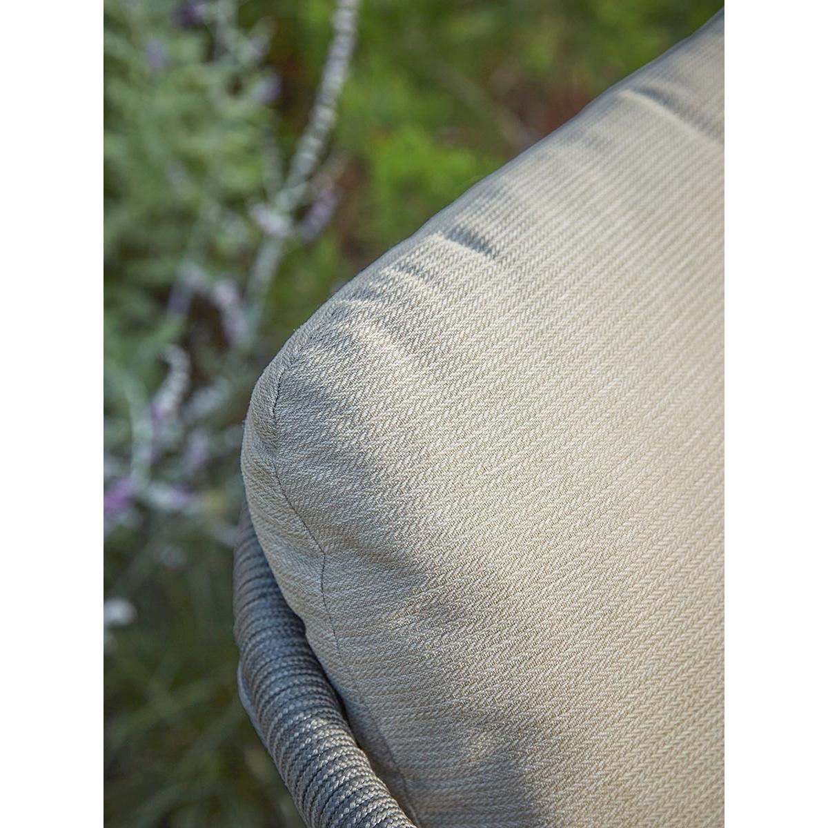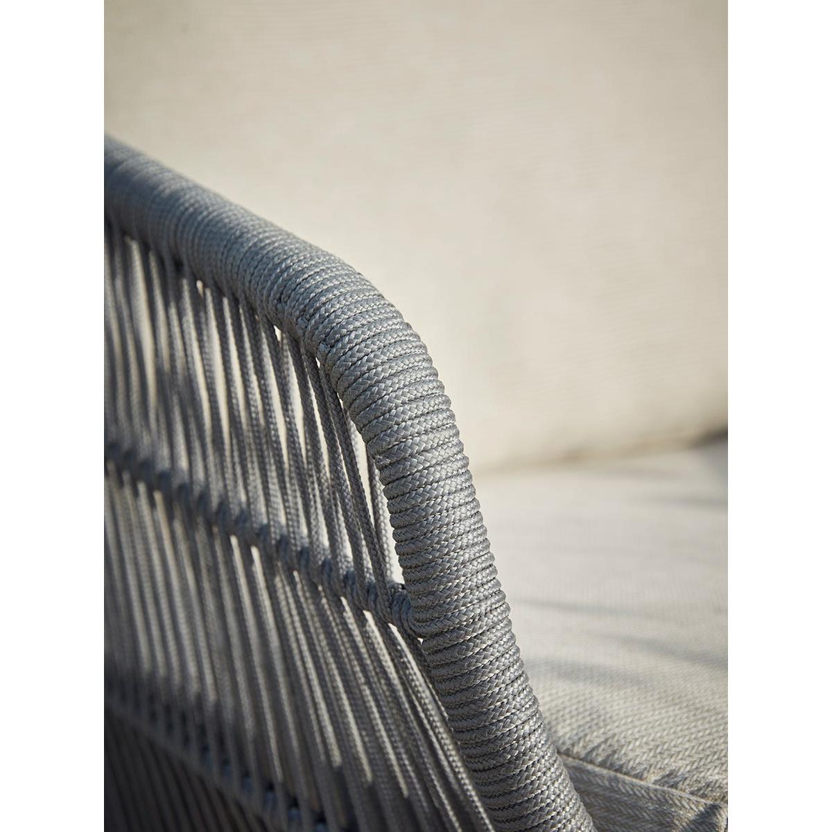 Sophisticated but comfortable, our Syros Lounge set is full of luxurious contemporary details. Featuring a welcoming arrangement of generously proportioned seating, the set includes a three seater outdoor sofa, two matching armchairs and one coffee and one side table leaving you with endless options to get the layout just perfect for your outdoor entertaining. The seats are formed from woven rope in a dark charcoal tone which contrasts effectively with the acacia wood legs and lighter coloured cushions. The round tables have the same acacia wood bases topped with statement terrazzo tops.