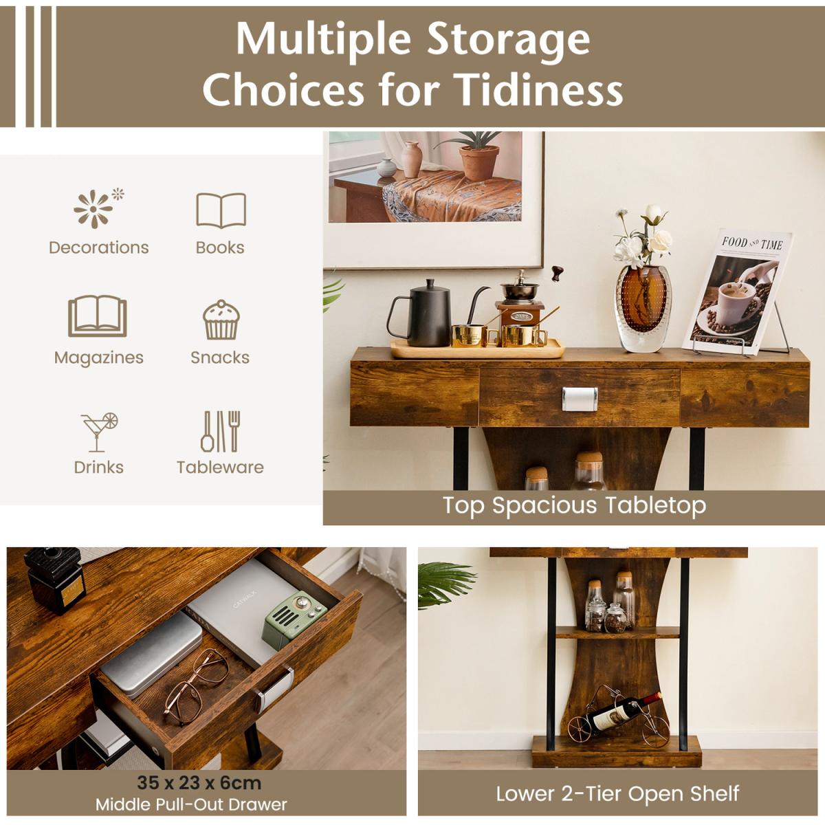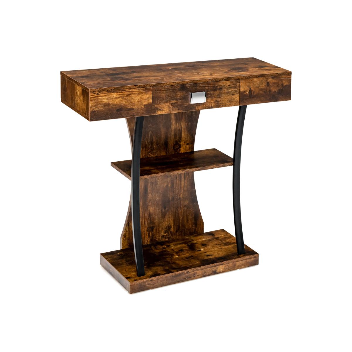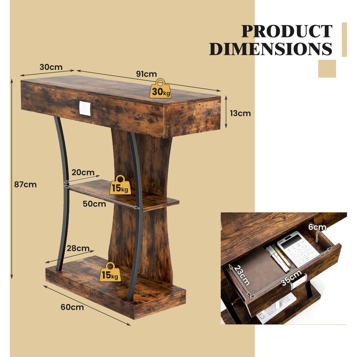 Use the console table to make full use of your home space!The foyer table has a wide tabletop and a 2-tier open shelf, ideal for collection display. Plus, its 35 x 23 x 6cm (L x W x H) drawer is also roomy for private storage. Thanks to its 2 anti-tipping kits, the console table will be firmly attached to the wall. Its60 x 28cm (L x W) base has a wide contact area with the ground for reliable support. Since T-shaped frame is relatively space-saving, you are able to add the entryway table to the living room, bedroom, dining room, etc. At the same time, its anti-slip pads are useful to avoid accidental scratches.