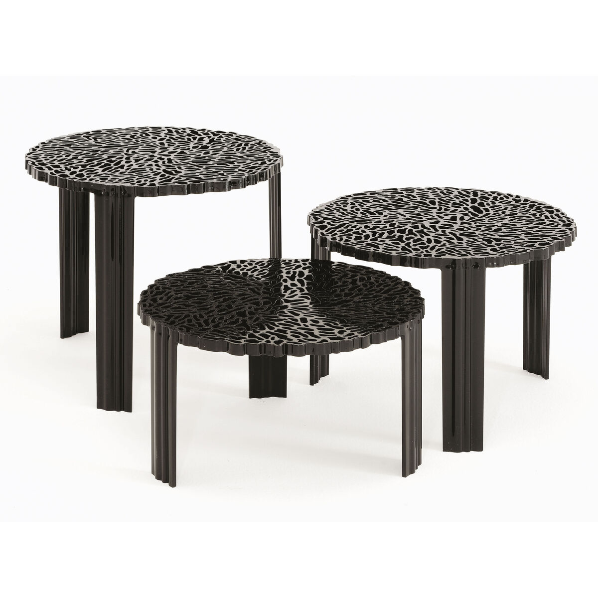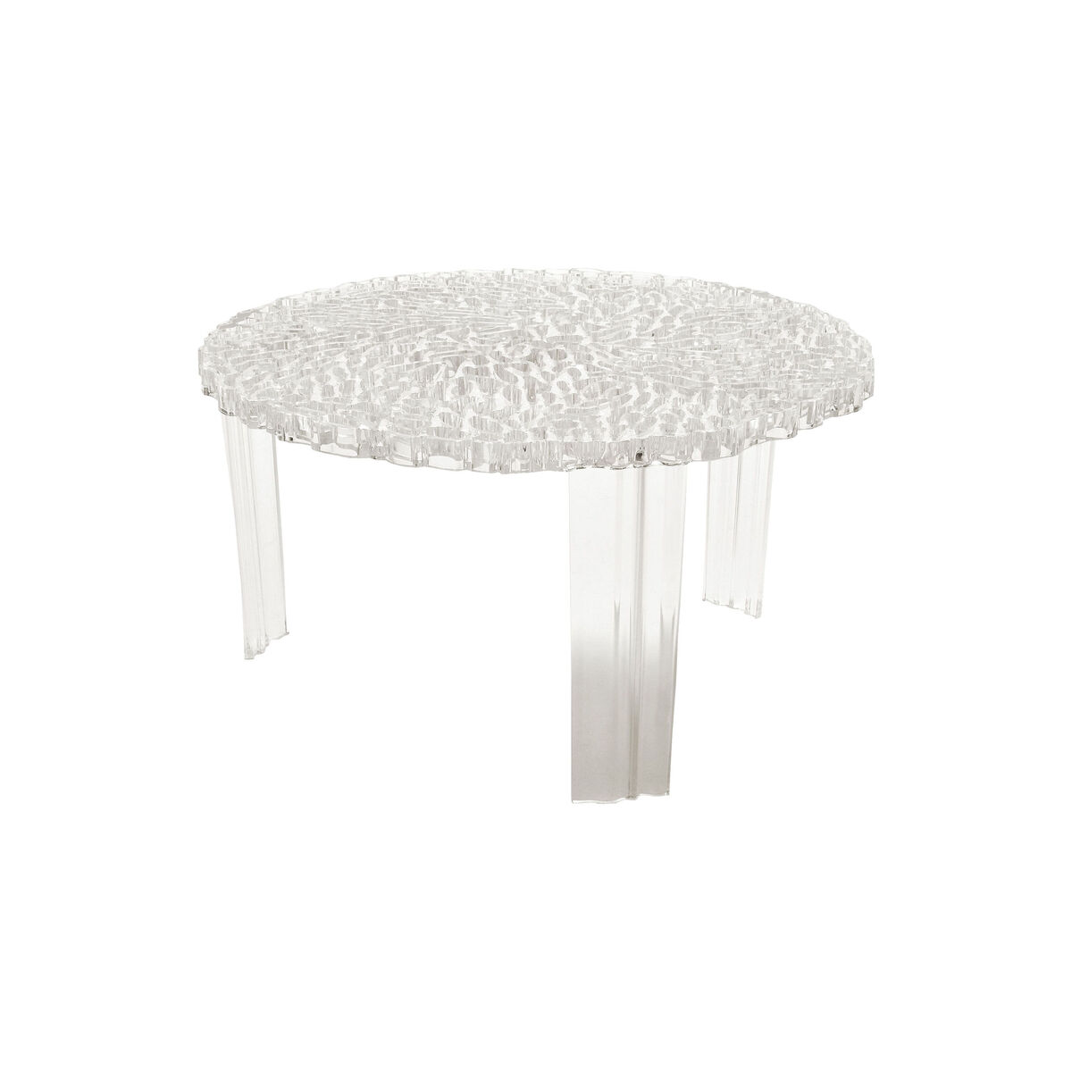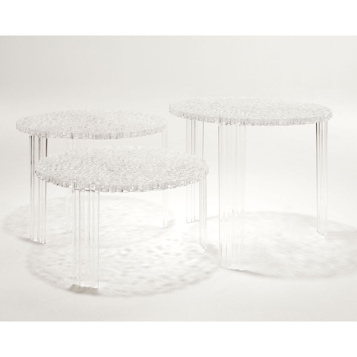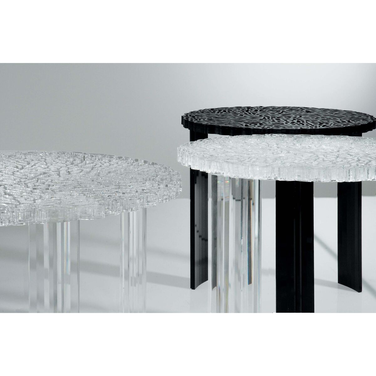 This line of tables originated from the creativity of Patricia Urquiola combined with Kartell's capability and technological know how. They resulted from the research into innovative surfaces to achieve new visual and tactile effects. The surface of the T-Table top alternates fullness and space to create an elegant and precious effect which is reminiscent of embroidery. This object expresses very poetic, feminine and extremely elegant born from technological research and experimentation. It's available in a clear transparent version and in coloured ones (orange, blue, amber, red and black) and it comes in three different heights. The diameter of the table top is 50 cm and the heights proposed are : 28 cm, 36 cm and 44 cm.